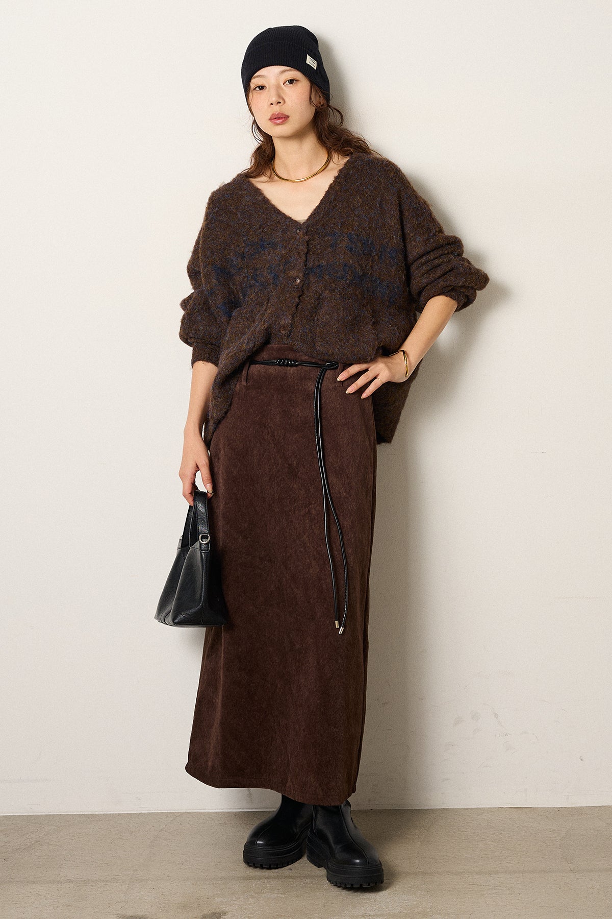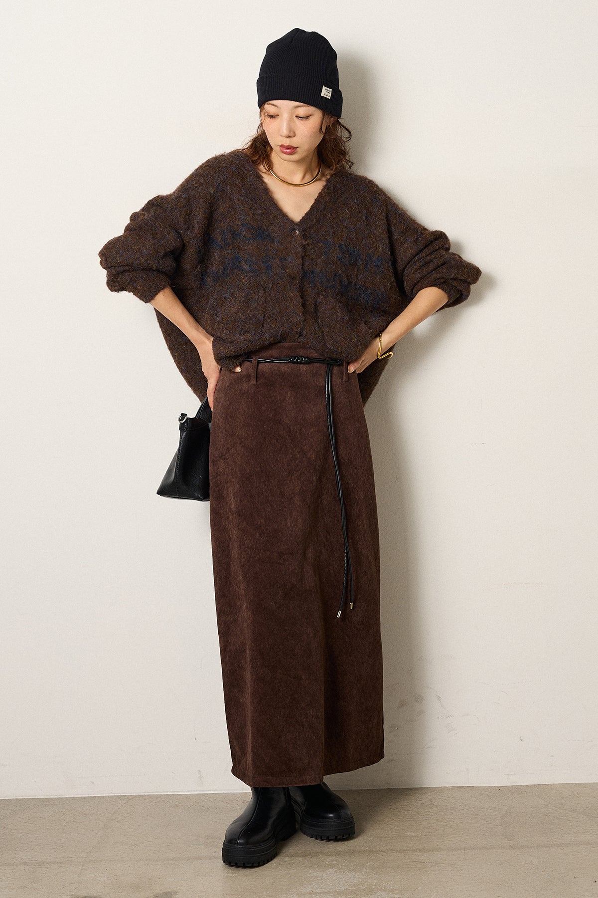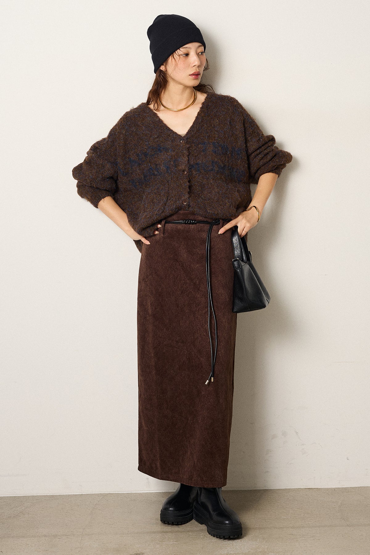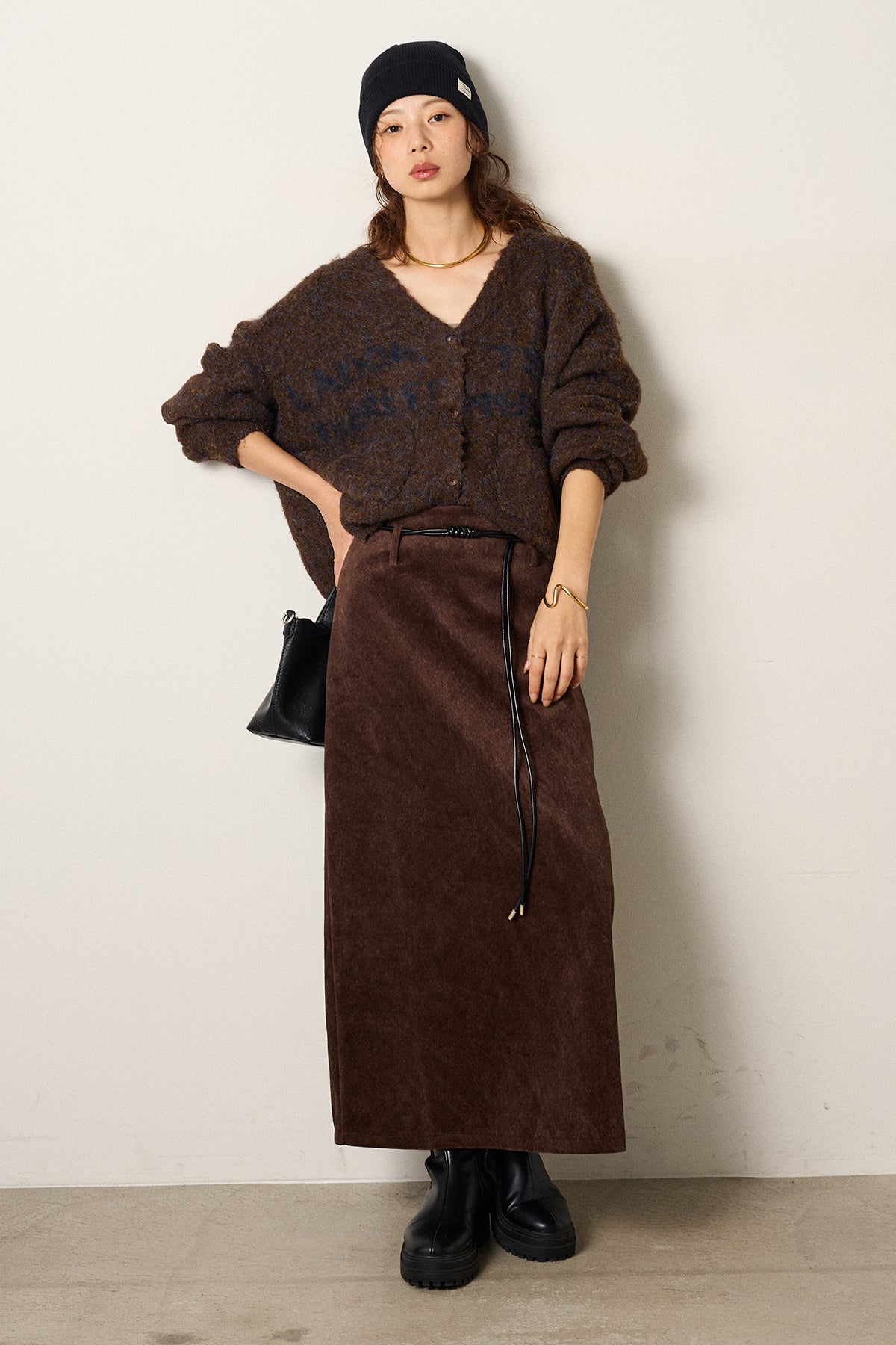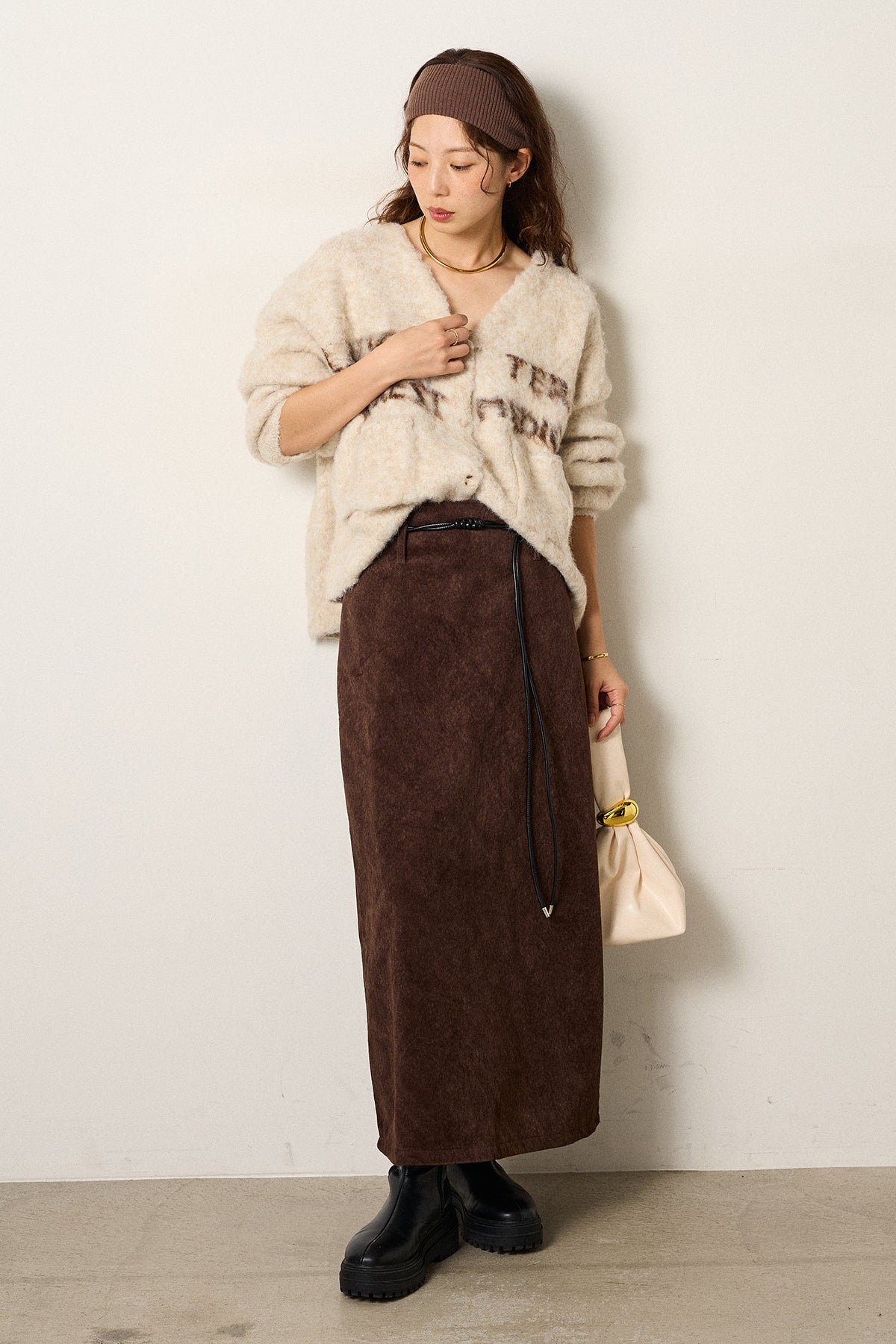 [SET]ウール混透かしロゴニットカーディガン+ロープベルト付きスウェード調スカート(2set)