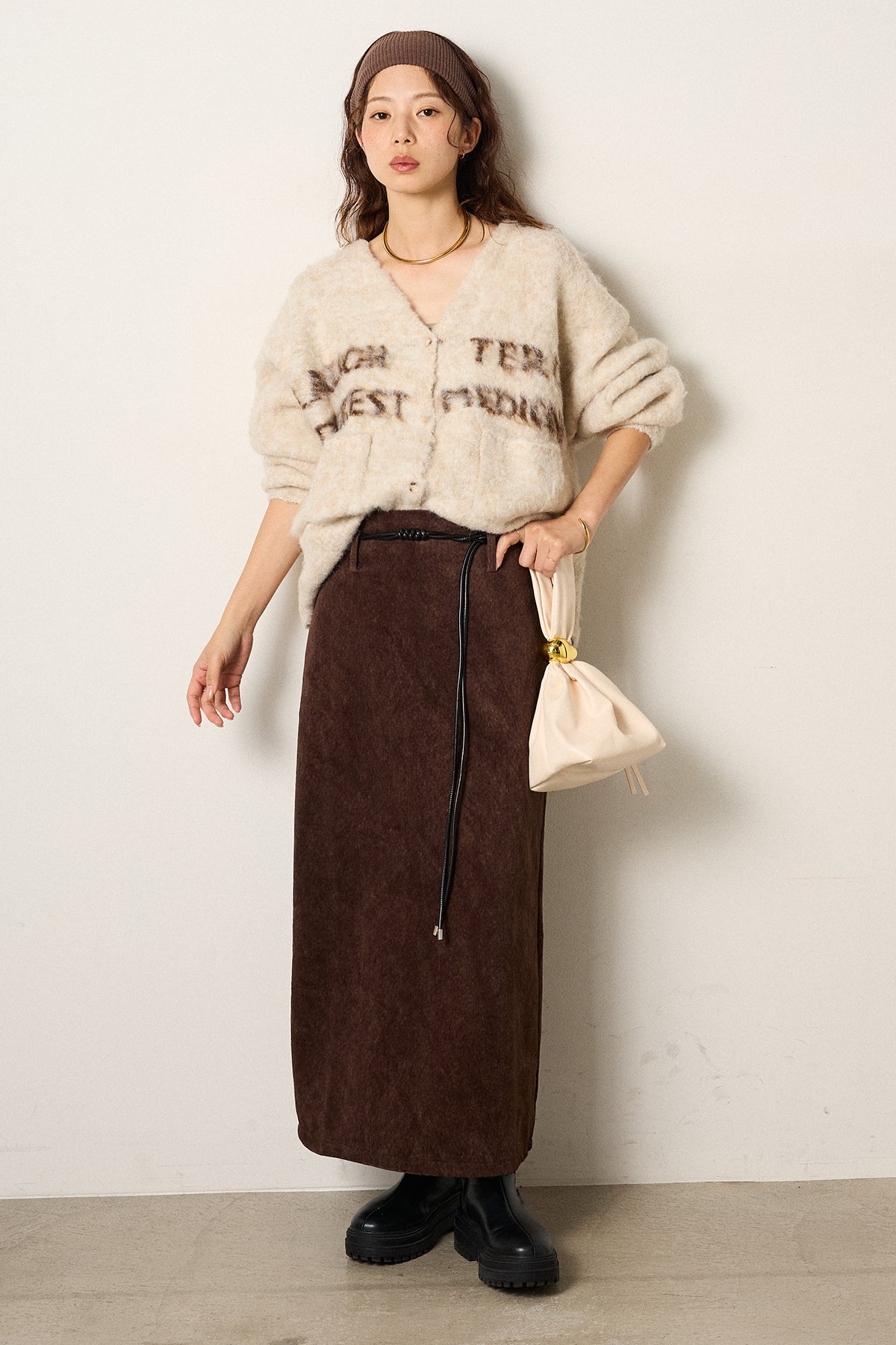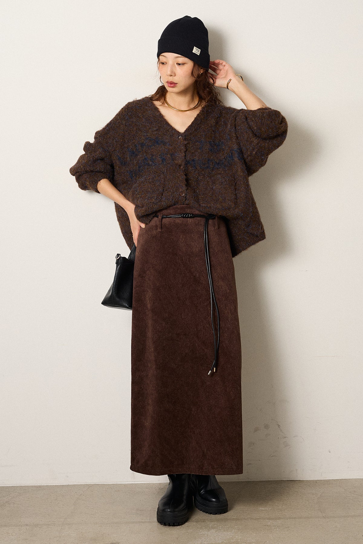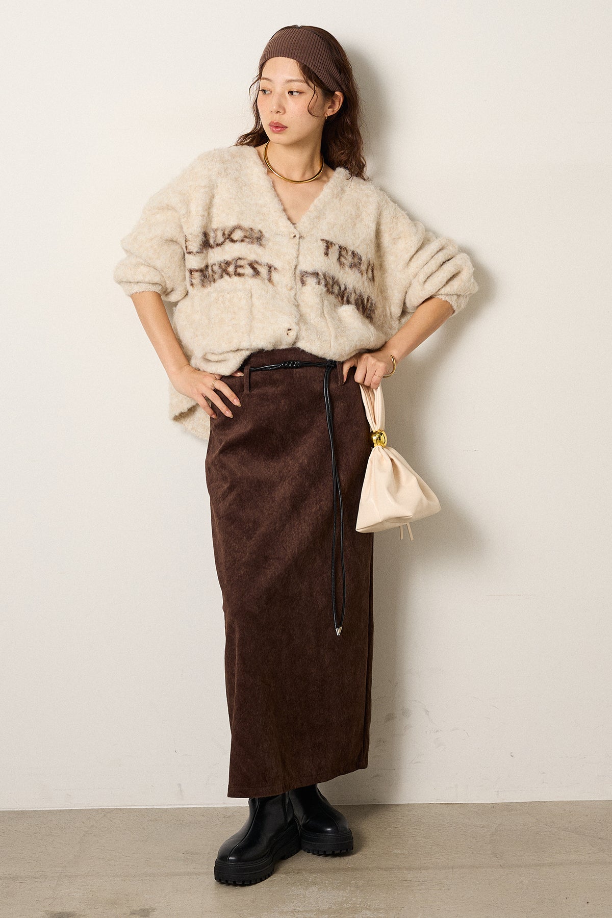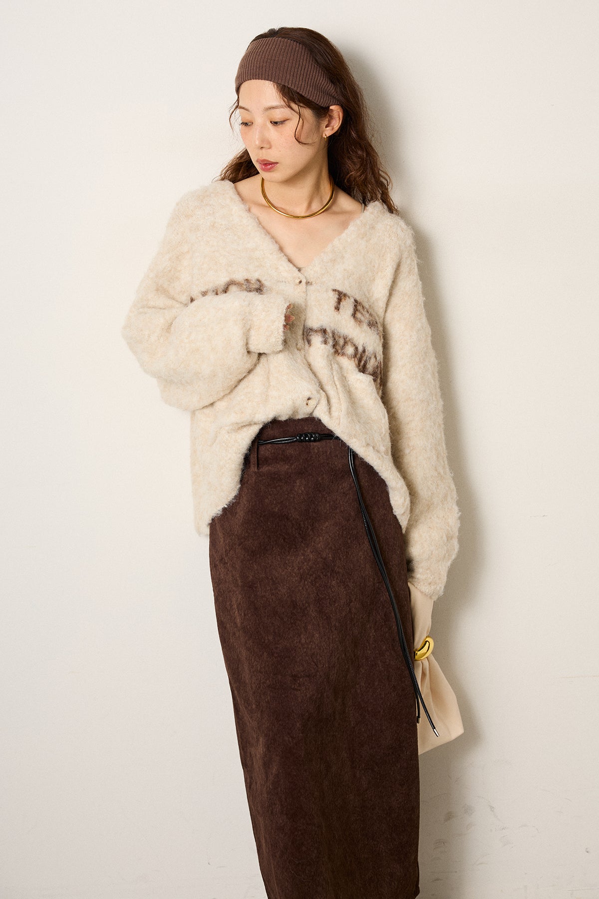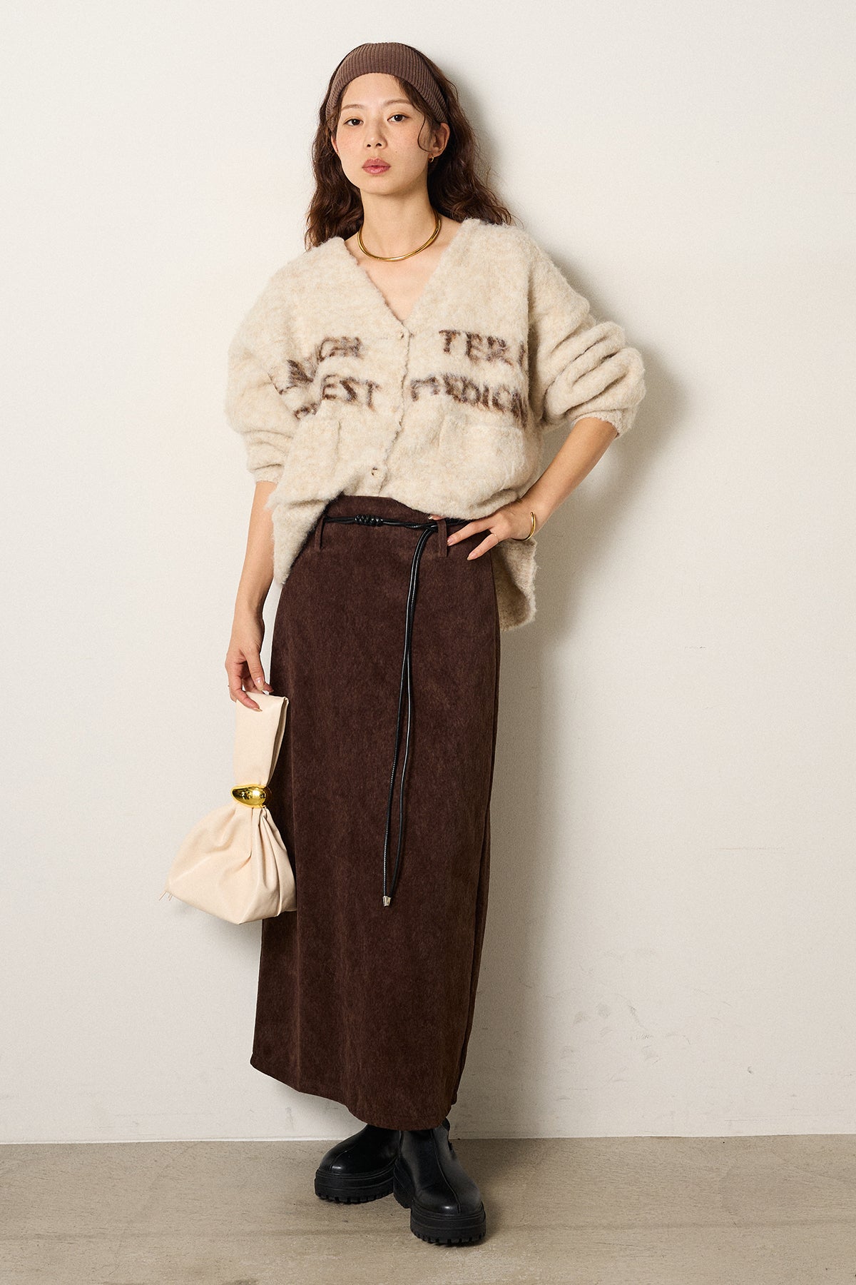 [SET]ウール混透かしロゴニットカーディガン+ロープベルト付きスウェード調スカート(2set)