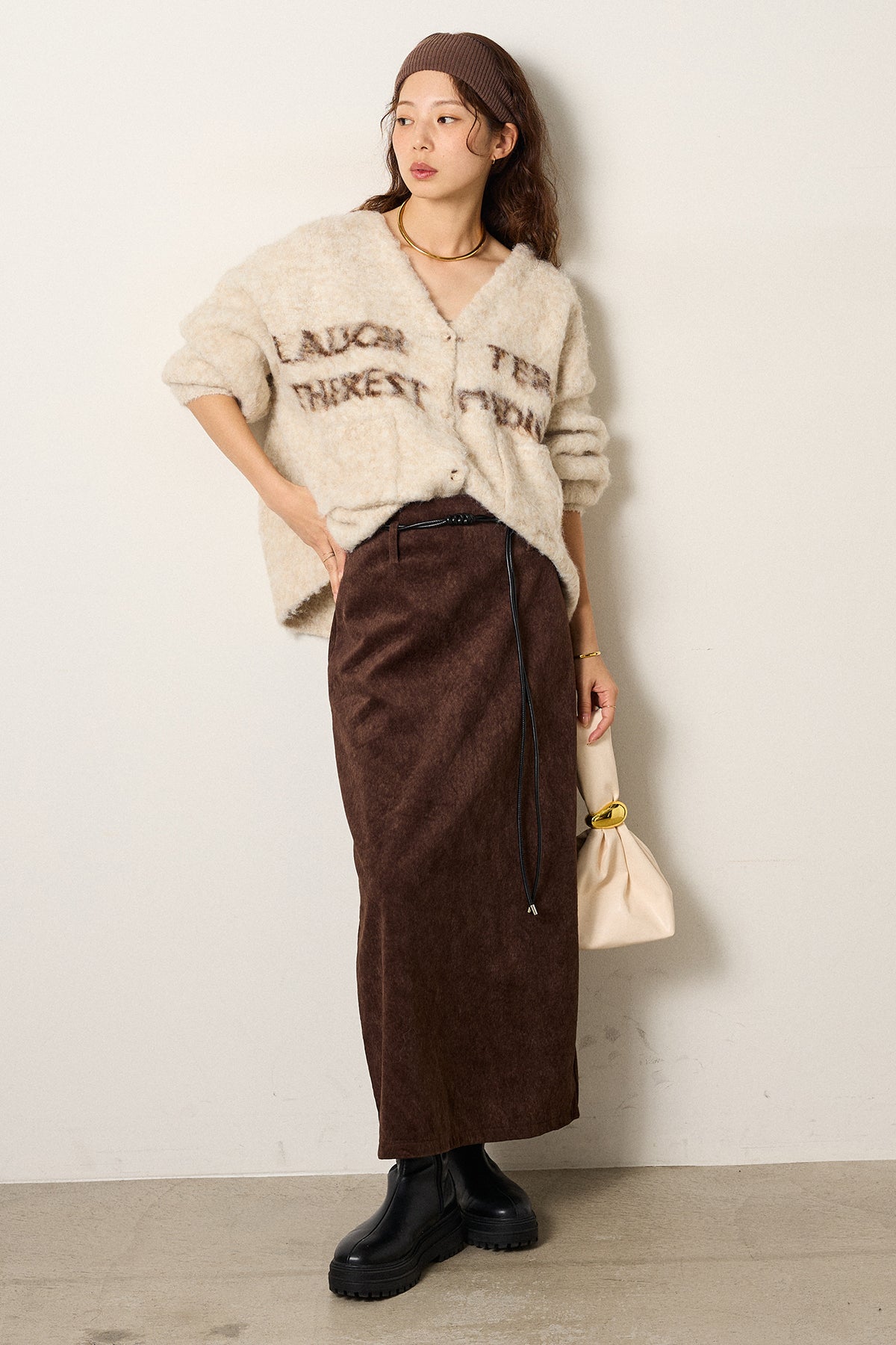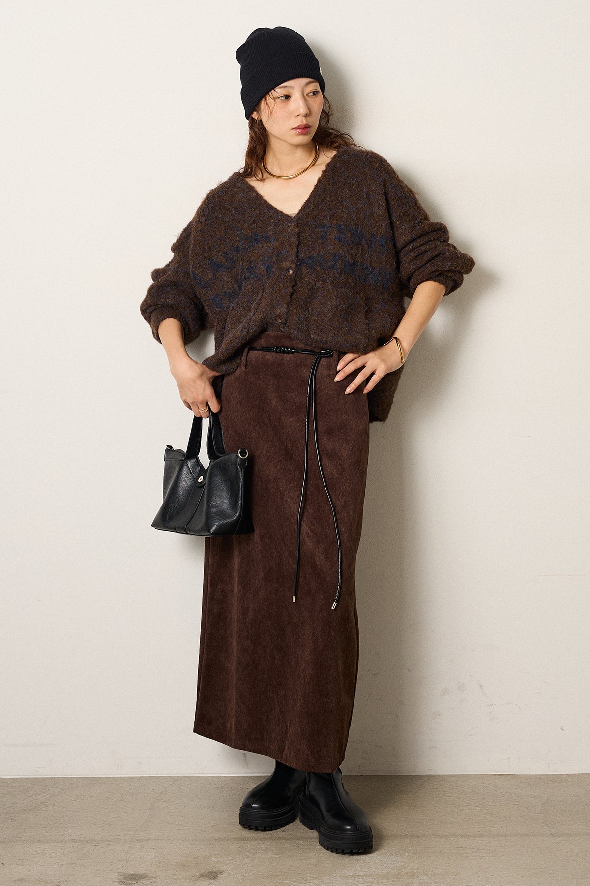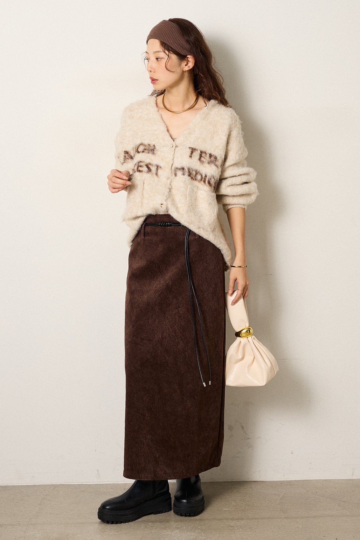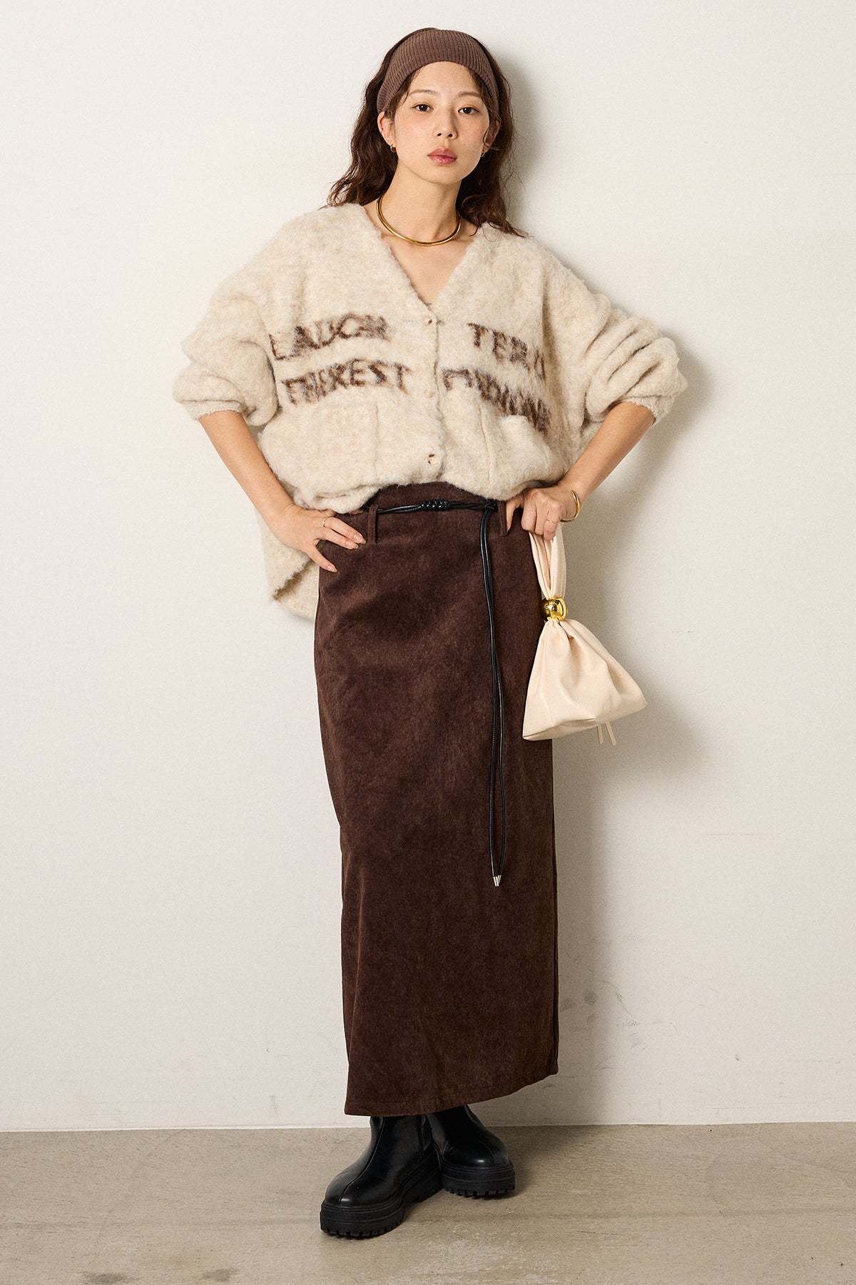 [SET]ウール混透かしロゴニットカーディガン+ロープベルト付きスウェード調スカート(2set)