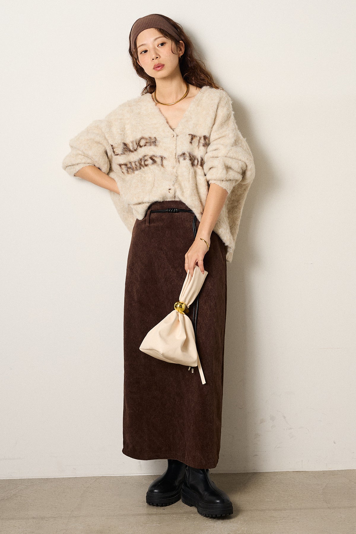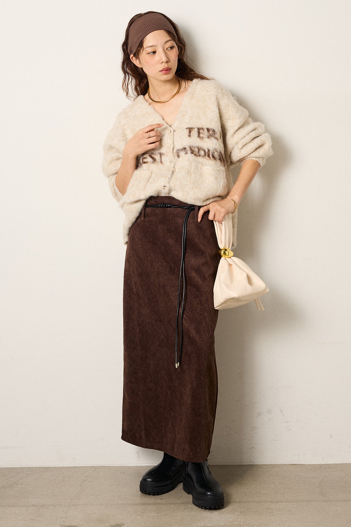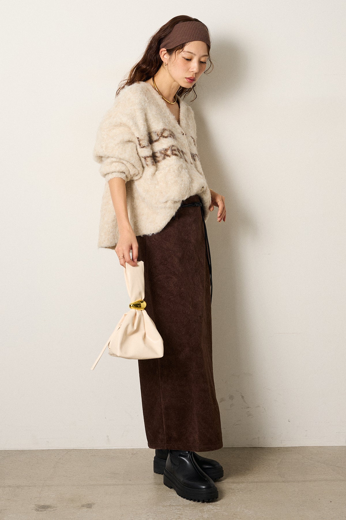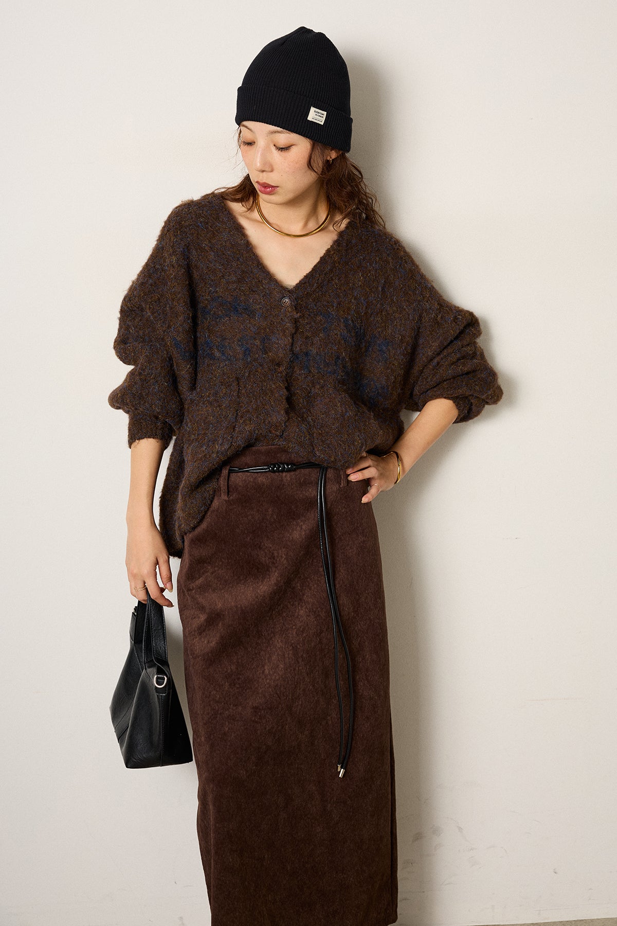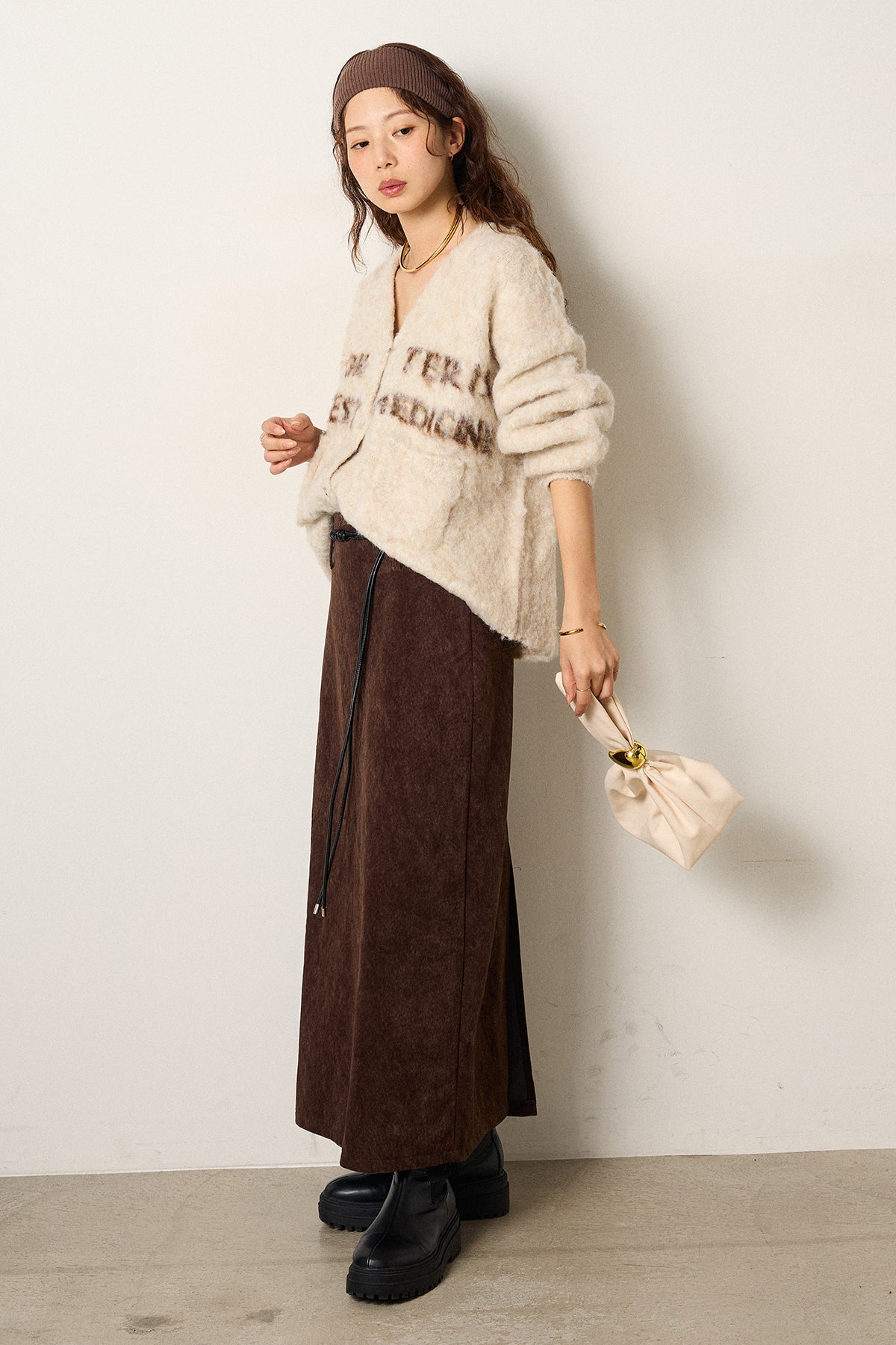 [SET]ウール混透かしロゴニットカーディガン+ロープベルト付きスウェード調スカート(2set)