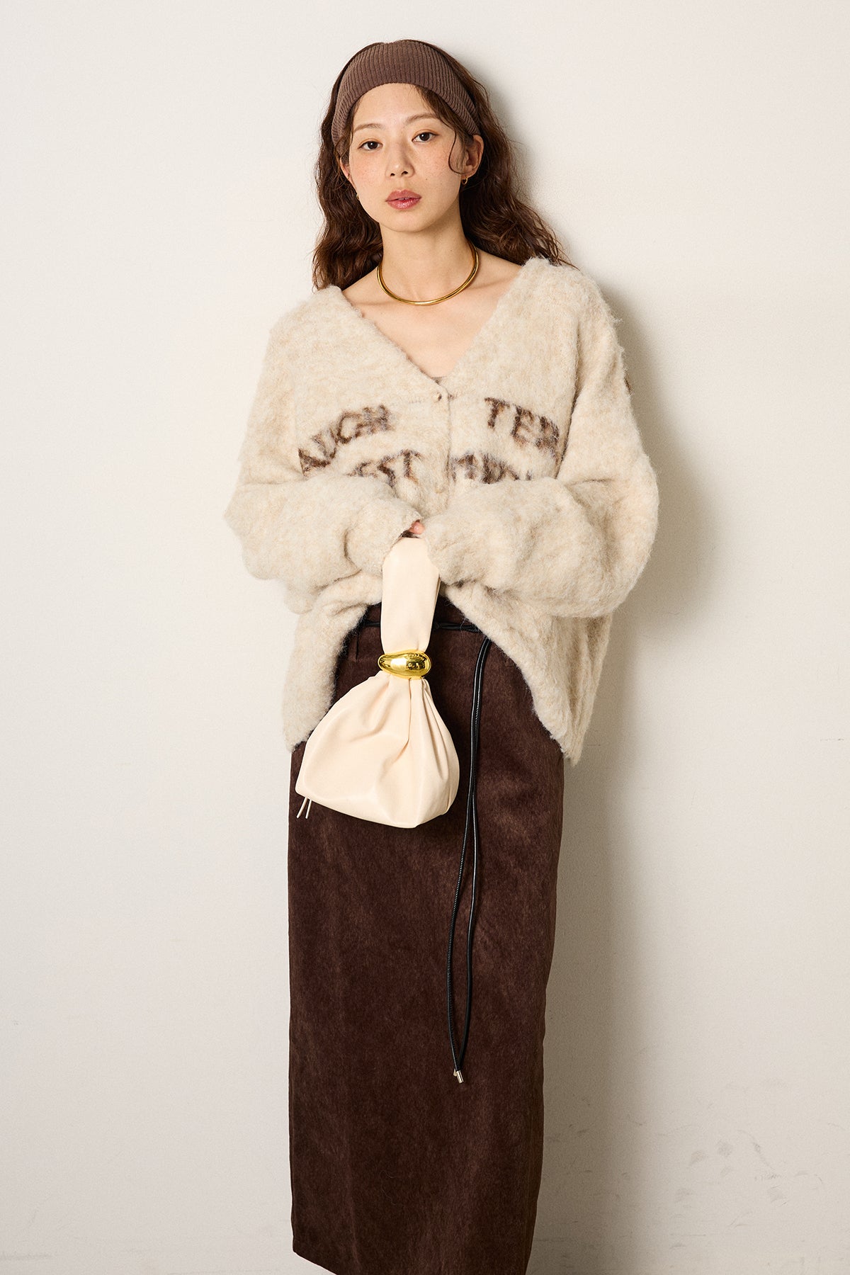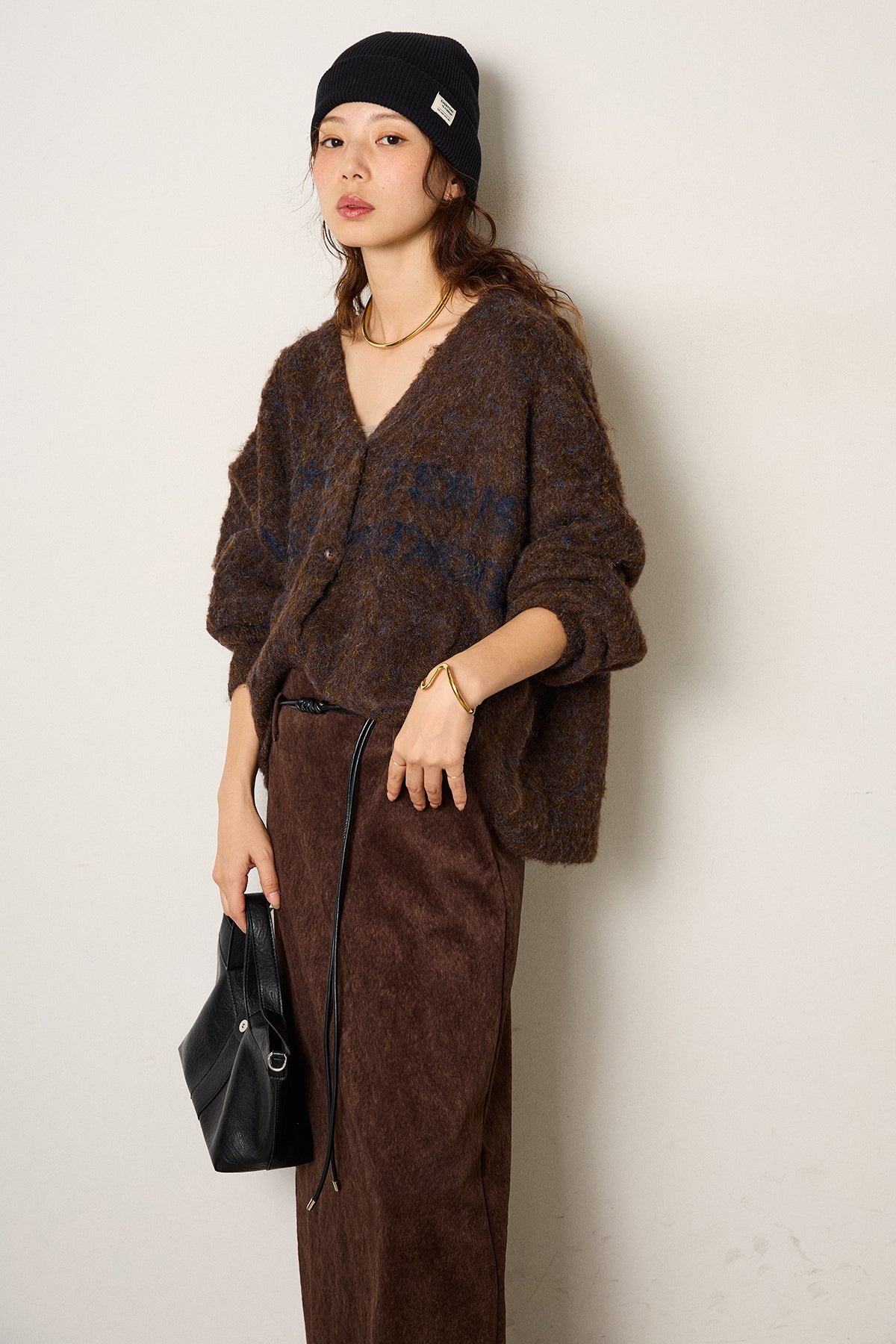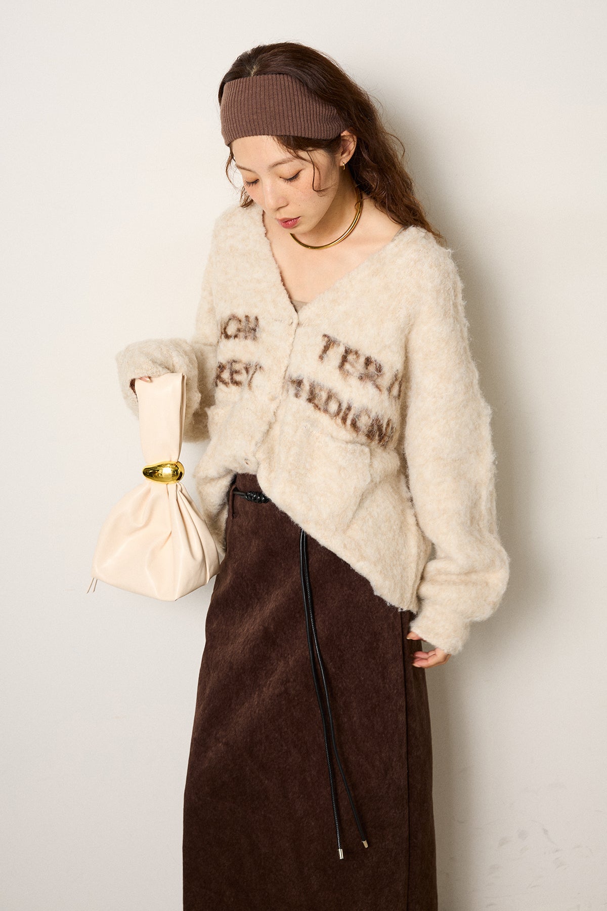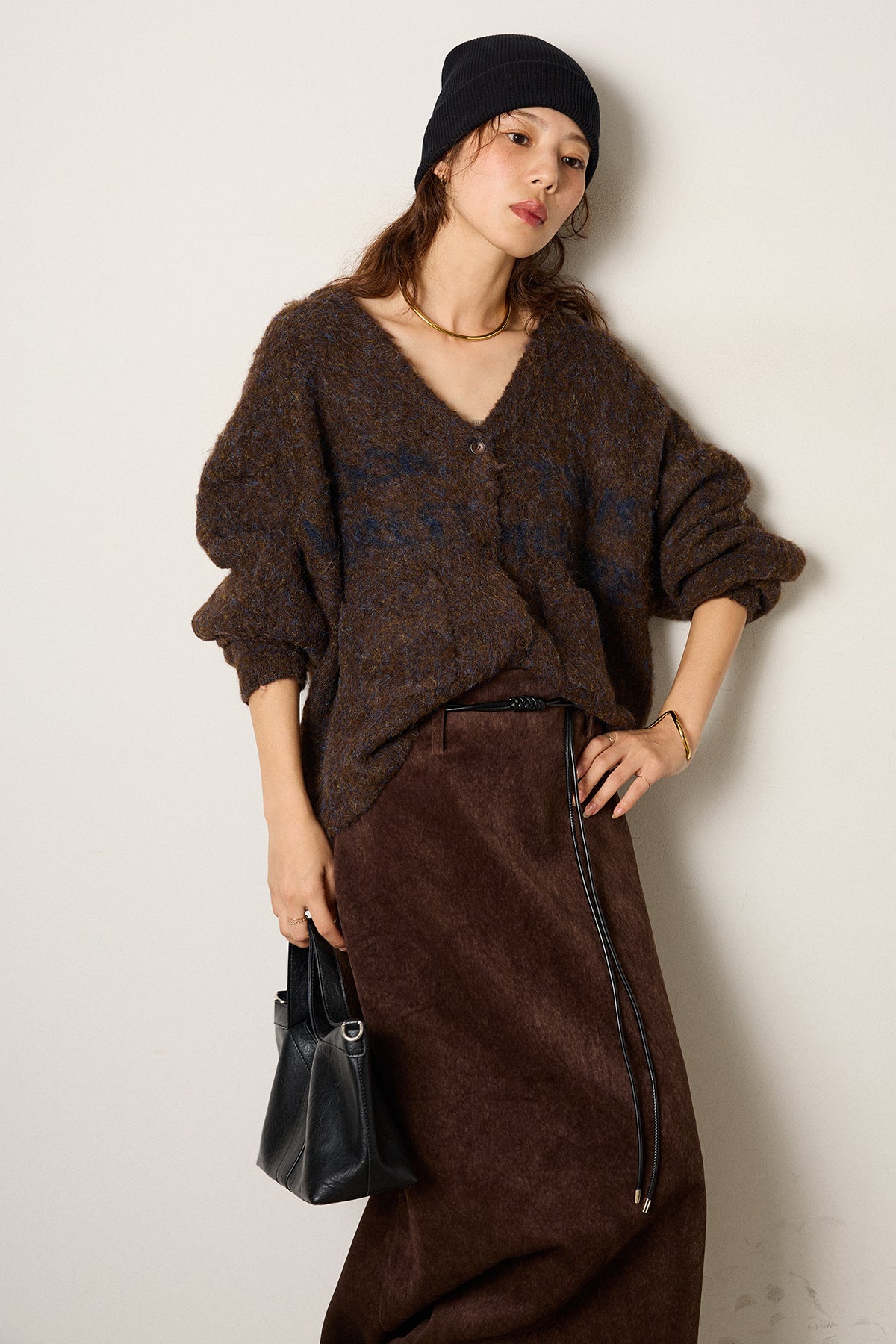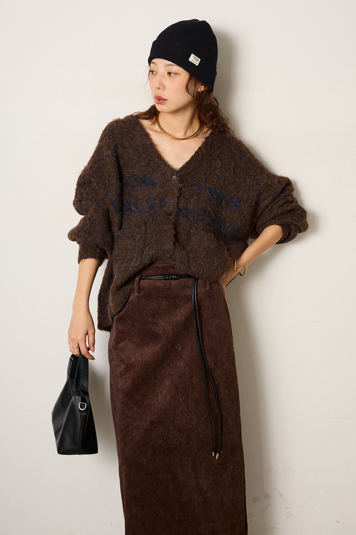[SET]ウール混透かしロゴニットカーディガン+ロープベルト付きスウェード調スカート(2set)