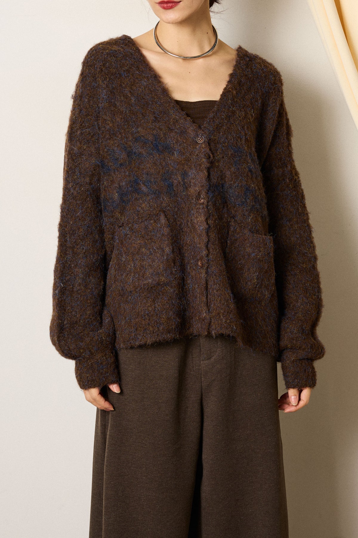 ふんわりとした毛足が魅力のウール混透かしロゴニットカーディガン。 柔らかな風合いと抜け感のあるロゴデザインが、こなれた印象をプラスします。 程よいVネックが顔まわりをすっきりと見せ、ラフに羽織るだけで季節感のあるスタイルに。 パンツにもスカートにも合わせやすく、デイリーに活躍する一枚です。