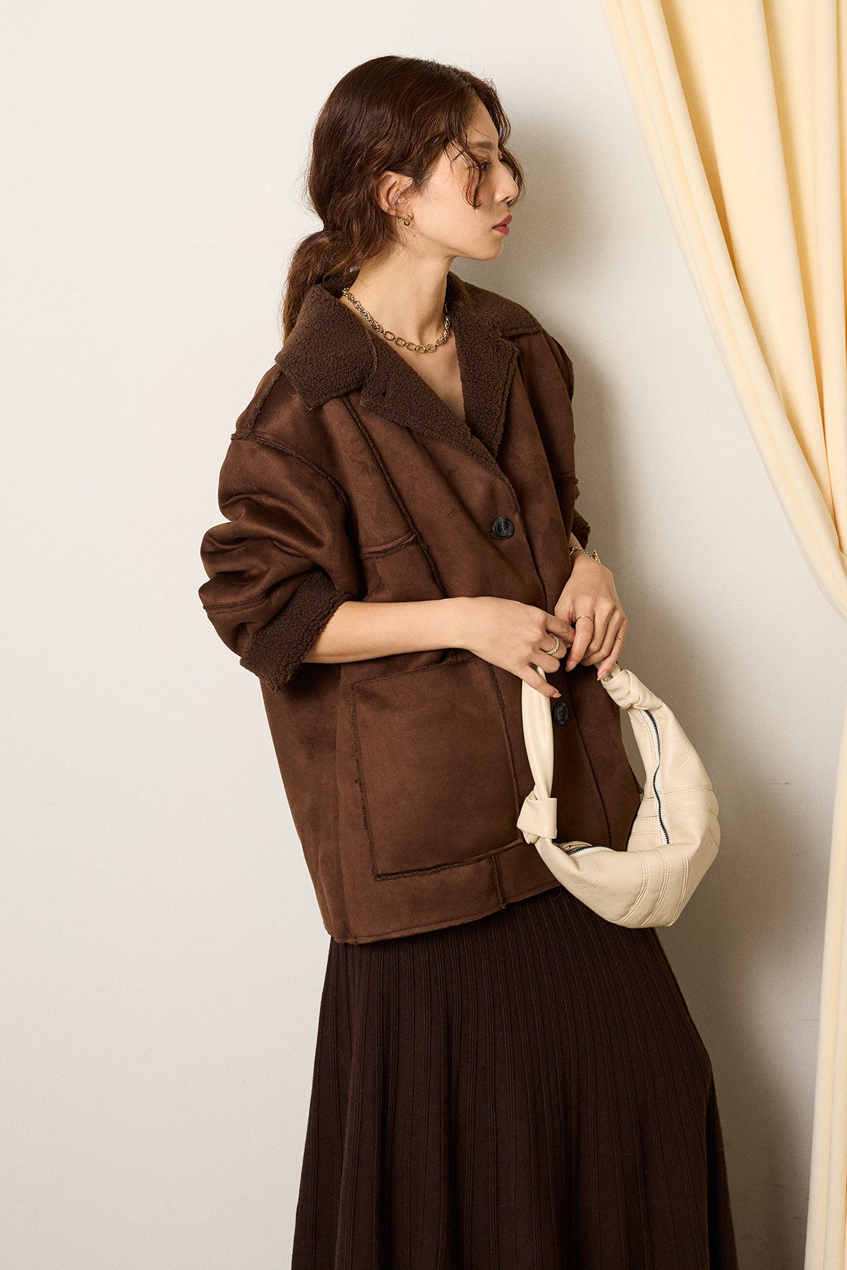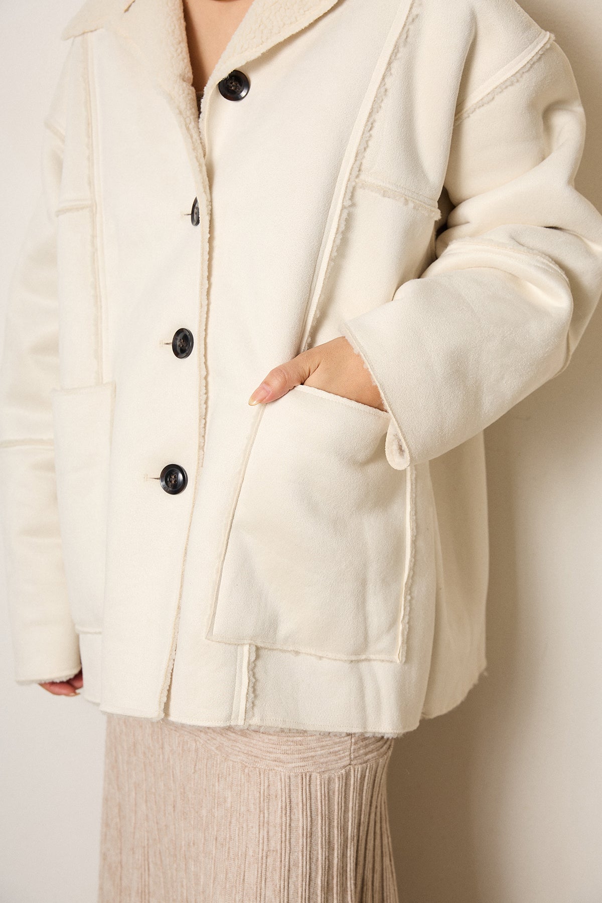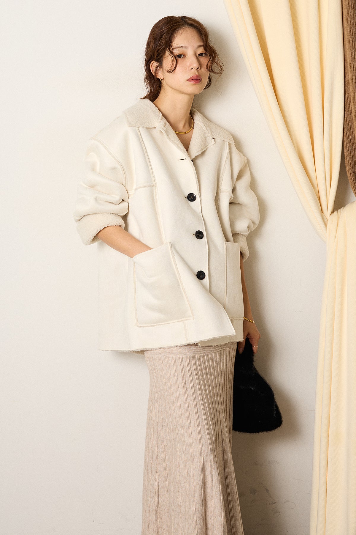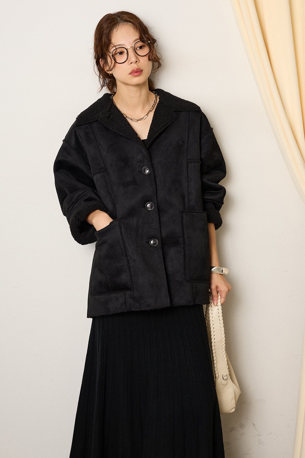 程よくボリュームのあるシルエットが魅力のエコムートンカバーオール。 滑らかなスエード調素材とふんわりとした裏ボアの組み合わせで、見た目にも暖かく季節感たっぷり。 ゆったりとした身幅で厚手のニットにも重ねやすく、デイリー使いに最適です。 大きめのポケットがアクセントになり、実用性とデザイン性を兼ね備えた一枚。