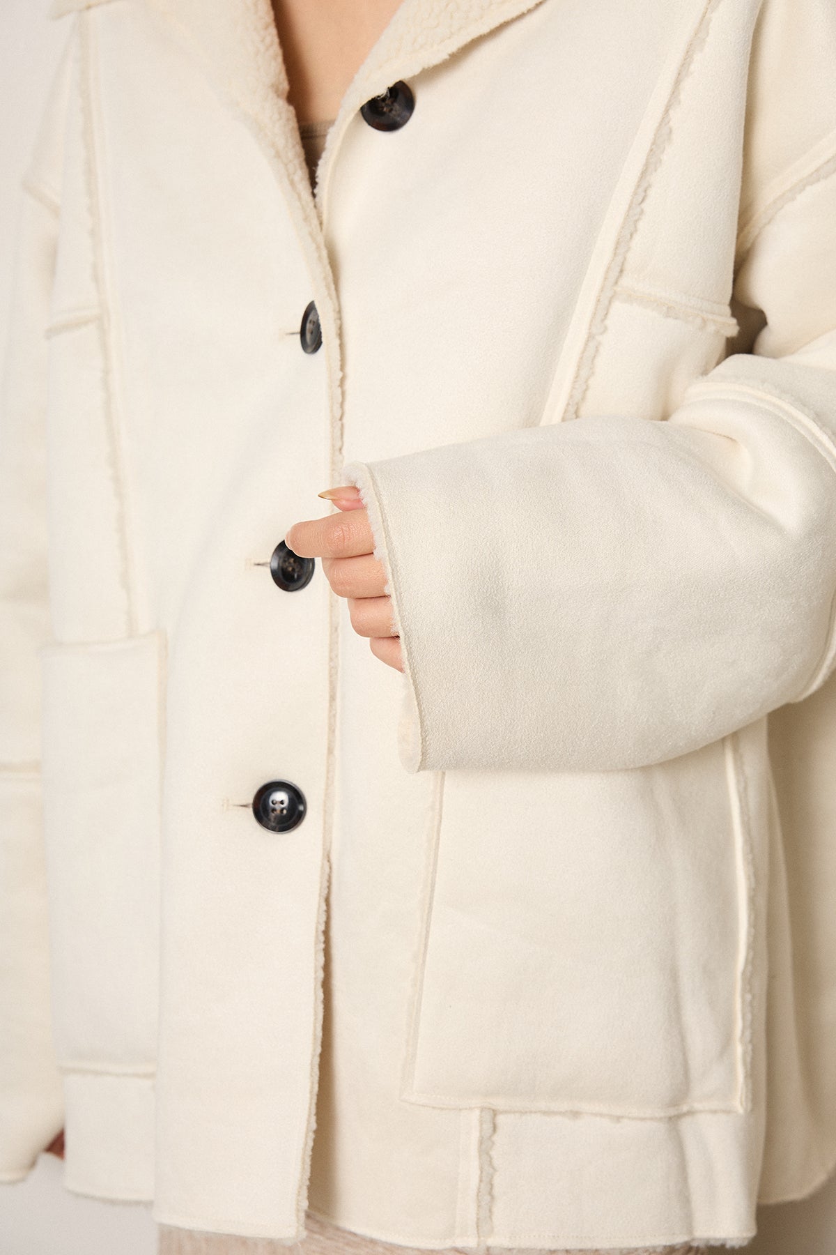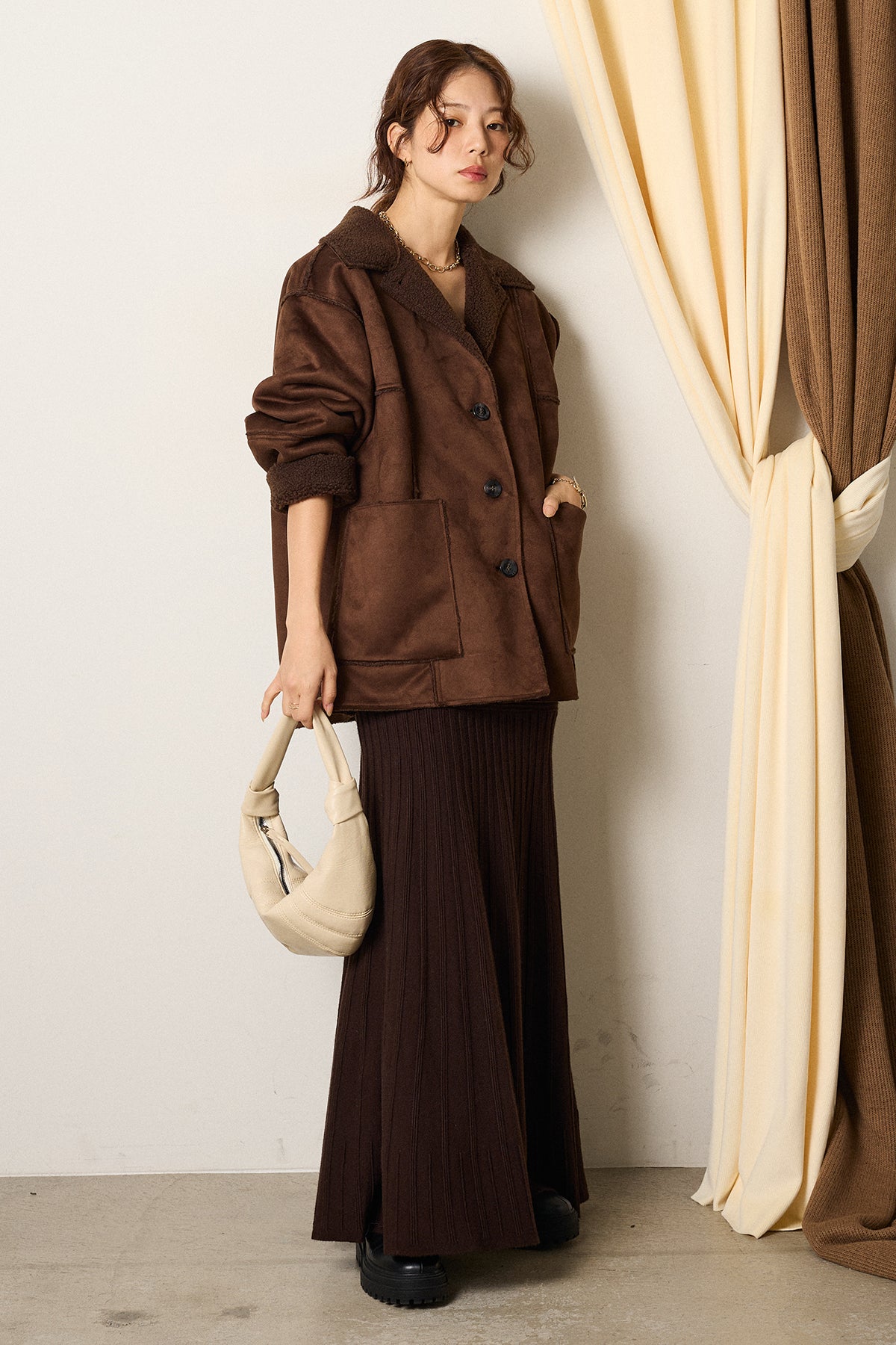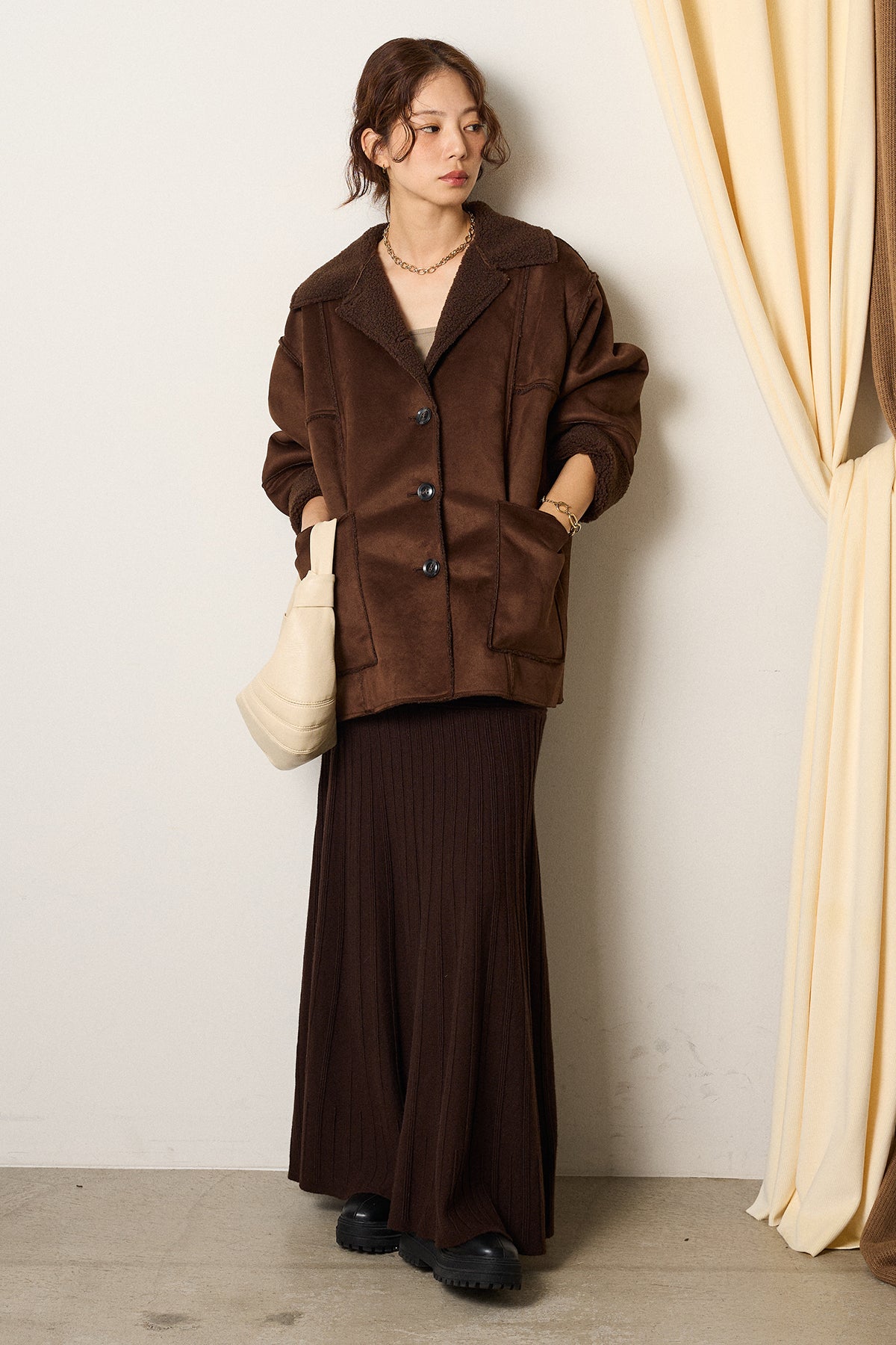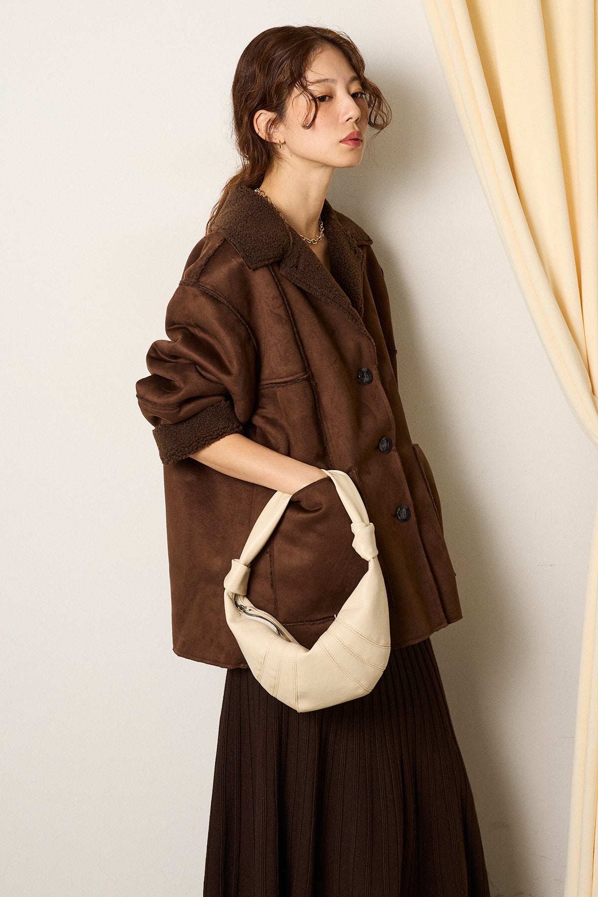 程よくボリュームのあるシルエットが魅力のエコムートンカバーオール。 滑らかなスエード調素材とふんわりとした裏ボアの組み合わせで、見た目にも暖かく季節感たっぷり。 ゆったりとした身幅で厚手のニットにも重ねやすく、デイリー使いに最適です。 大きめのポケットがアクセントになり、実用性とデザイン性を兼ね備えた一枚。