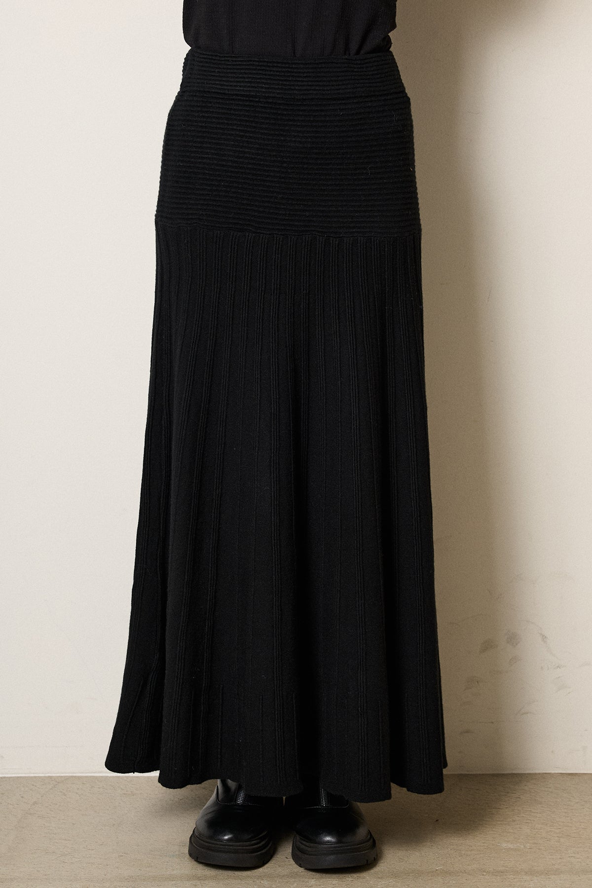 編み地の切り替えが印象的なフレアニットスカート。 ウエストからヒップにかけてはリブ編みですっきり見せ、裾に向かって柔らかく広がるフレアシルエットが美しい一枚。 動くたびに揺れる軽やかなニット素材が、上品なニュアンスを添えます。 同素材のトップスと合わせたセットアップスタイルもおすすめです。