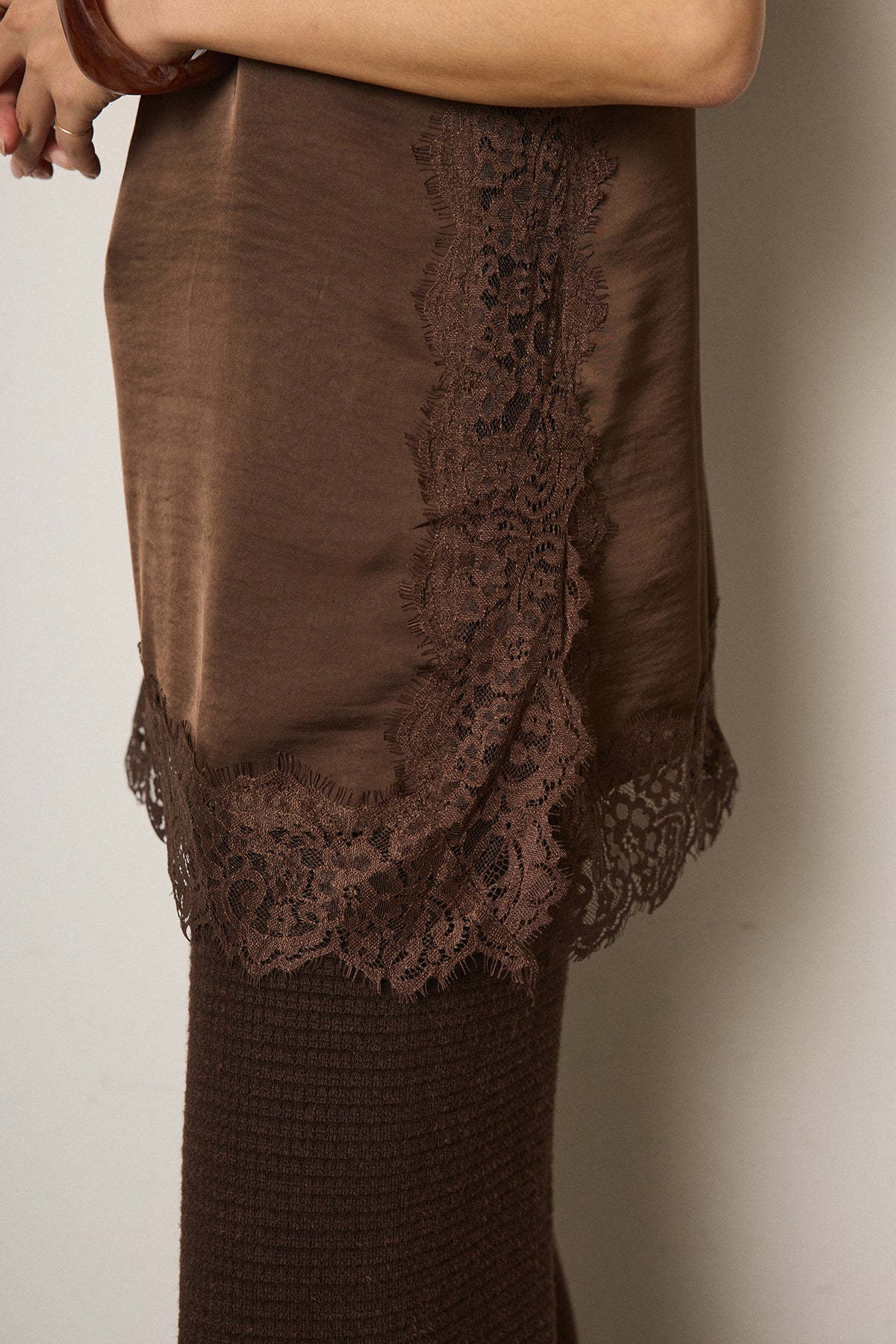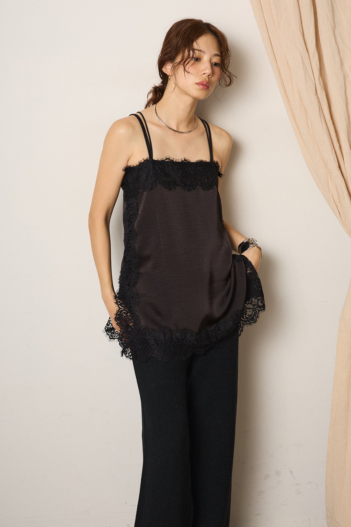 艶やかなサテン生地に繊細なレースをあしらったキャミソール。