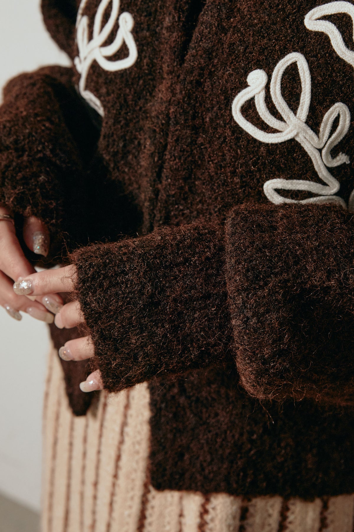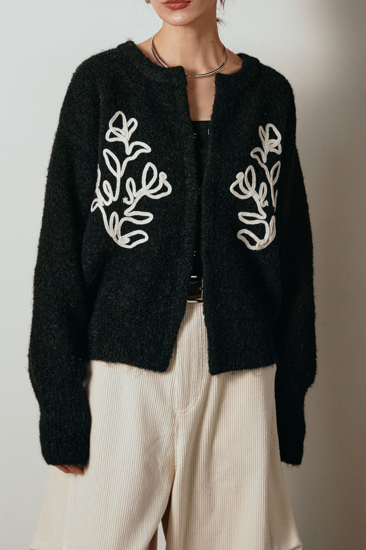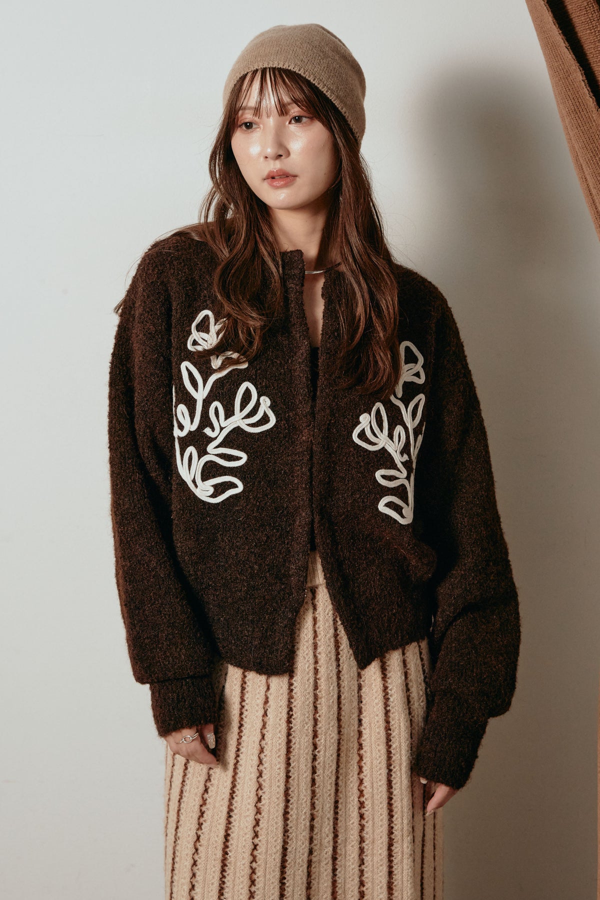 立体的なテープ刺繍が目を惹くニットカーディガン。ふんわりとした毛足のある素材がシーズンムードを高め、着心地も抜群です。フロントの刺繍デザインが華やかさをプラスし、シンプルなコーディネートに映える一枚。ボタンを留めてプルオーバー風に着ても、羽織りとしても楽しめます。