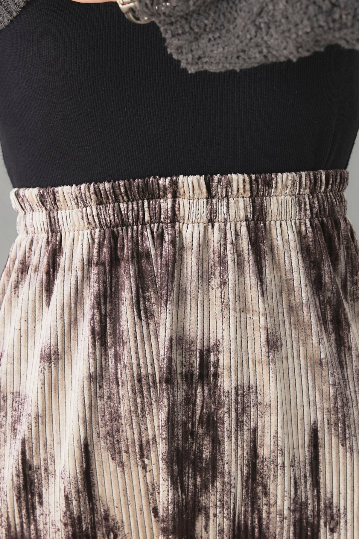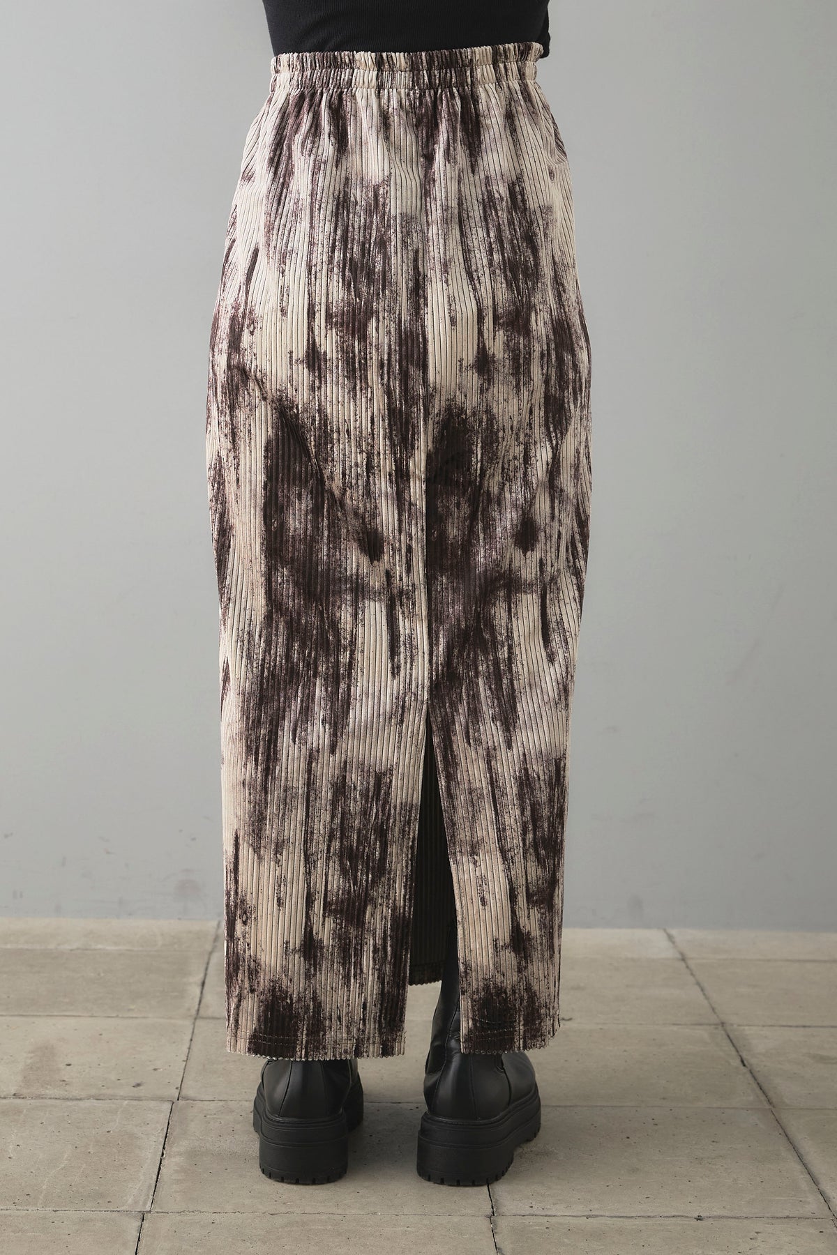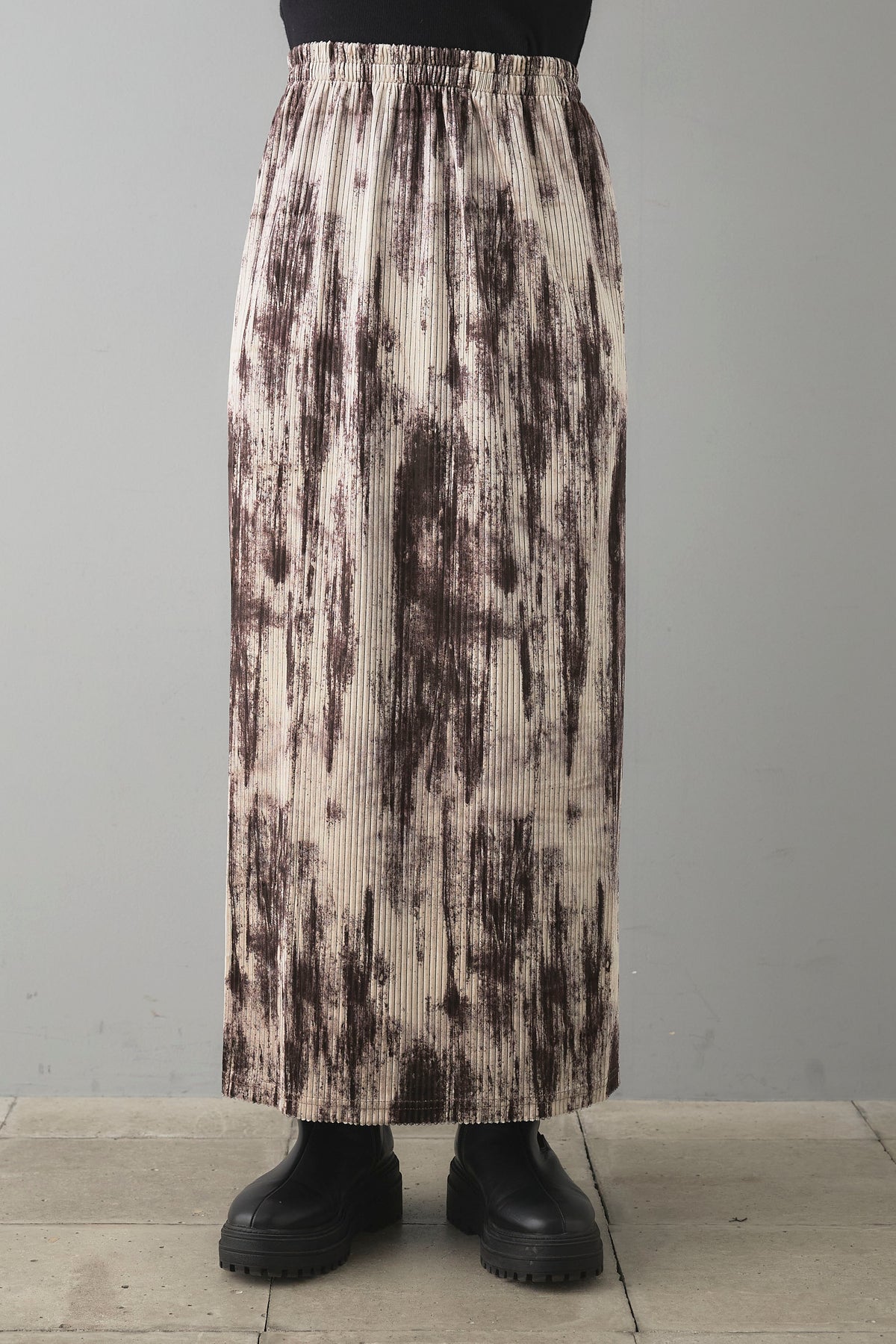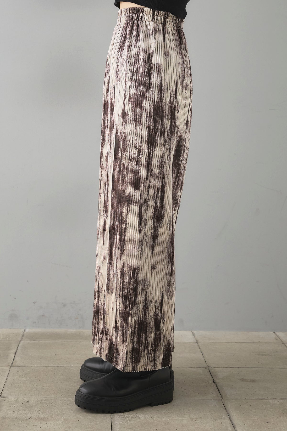 独特な模様とプリーツ加工が特徴のアイテムです。スモーキーな模様がニュアンス感を引き立て、シックで個性的な印象を与えます。プリーツによる縦ラインが強調され、スタイルを美しく見せる効果があります。ウエストはゴム仕様で、フィット感が良く、着心地も快適です。カジュアルなスタイルから、少しドレッシーなコーディネートまで幅広く活用でき、コーデにアクセントを加えたいときにぴったりのアイテムです。
