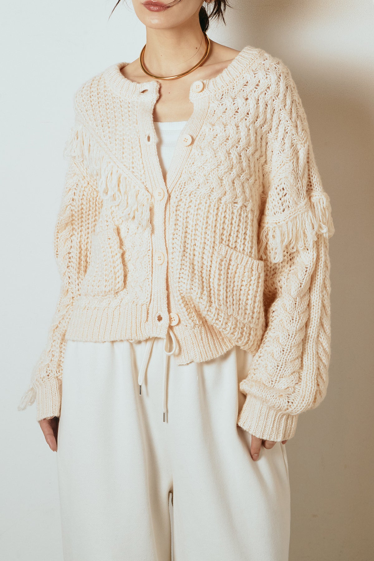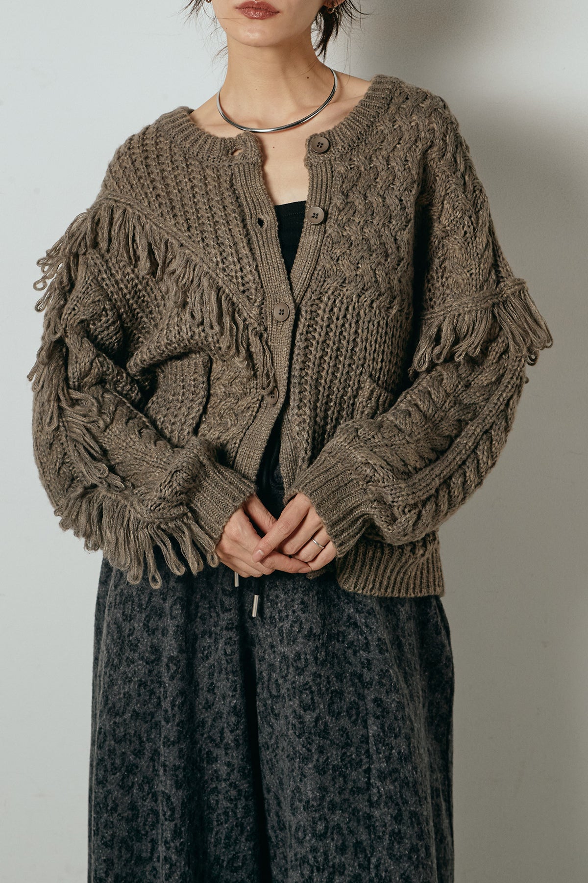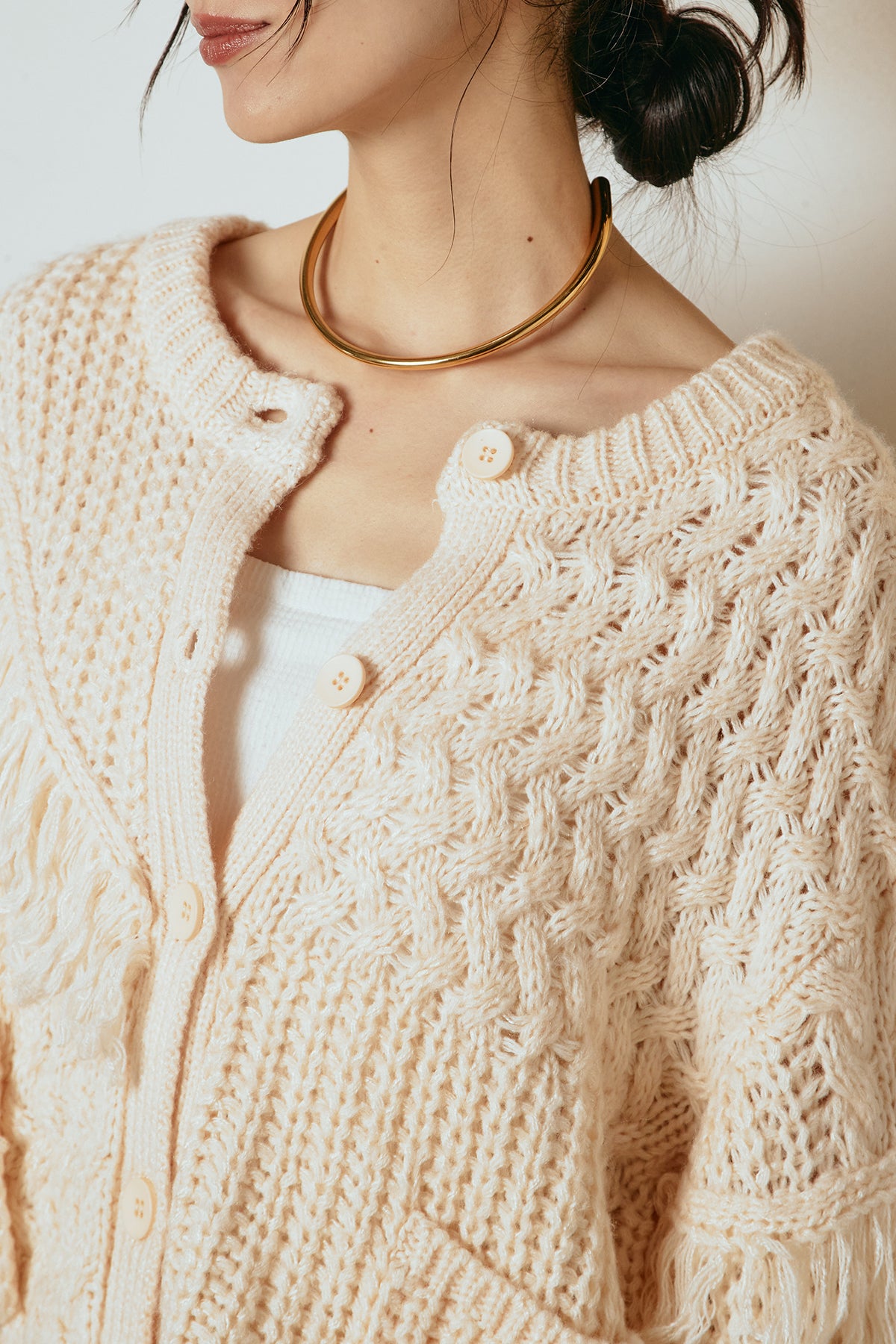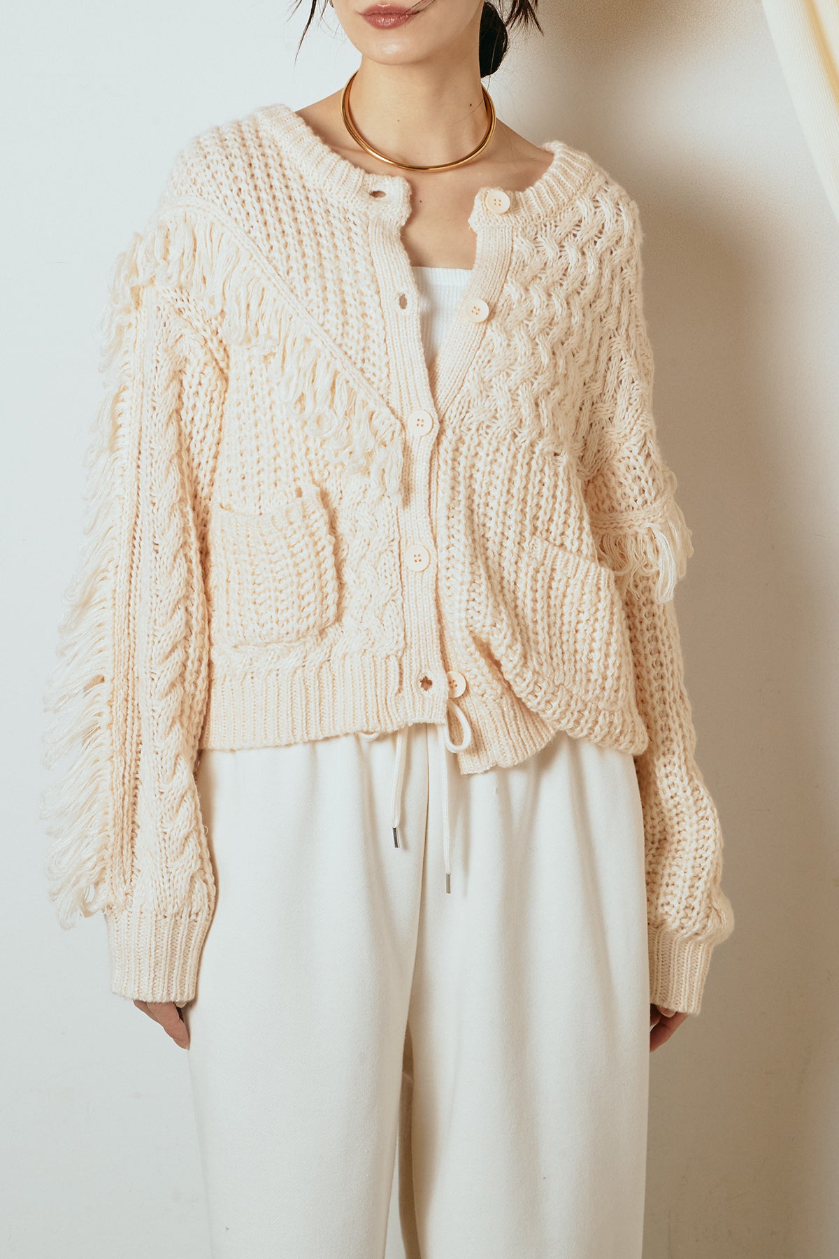 異なる編み地とフリンジをランダムに組み合わせた、表情豊かなニットカーディガン。立体感のあるデザインがシンプルなスタイリングにも奥行きを与え、羽織るだけで印象的な着こなしに仕上がります。程よくゆとりのあるシルエットでリラックス感があり、ボタンを留めても開けてもバランスよく決まる一枚。季節感を取り入れながら、コーディネートの主役として活躍します。