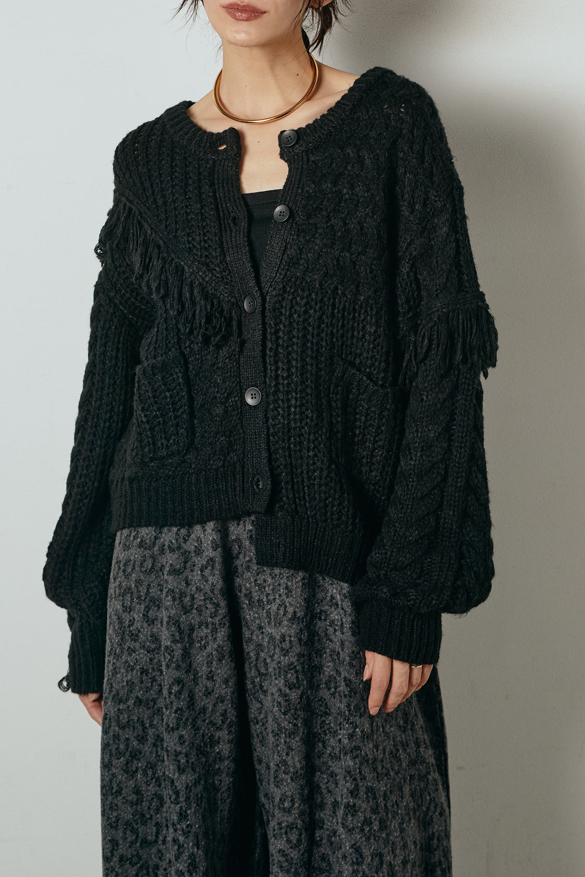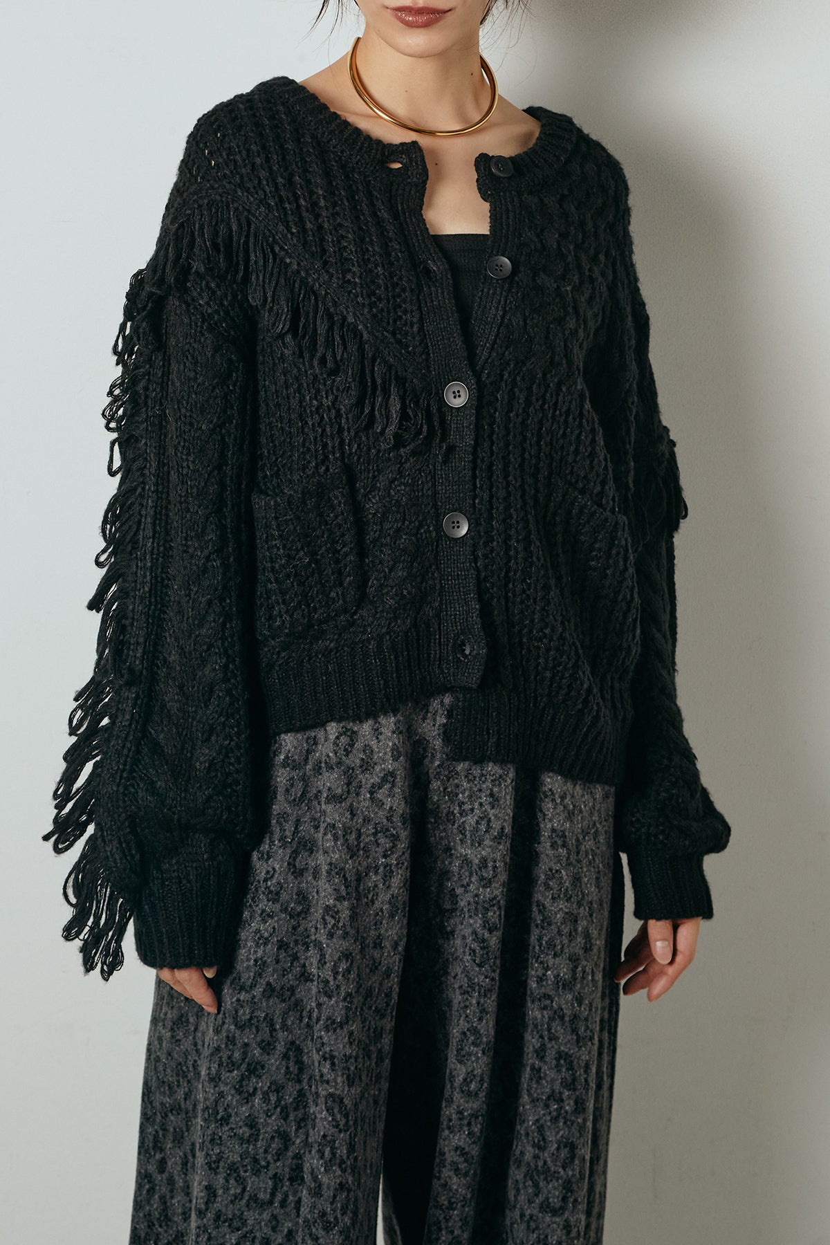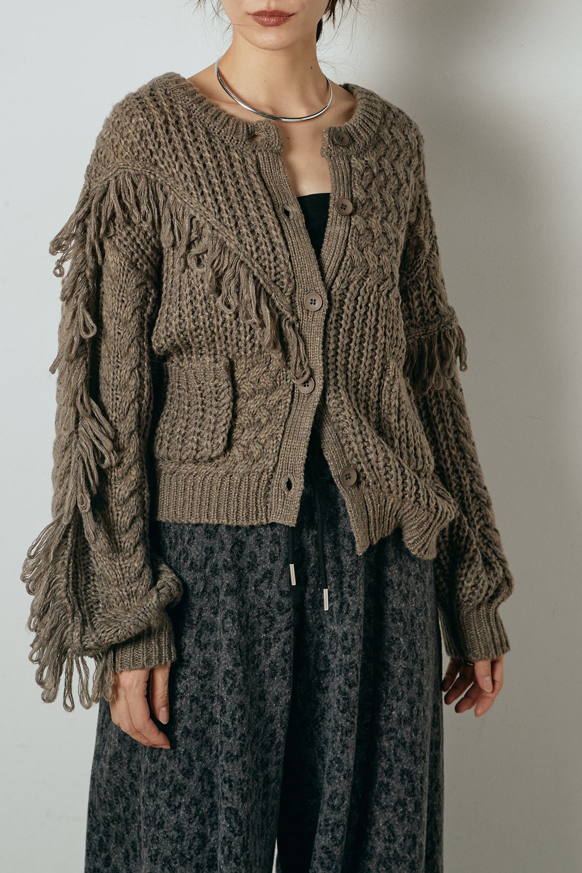 異なる編み地とフリンジをランダムに組み合わせた、表情豊かなニットカーディガン。立体感のあるデザインがシンプルなスタイリングにも奥行きを与え、羽織るだけで印象的な着こなしに仕上がります。程よくゆとりのあるシルエットでリラックス感があり、ボタンを留めても開けてもバランスよく決まる一枚。季節感を取り入れながら、コーディネートの主役として活躍します。