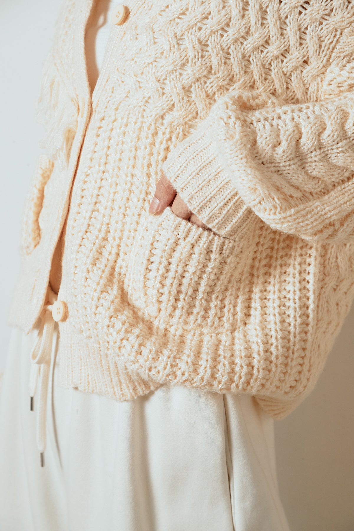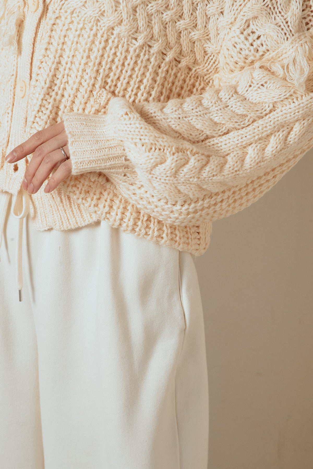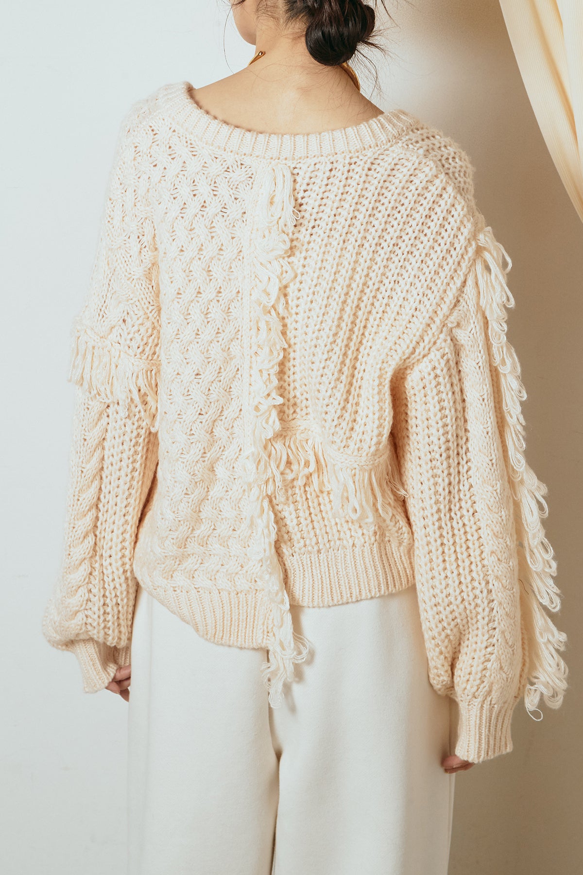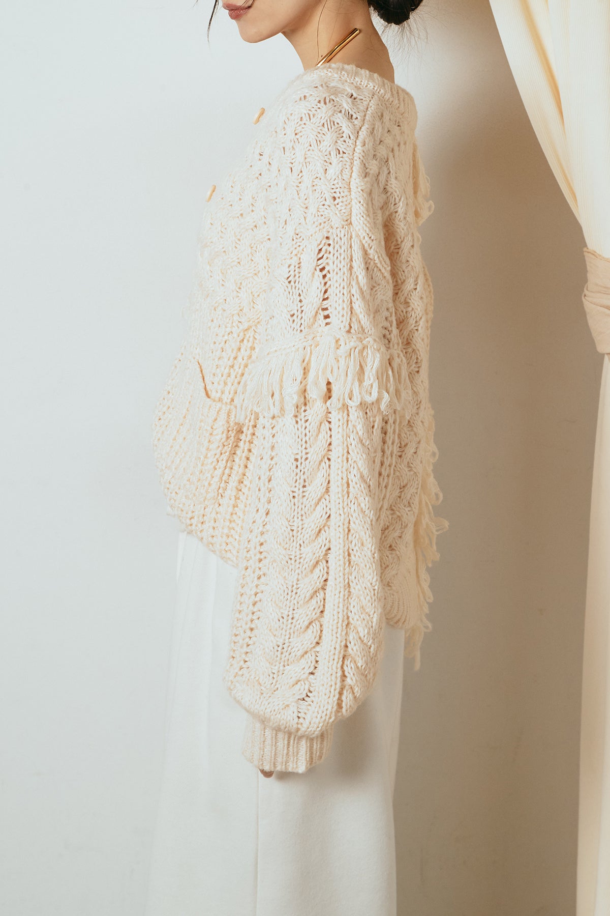 異なる編み地とフリンジをランダムに組み合わせた、表情豊かなニットカーディガン。立体感のあるデザインがシンプルなスタイリングにも奥行きを与え、羽織るだけで印象的な着こなしに仕上がります。程よくゆとりのあるシルエットでリラックス感があり、ボタンを留めても開けてもバランスよく決まる一枚。季節感を取り入れながら、コーディネートの主役として活躍します。