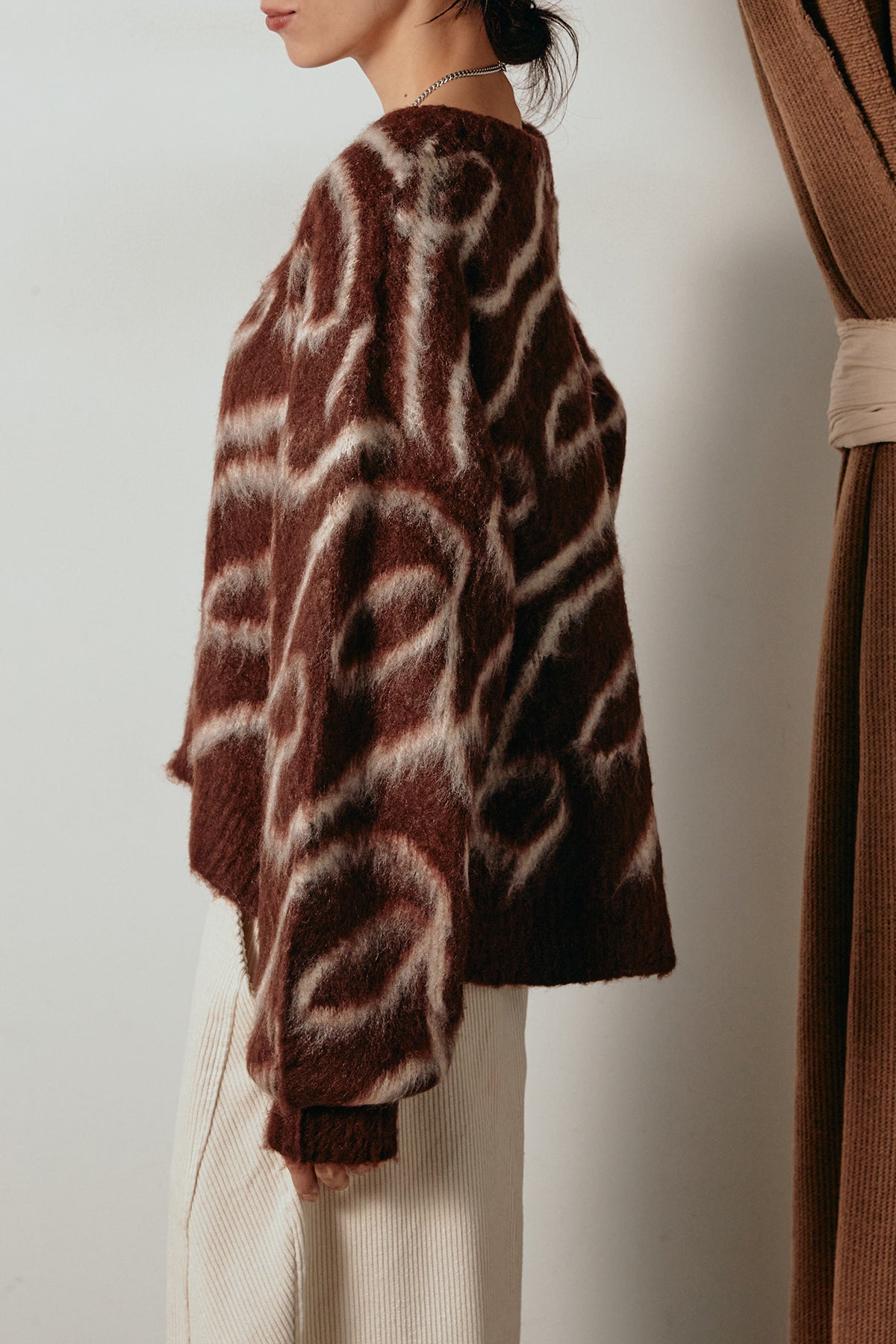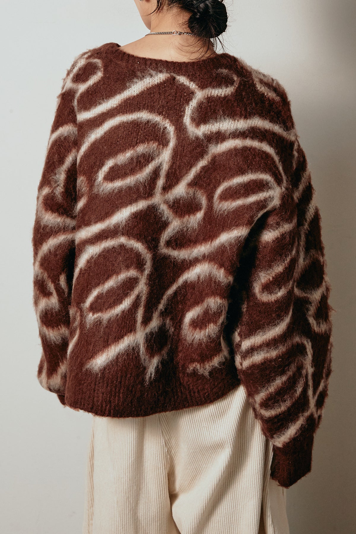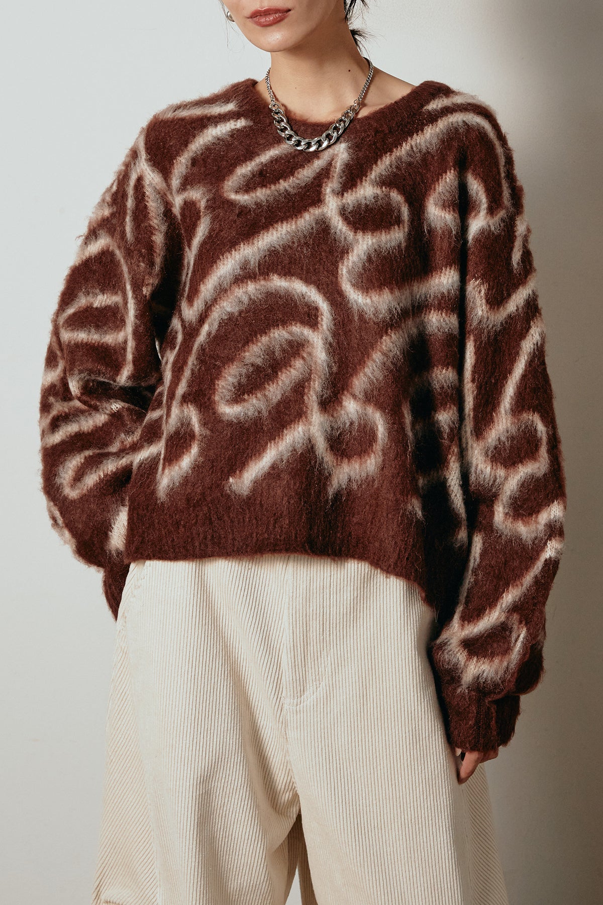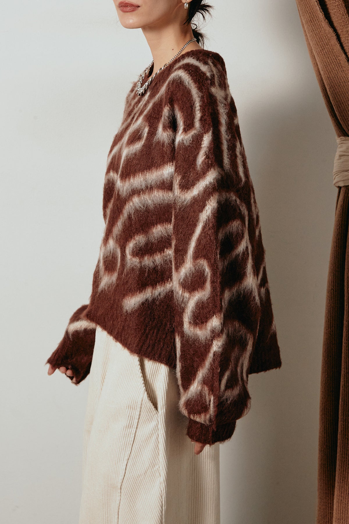 柔らかな毛足のあるニットに、印象的なライン柄を施したプルオーバー。抽象的なニュアンスデザインが存在感を放ち、シンプルながらもモードな印象を演出します。ゆったりとしたシルエットでリラックス感があり、ボトムを選ばず着回し自在。デニムやスカートと合わせるだけで洗練されたスタイリングが完成します。