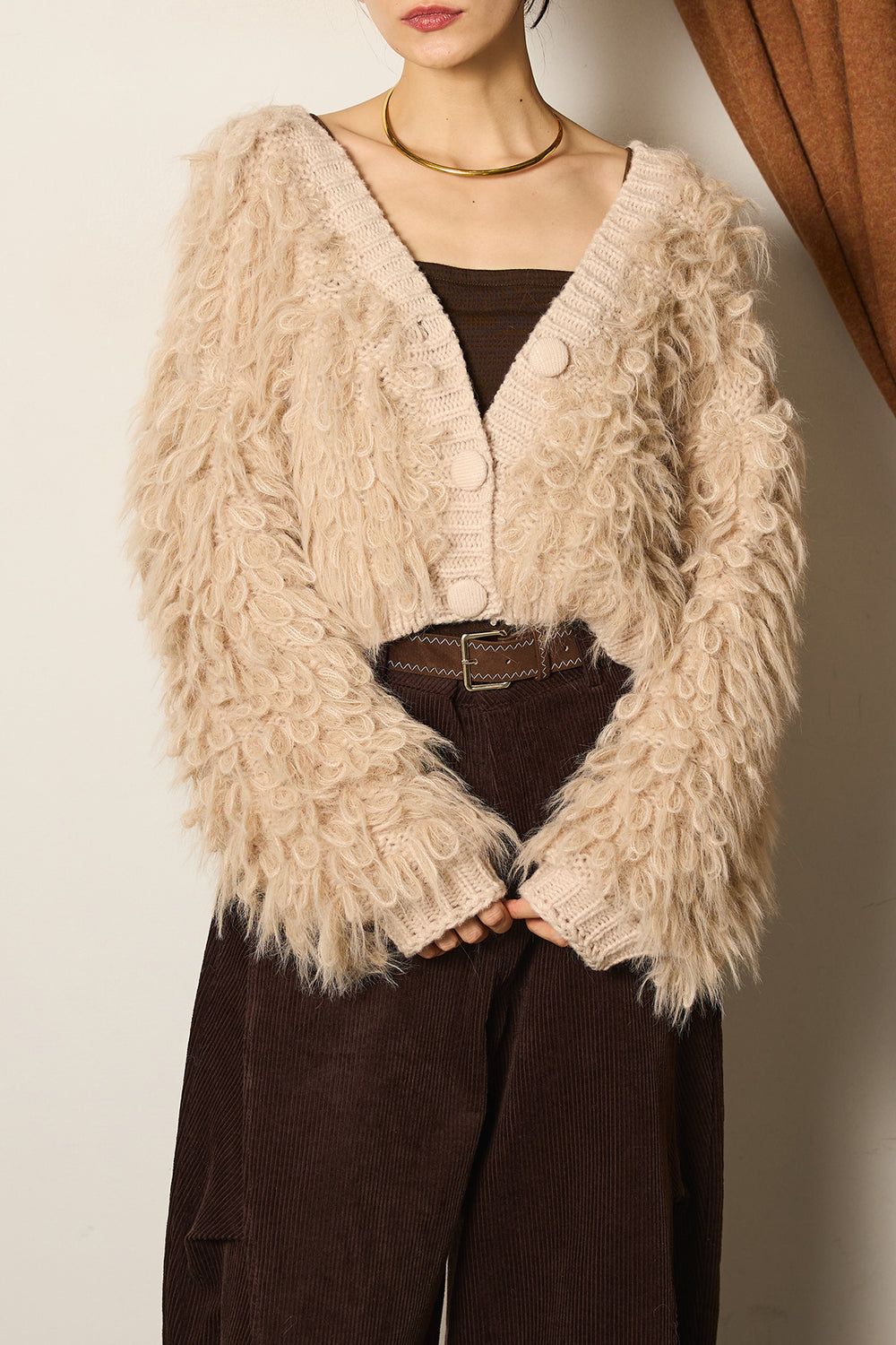 [SET]ショート丈ループボアニットカーディガン+ステッチデザインベルト付きコーデュロイカーブパンツ(2set)