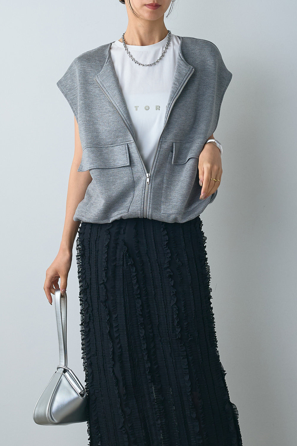 [SET]ダブルジップポケットベスト+ミニ箔ロゴプリントフレンチTシャツ+ランダムカットフリルスカート(3set)