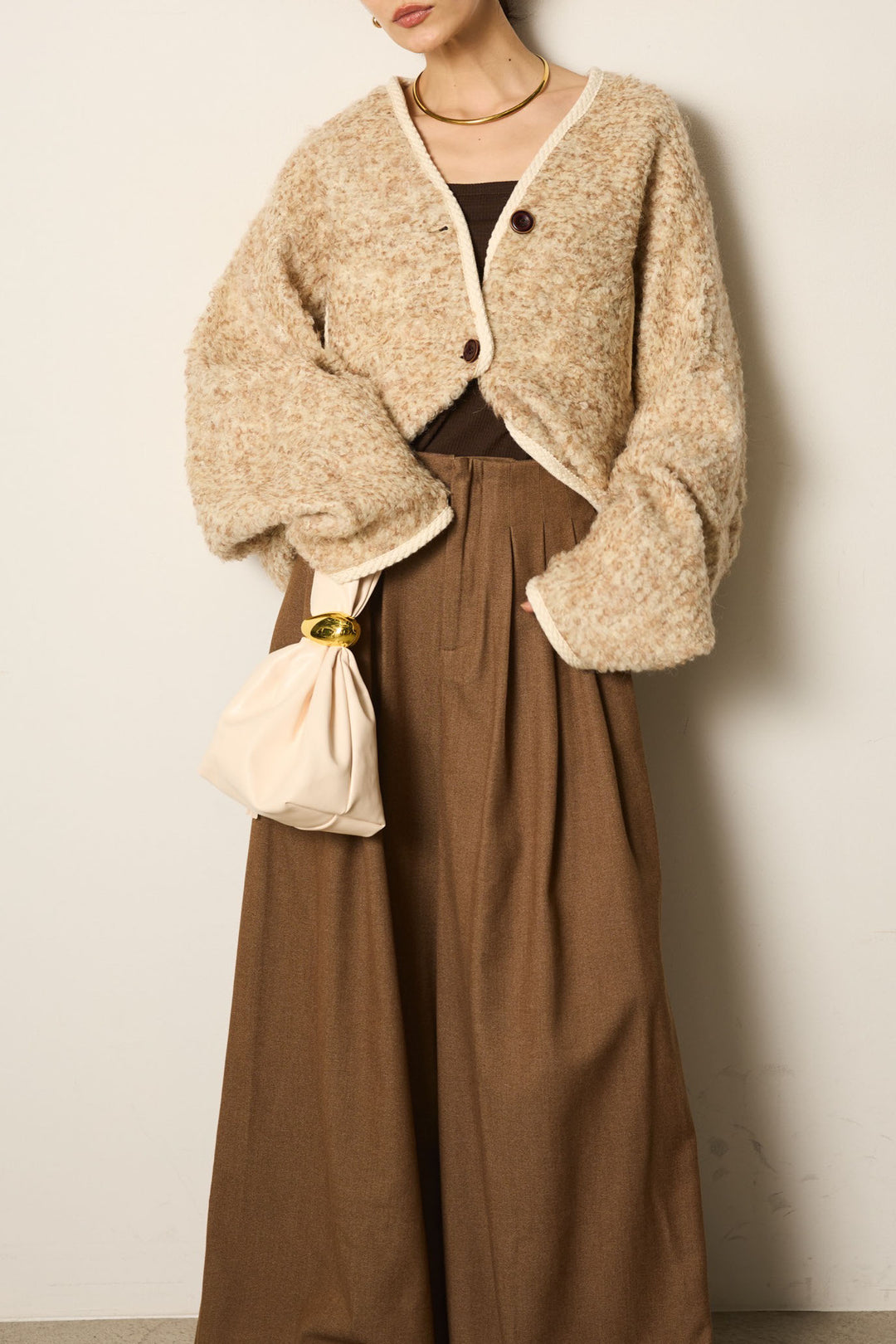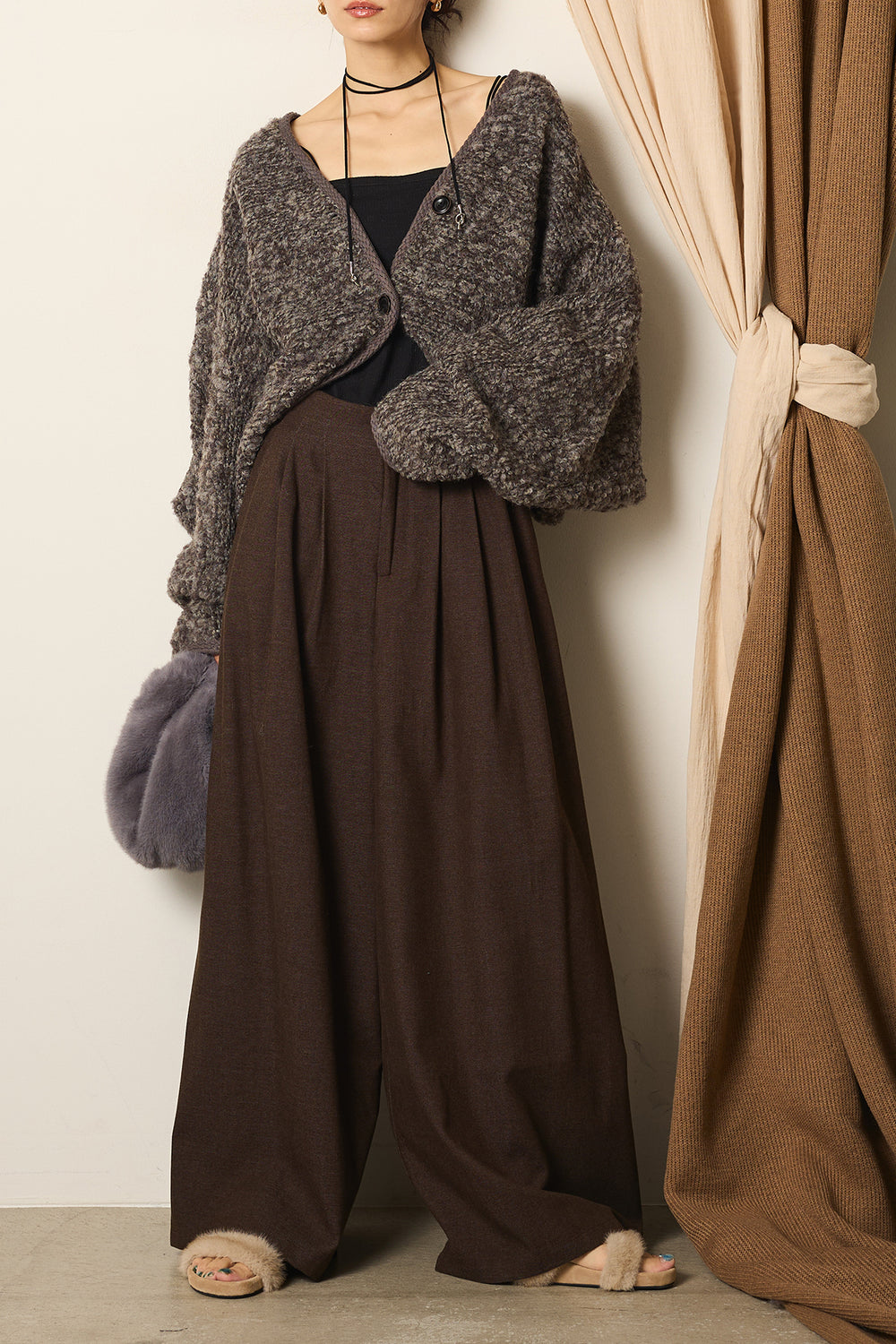 [SET]ノーカラーミックスボアアウター+ワイドシルエットタックパンツ(2set)