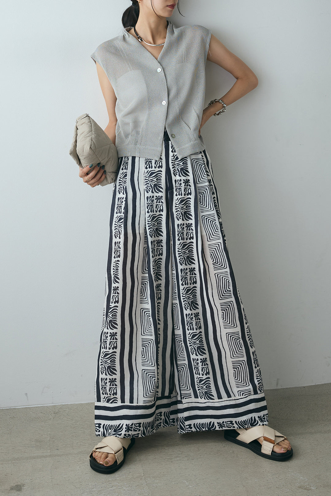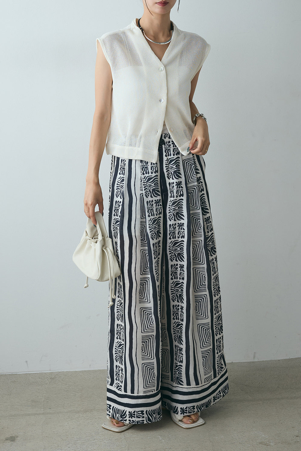 [SET]ノースリーブサマーニットベスト+ライン幾何学柄ワイドパンツ(2set)