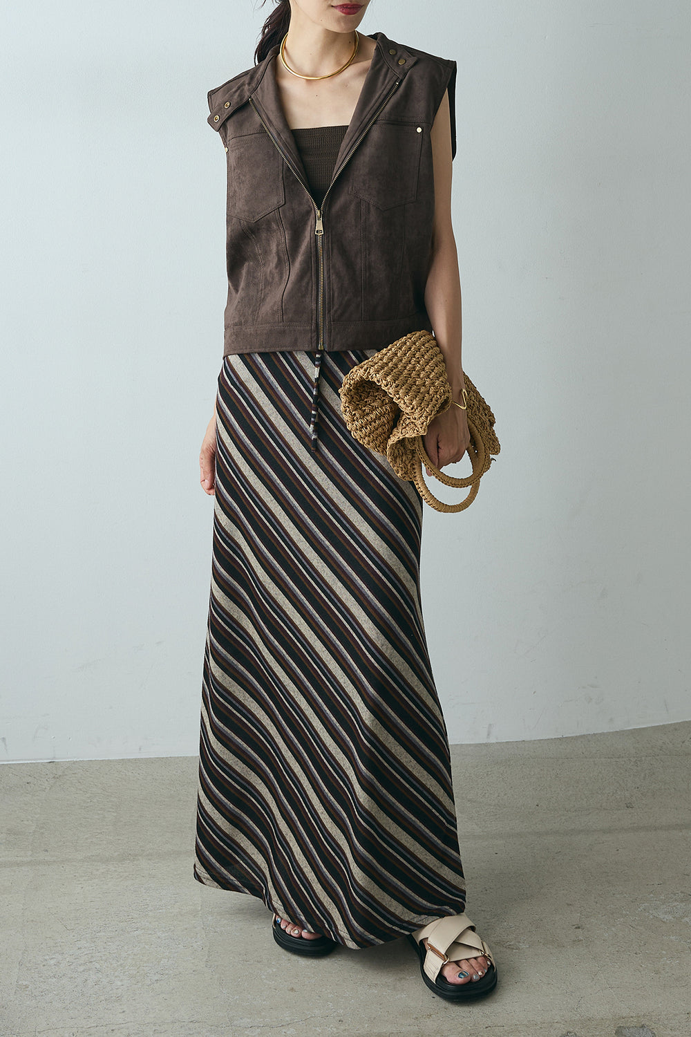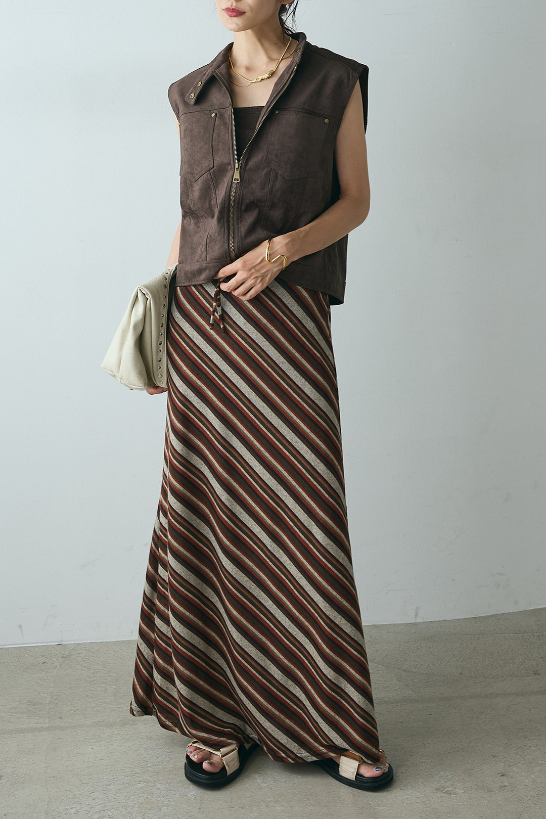 [SET]ノースリーブフェイクスエードポケットベスト+斜めライン柄スカート(2set)