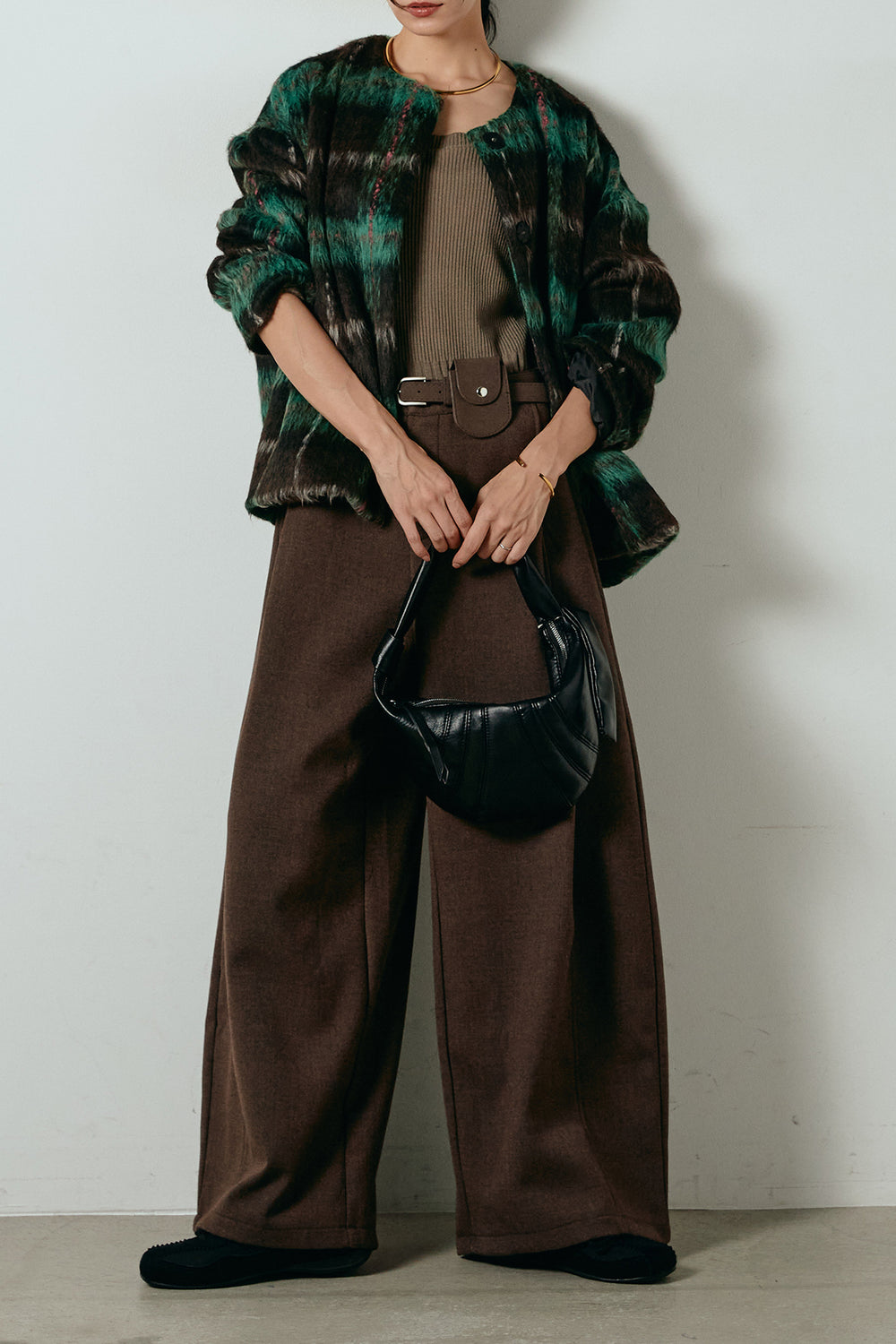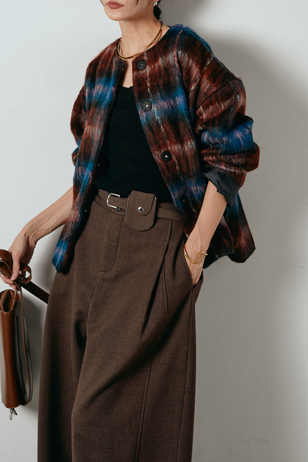 [SET]ノーカラーシャギーチェックアウター+ポーチベルト付きカーブパンツ(2set)