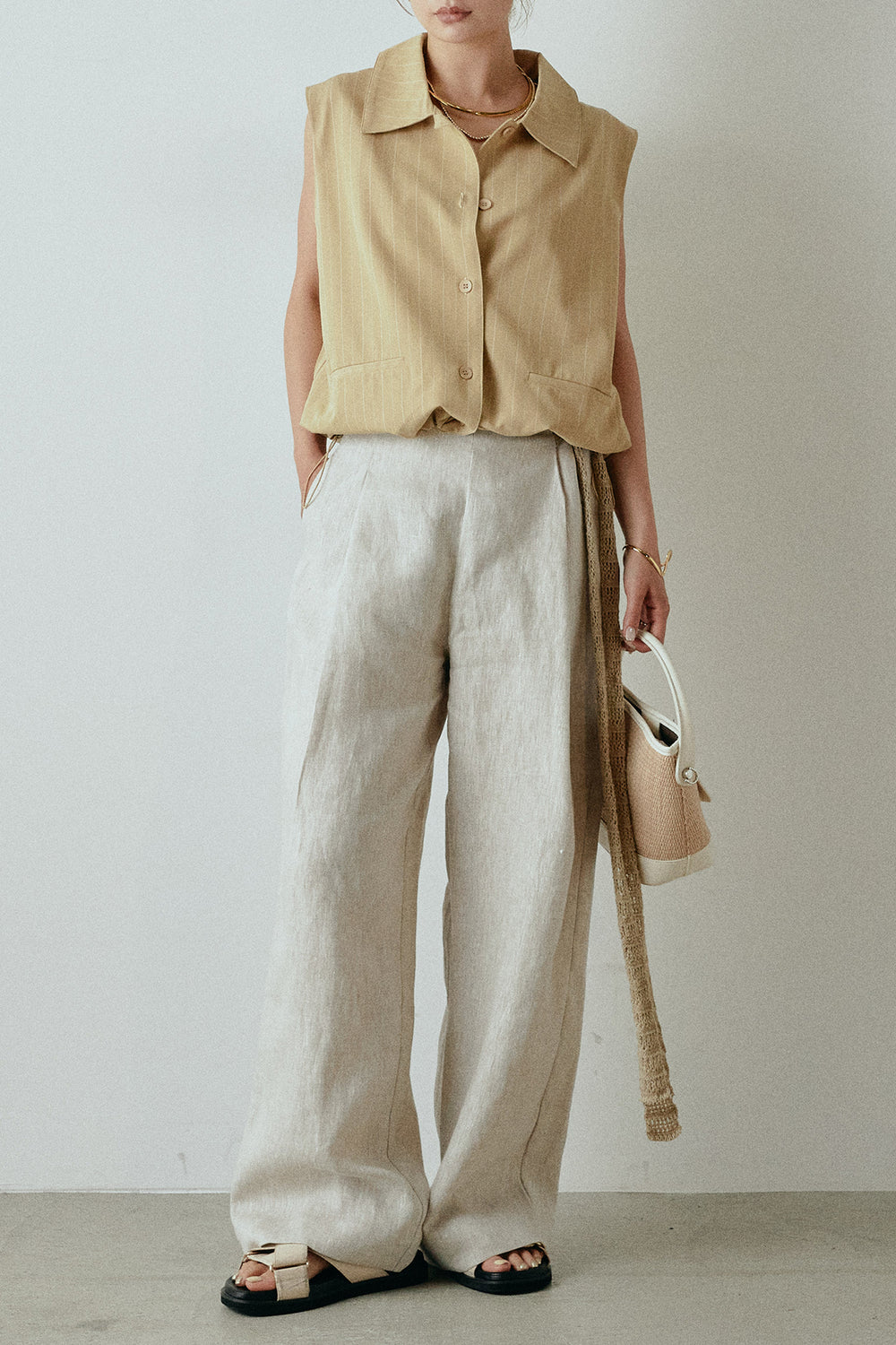 [SET]襟付きリネンジップベスト【麻100%】+リネンワイドパンツ【麻100%】(2set)