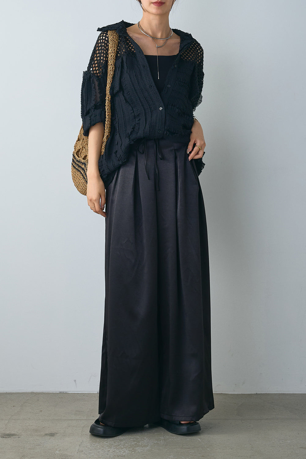 [SET]襟付きランダム編みトップス+紐付きタックサテンパンツ(2set)