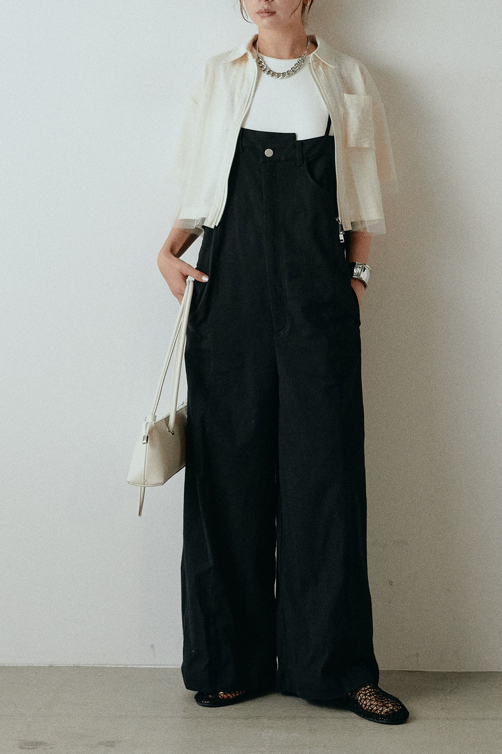 [SET]ギャザーネックウエスト巻きシアーシャツ+リネンライクビスチェ風サロペット(2set)
