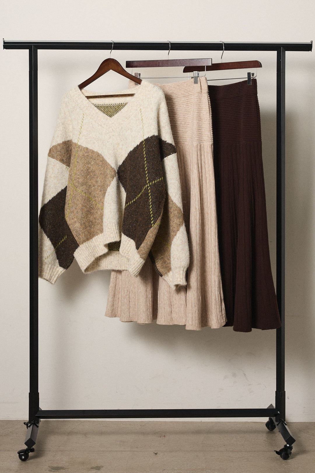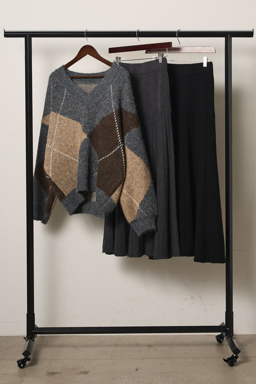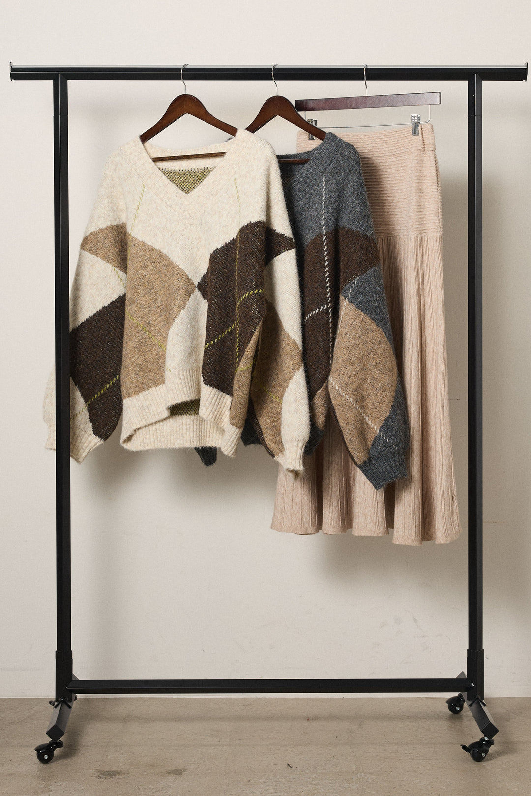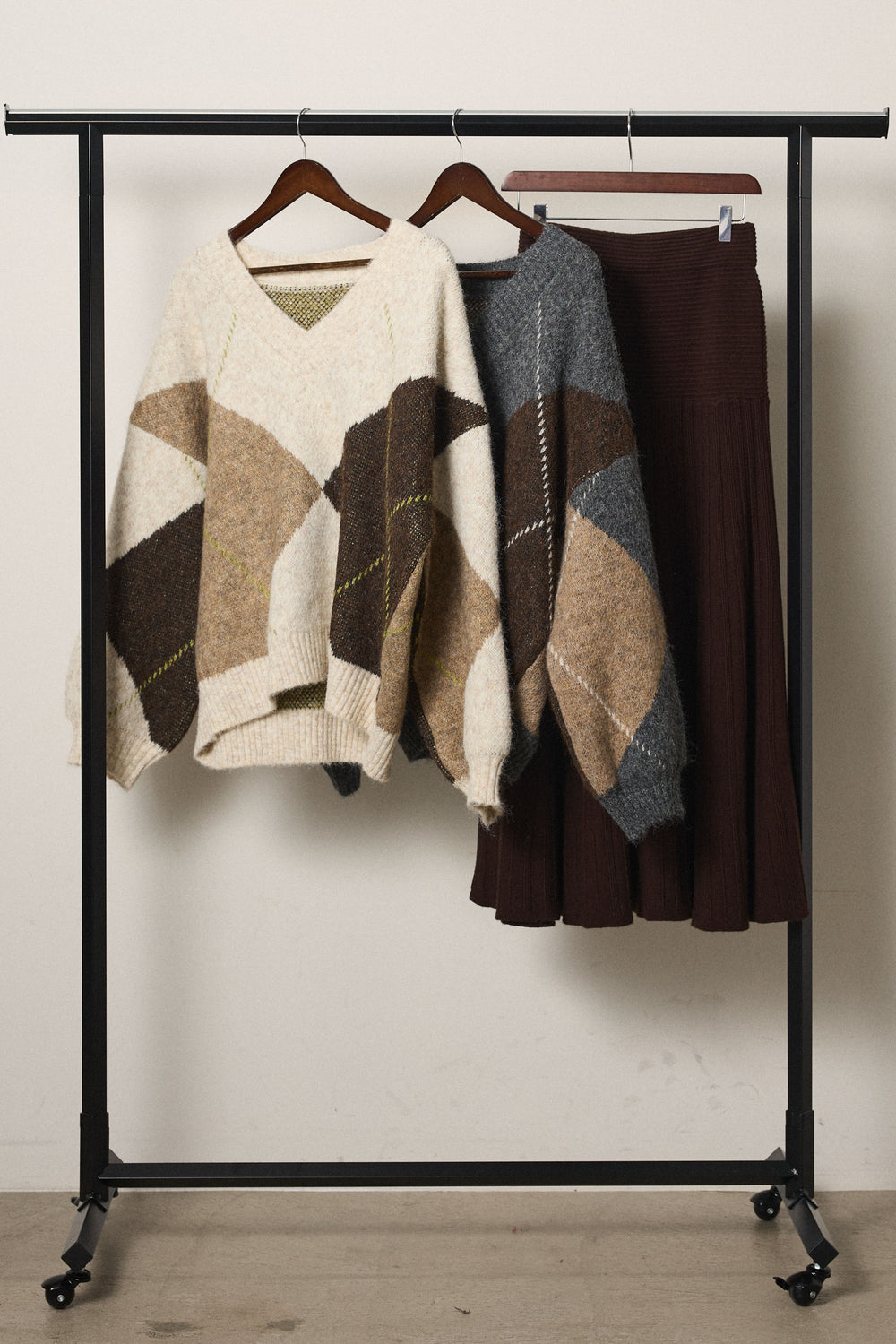 【着回しセット】[SET]ルーズアーガイルVネックニット+ルーズアーガイルVネックニット+編み地切り替えフレアニットスカート(3set)