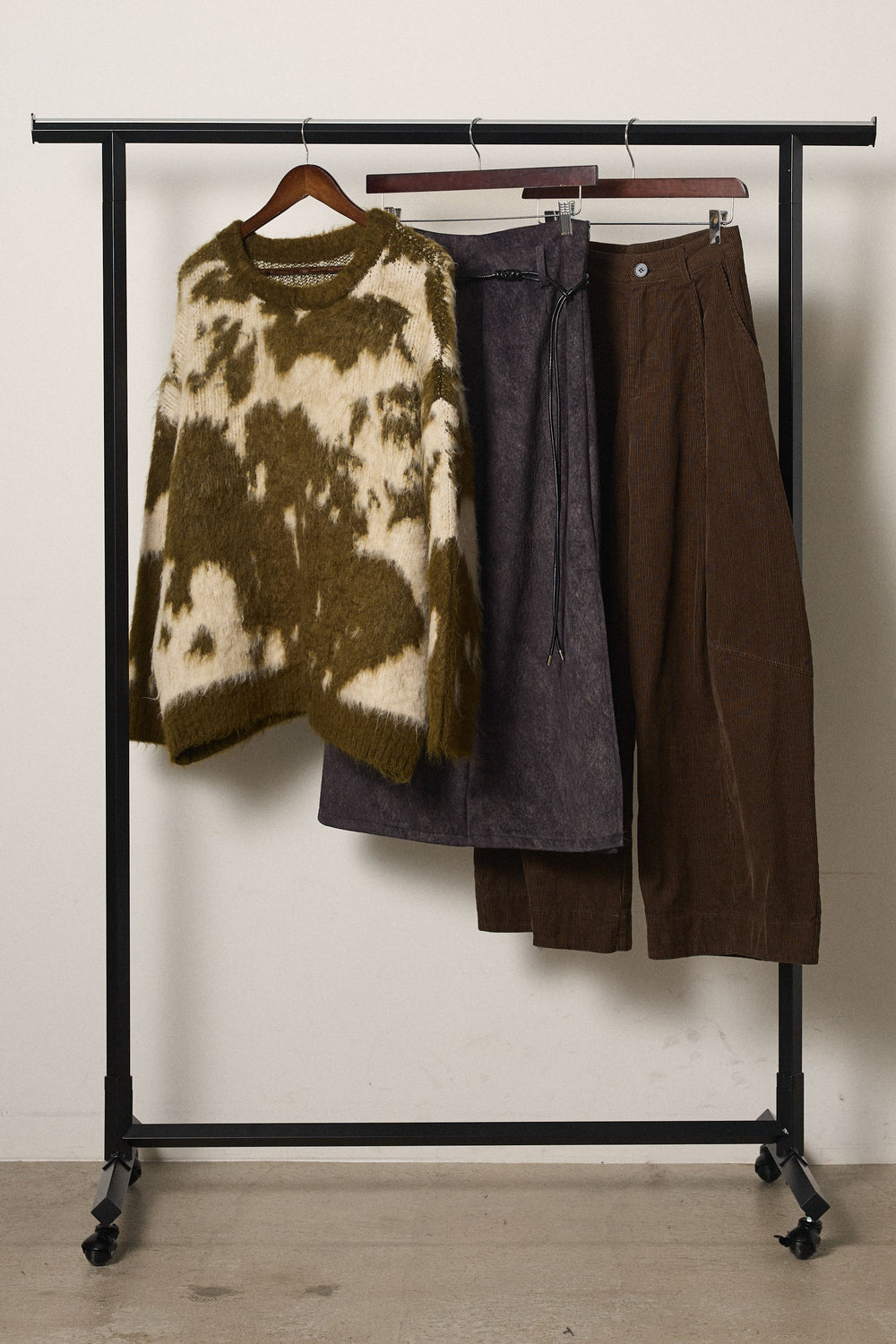 【着回しセット】[SET]モヘアタッチマーブルニット+タック入りコーデュロイワイドパンツ+ロープベルト付きスウェード調スカート(3set)