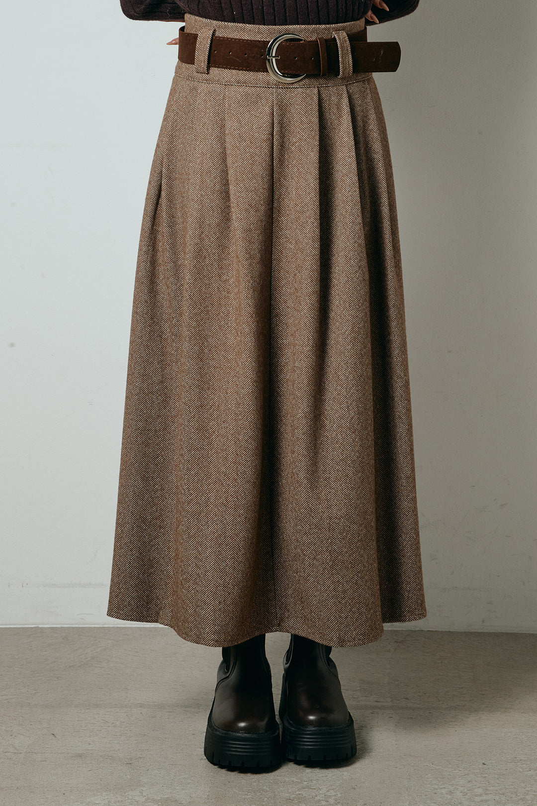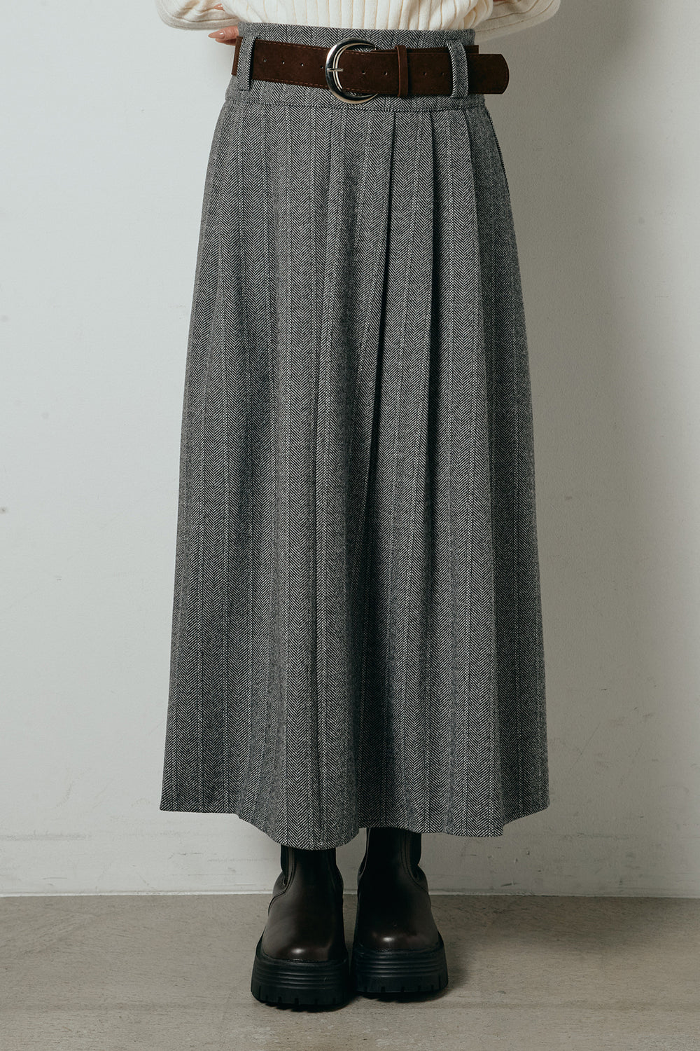 太ベルト付きヘリンボーンプリーツスカート