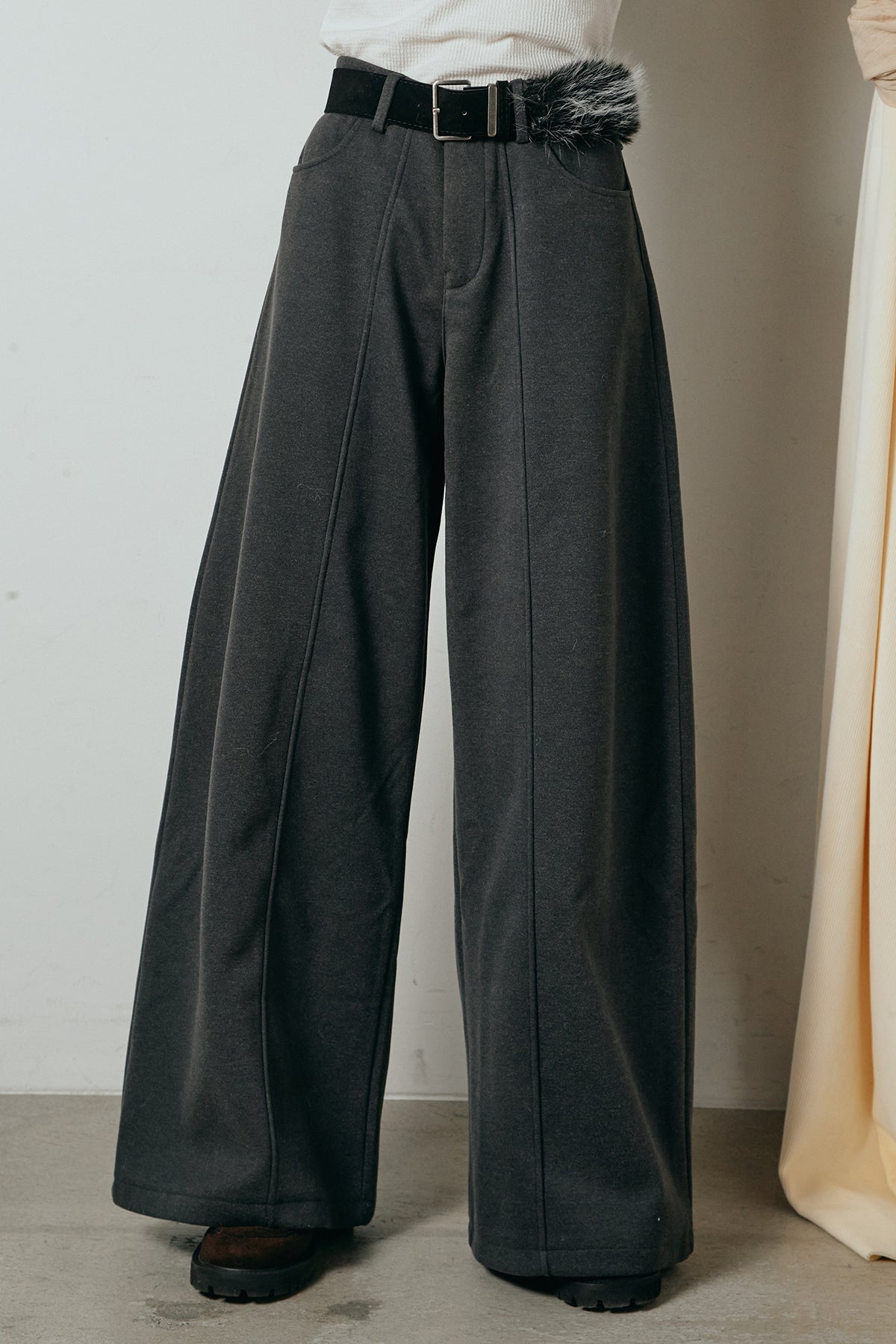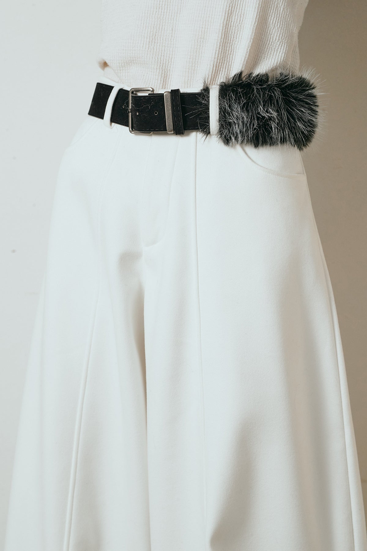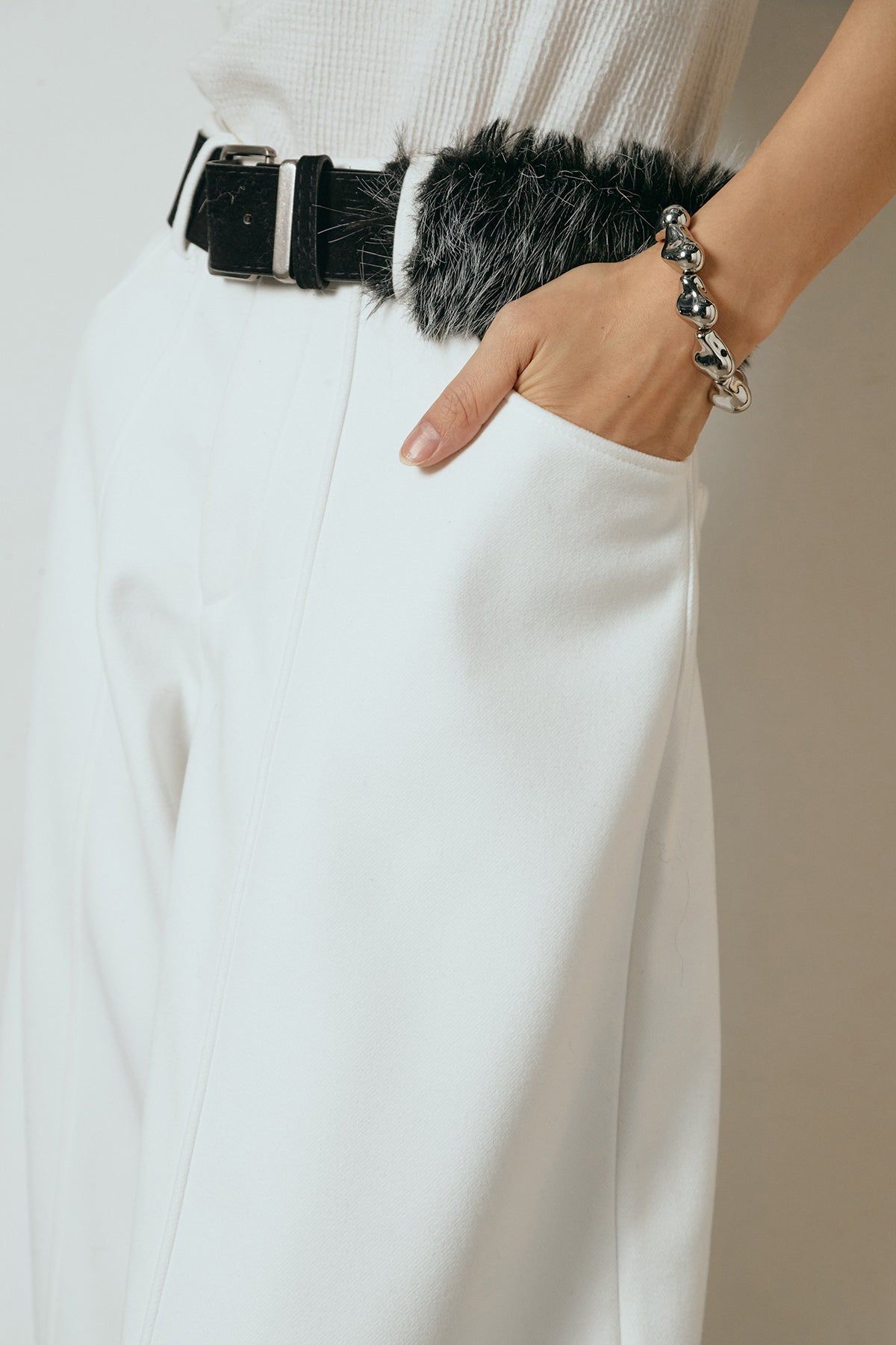 ファーをあしらったベルトがアクセントになるワイドパンツ。シンプルなシルエットに異素材のポイントを加えることで、コーディネートにさりげない遊び心をプラスします。すとんと落ちるラインで脚のラインをきれいに見せつつ、程よいゆとりで穿き心地も快適。トップスをインするだけで、スタイリングにメリハリが生まれる一本です。