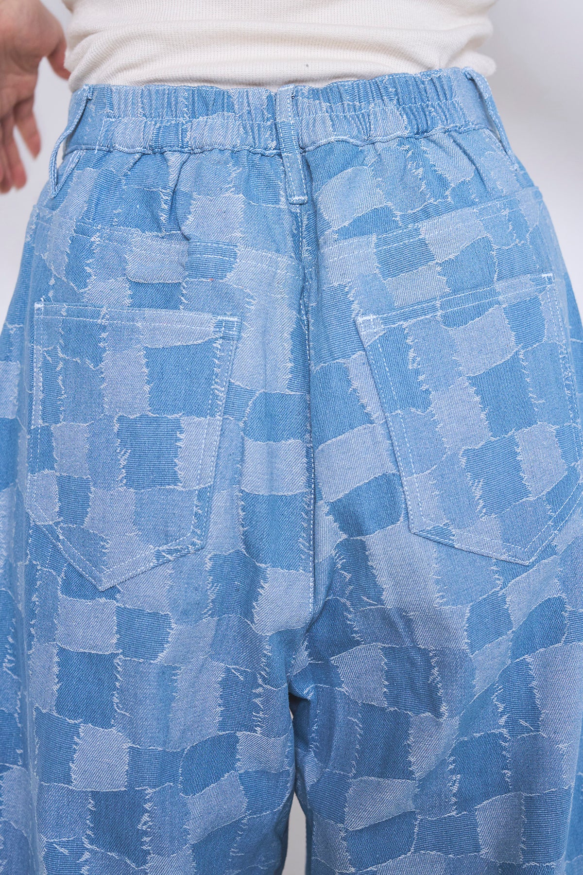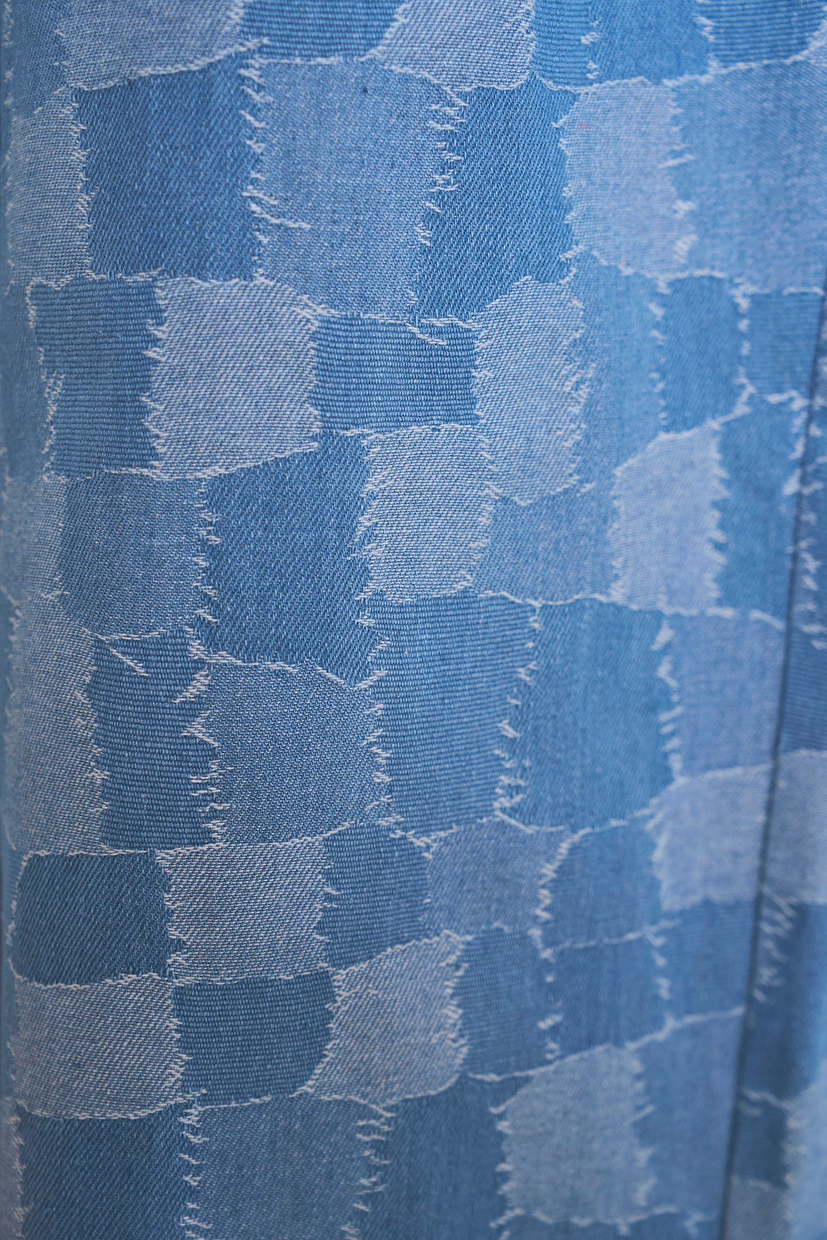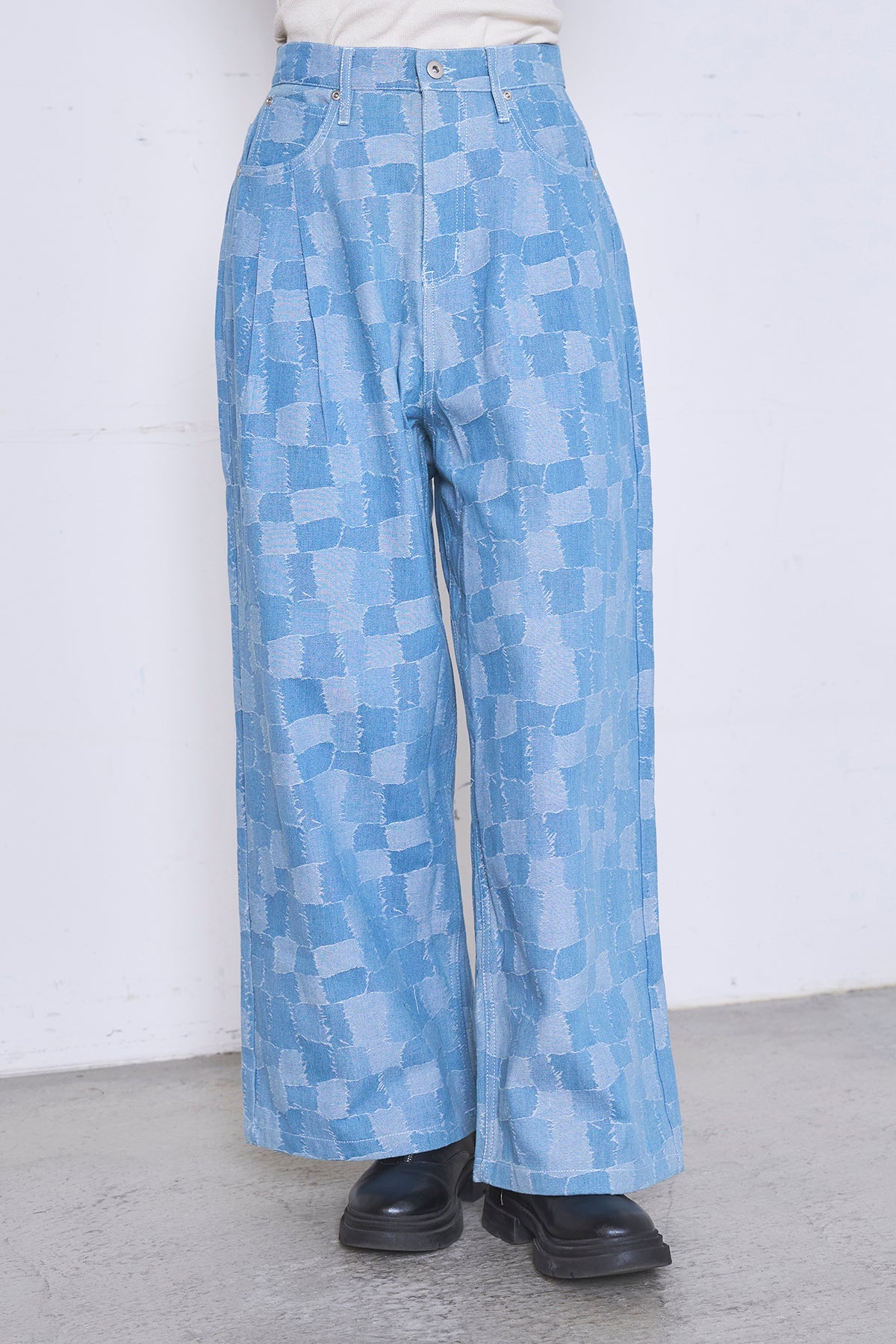 パッチワーク風のジャガード織りが目を惹く、存在感たっぷりのストレートデニム。異なるトーンのデニムを組み合わせたようなリメイク感のあるデザインが、いつものデニムスタイルに遊び心と奥行きをプラスします。 裾に向かってすとんと落ちるセミワイドなシルエットに、タックを施すことで、腰周りをすっきりと見せつつ脚長効果も実現。切りっぱなしのようなフリンジ状のディテールがアクセントとなり、ヴィンテージライクなこなれ感を演出します。程よい厚みのデニム生地を使用しているため、シーズンレスで活躍するのも嬉しいポイント。 シンプルなTシャツやスウェットと合わせてパンツを主役にするのはもちろん、シャツをタックインしてマニッシュに着こなすのもおすすめ。穿き込むほどに馴染む、大人のカジュアルスタイルに欠かせない一着です。