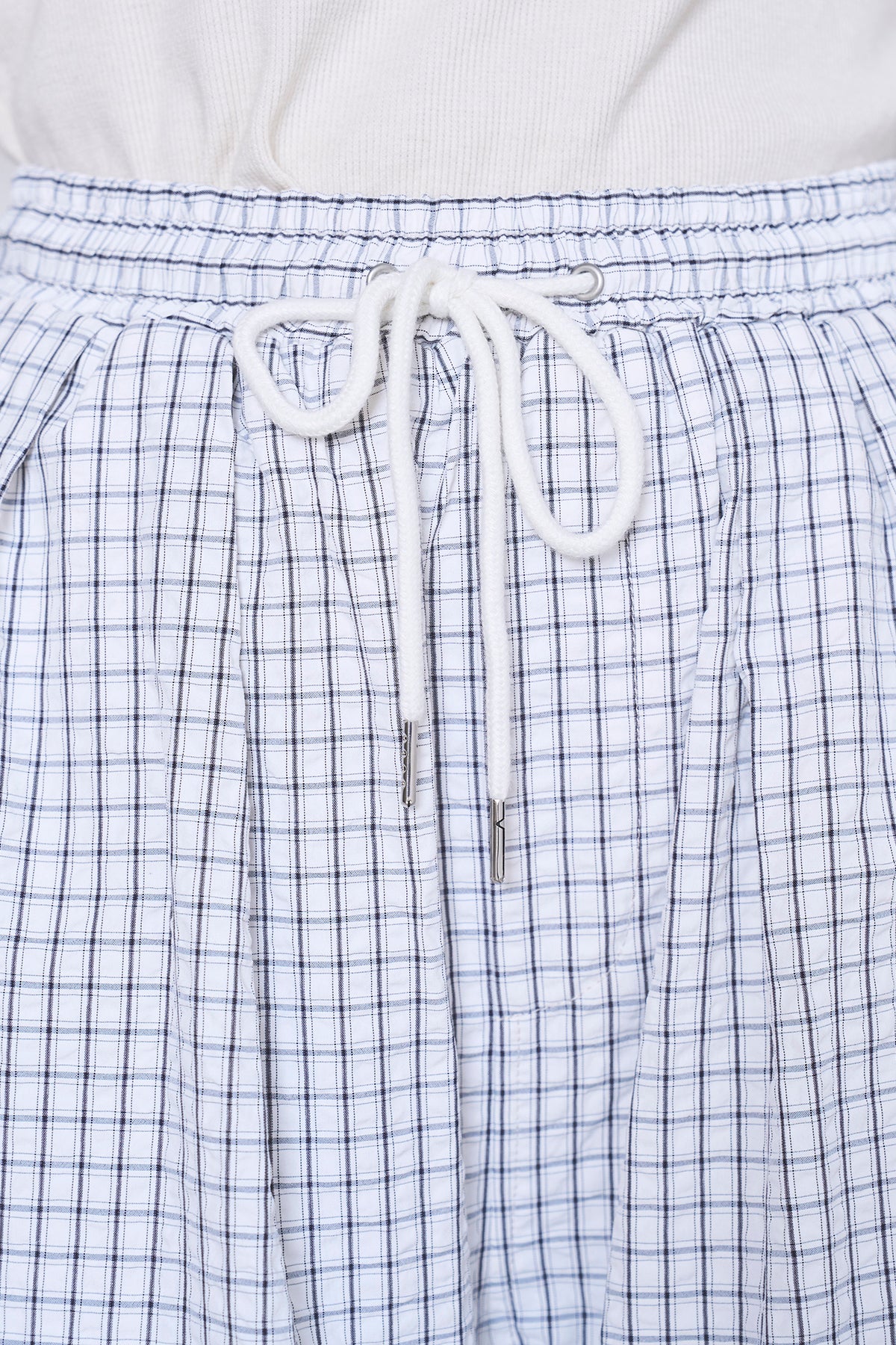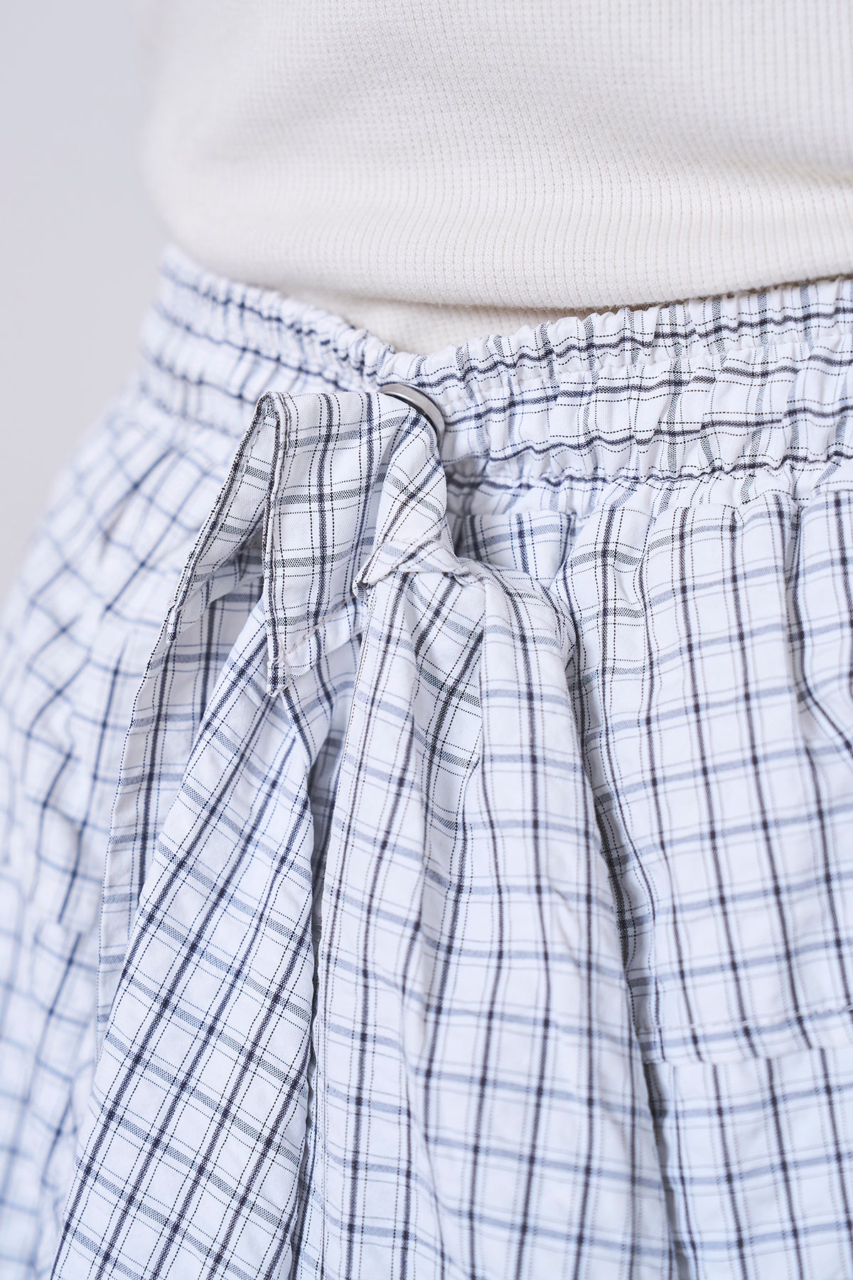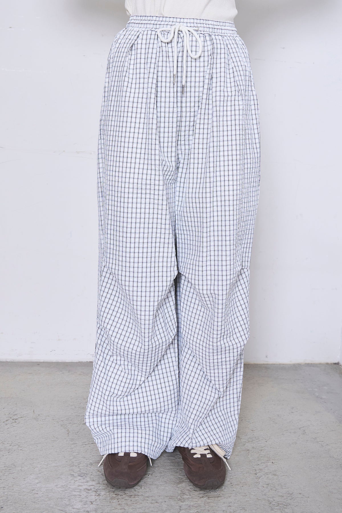 コーディネートに遊び心を添える、細やかなチェック柄が印象的なワイドパンツ。たっぷりとボリュームを持たせたワイドシルエットが、リラックス感漂う大人カジュアルな装いを叶えます。 ウエストは総ゴム仕様に加え、ドローストリングでサイズ調節が可能。ストレスフリーな穿き心地ながら、ハリのある素材感が立体的なフォルムをキープし、脚のラインを拾わずスマートに見せてくれます。切り替えデザインがさりげないアクセントとなり、シンプルなトップスと合わせるだけでトレンド感のあるスタイルが完成します。 コンパクトなTシャツでメリハリをつけたり、オーバーサイズのシャツを羽織ってゆるやかなルーズシルエットを楽しむのもおすすめ。デイリーに気兼ねなく取り入れられる、着回し力の高い一本です。