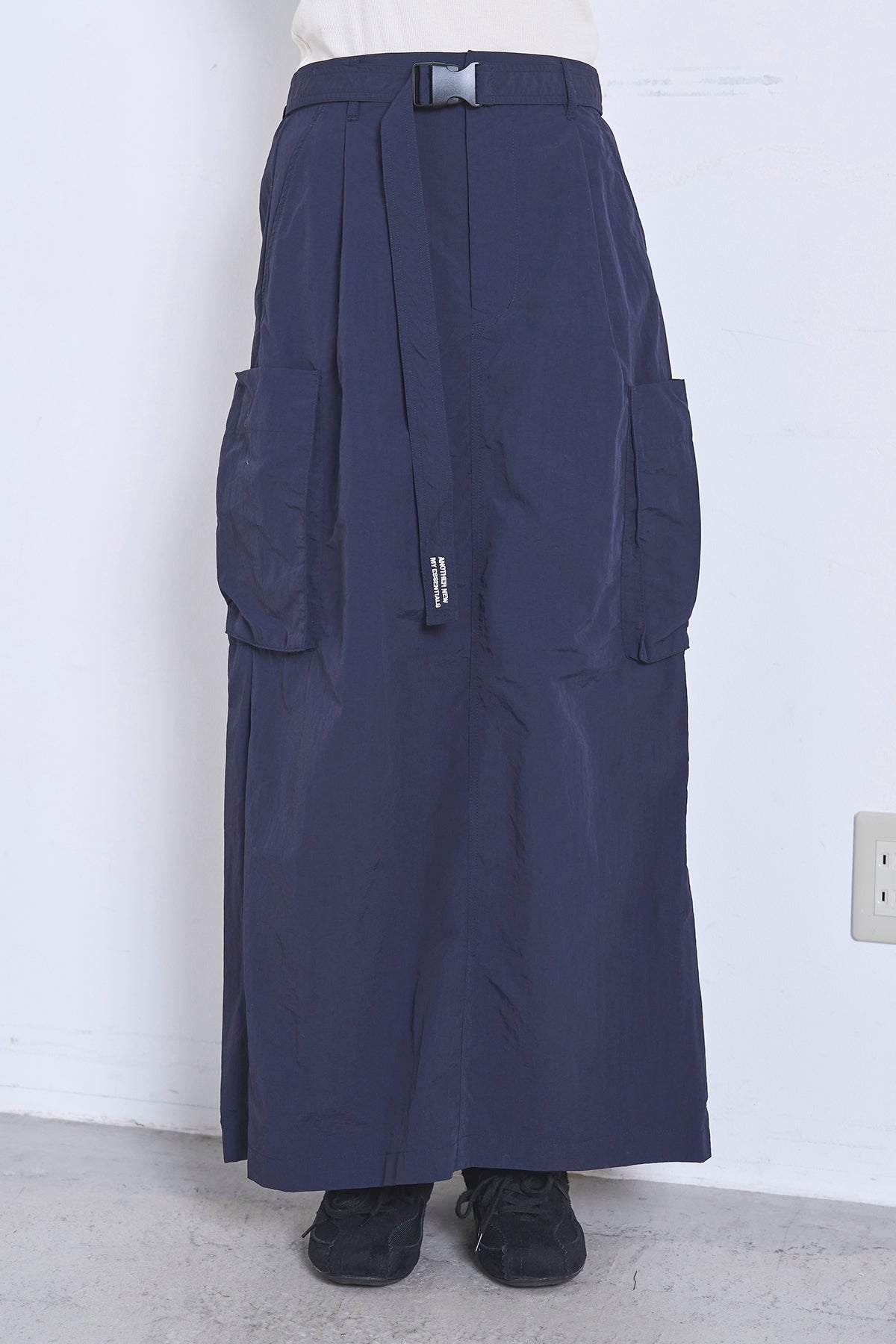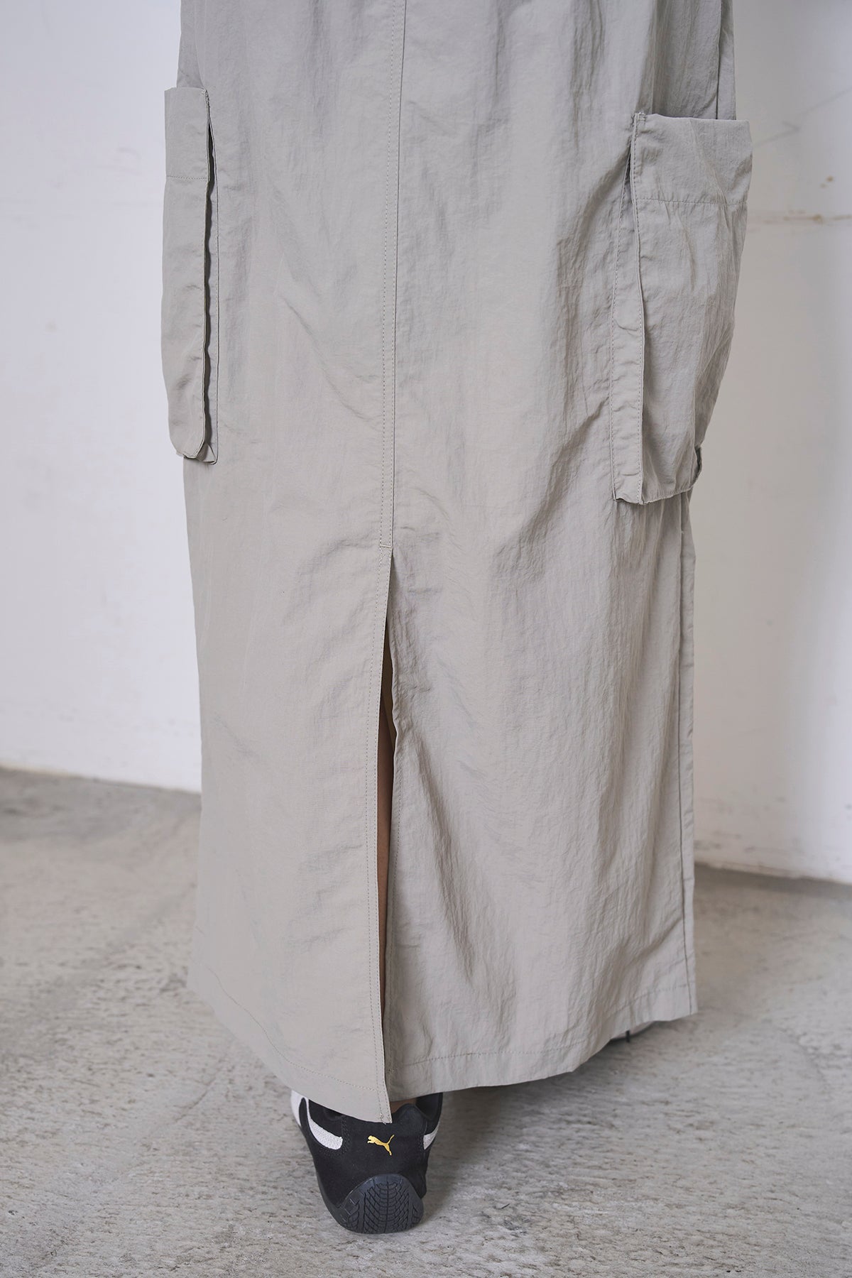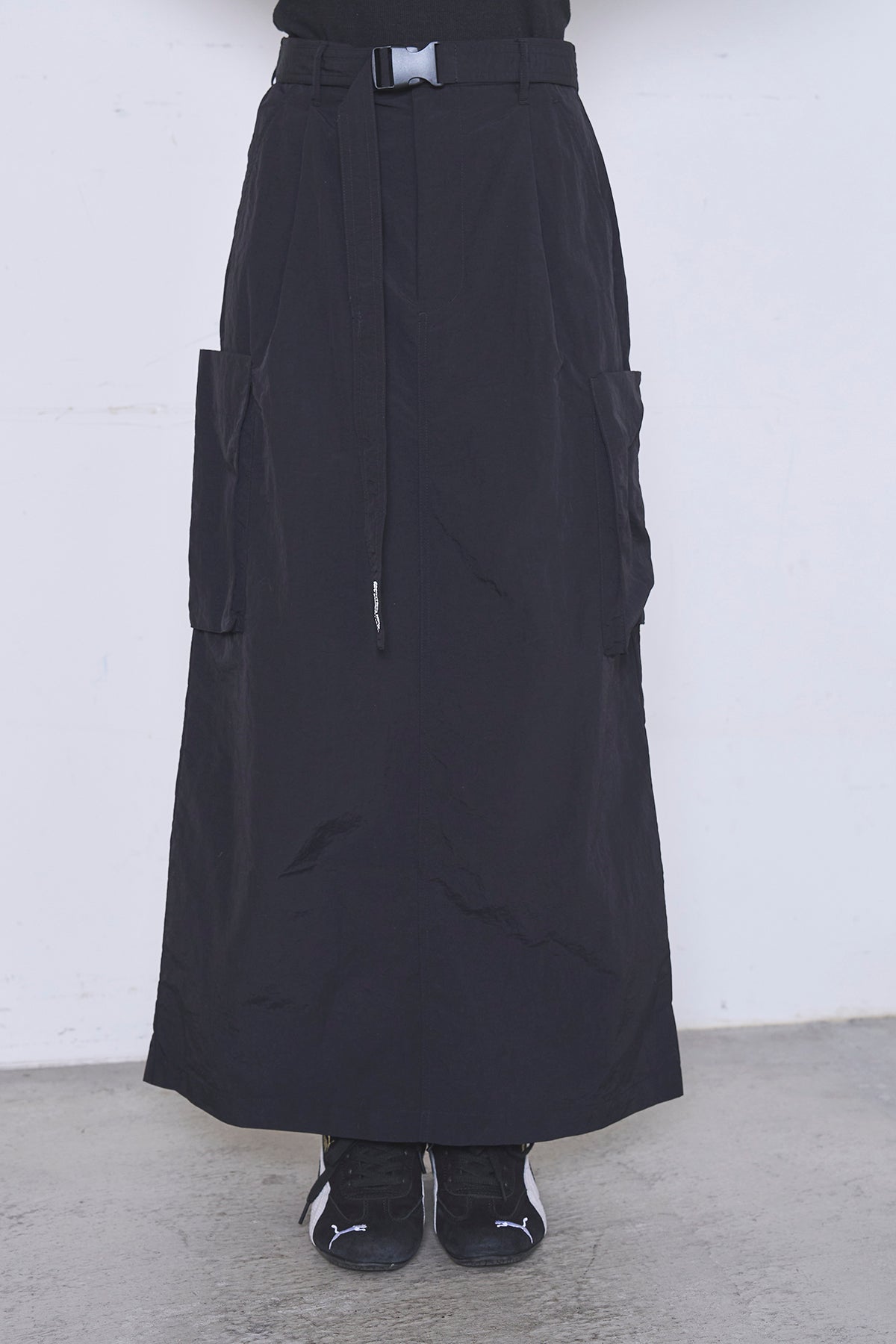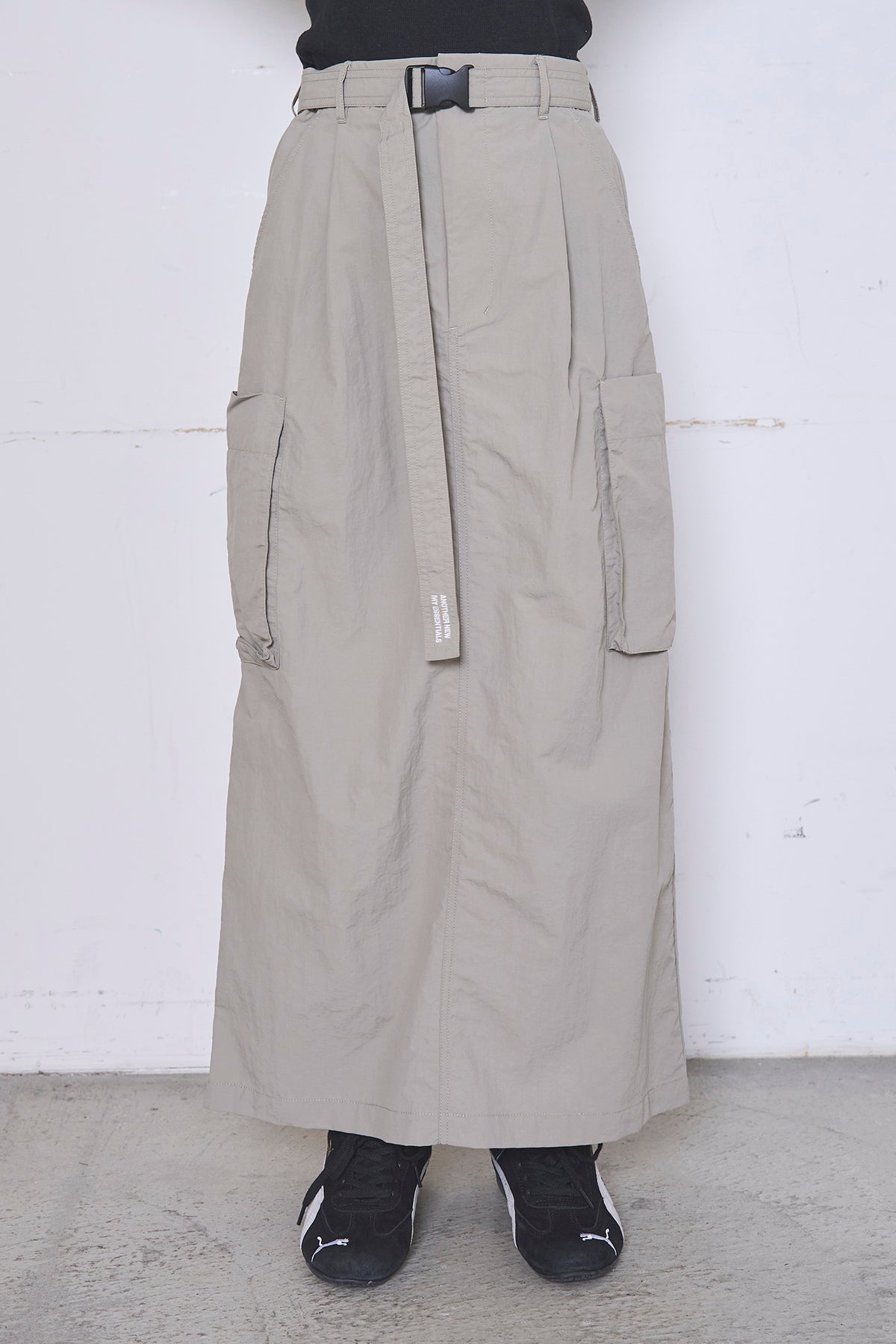 ワーク感のあるディテールをレディライクに落とし込んだ、ナイロンカーゴロングスカート。サイドの大きなフラップポケットがアクセントとなり、すとんと落ちるストレートシルエットが洗練された大人なミリタリースタイルを叶えます。 ウエストにはワンタッチで着脱できるガチャベルトをあしらい、長めに垂らしたベルトが縦のラインを強調。シャリ感のあるマットな素材を採用することで、カジュアルになりすぎず、品の良い都会的な印象に仕上げました。バックスリット入りで足さばきも良く、機能性とデザイン性を両立した一枚です。