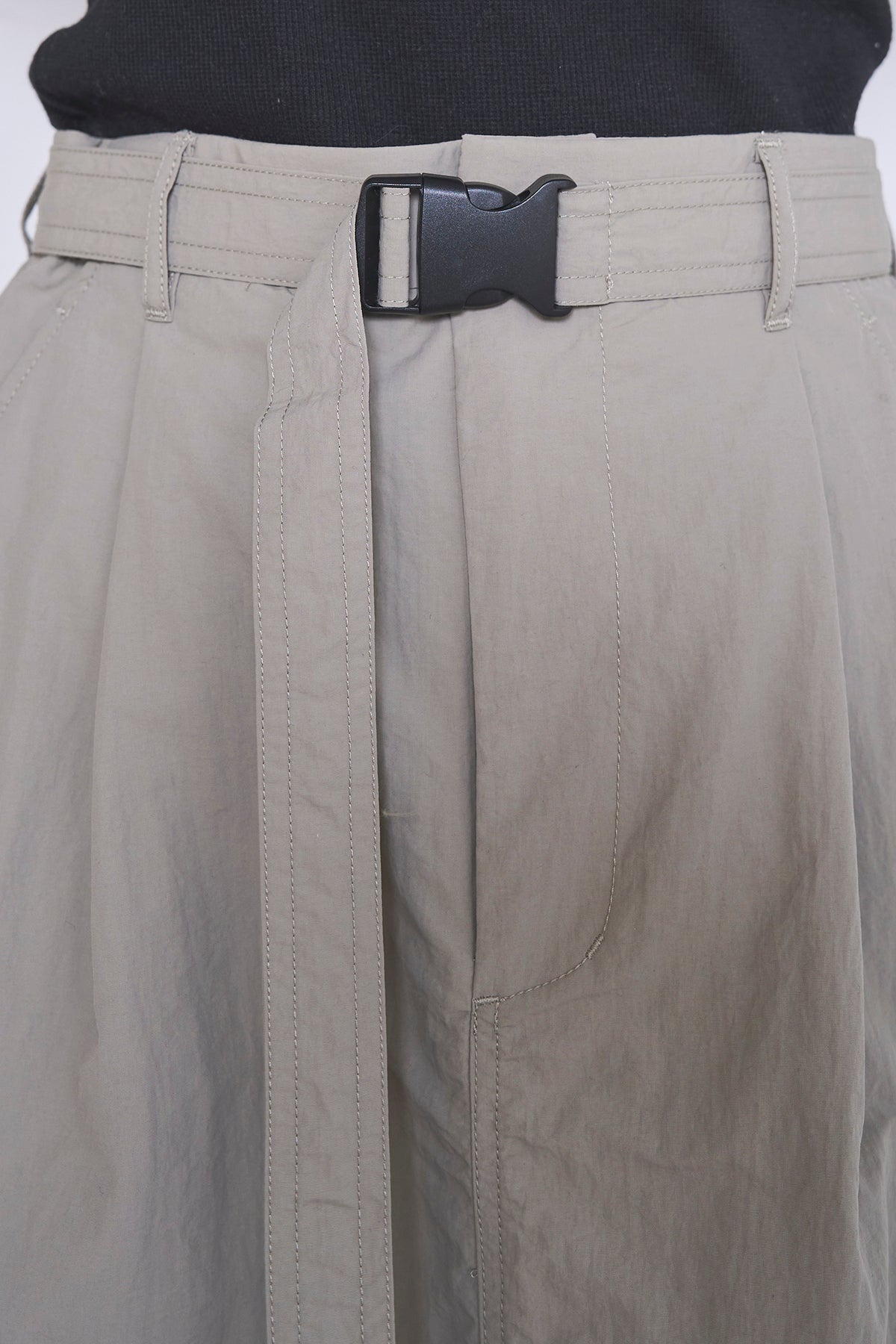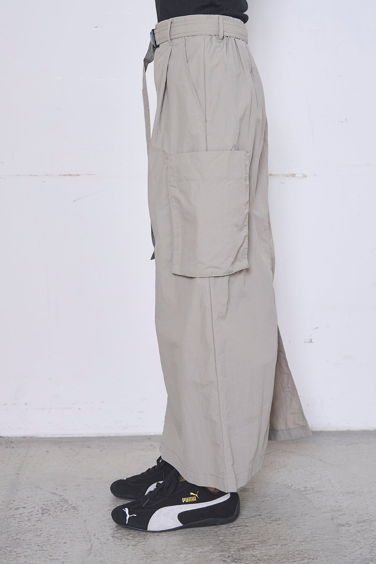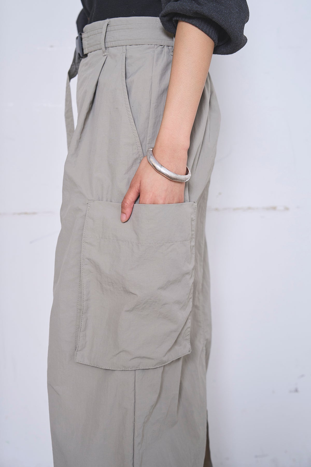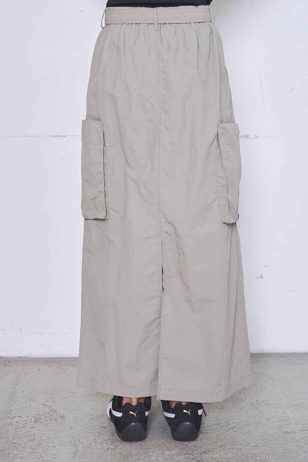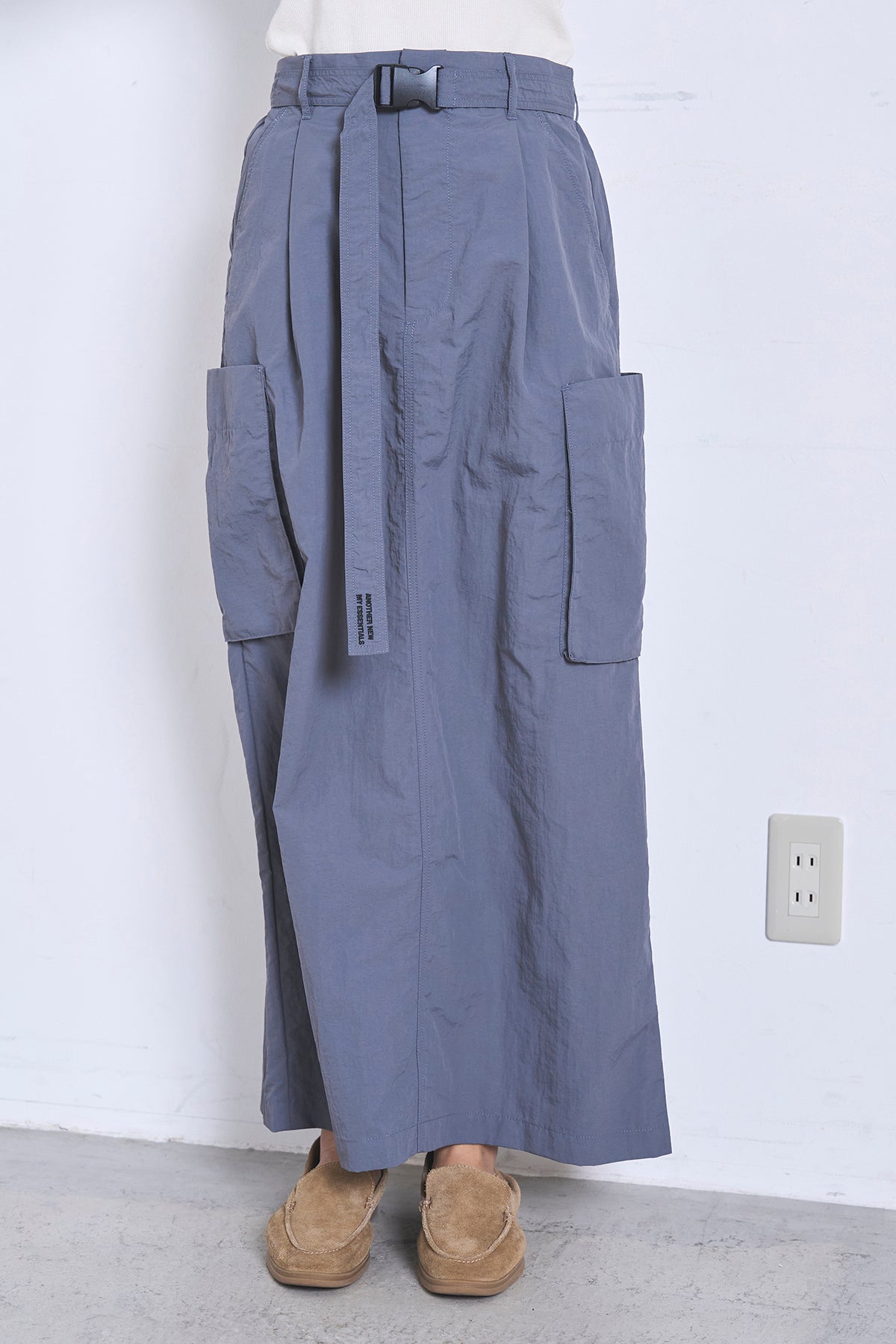 ワーク感のあるディテールをレディライクに落とし込んだ、ナイロンカーゴロングスカート。サイドの大きなフラップポケットがアクセントとなり、すとんと落ちるストレートシルエットが洗練された大人なミリタリースタイルを叶えます。 ウエストにはワンタッチで着脱できるガチャベルトをあしらい、長めに垂らしたベルトが縦のラインを強調。シャリ感のあるマットな素材を採用することで、カジュアルになりすぎず、品の良い都会的な印象に仕上げました。バックスリット入りで足さばきも良く、機能性とデザイン性を両立した一枚です。
