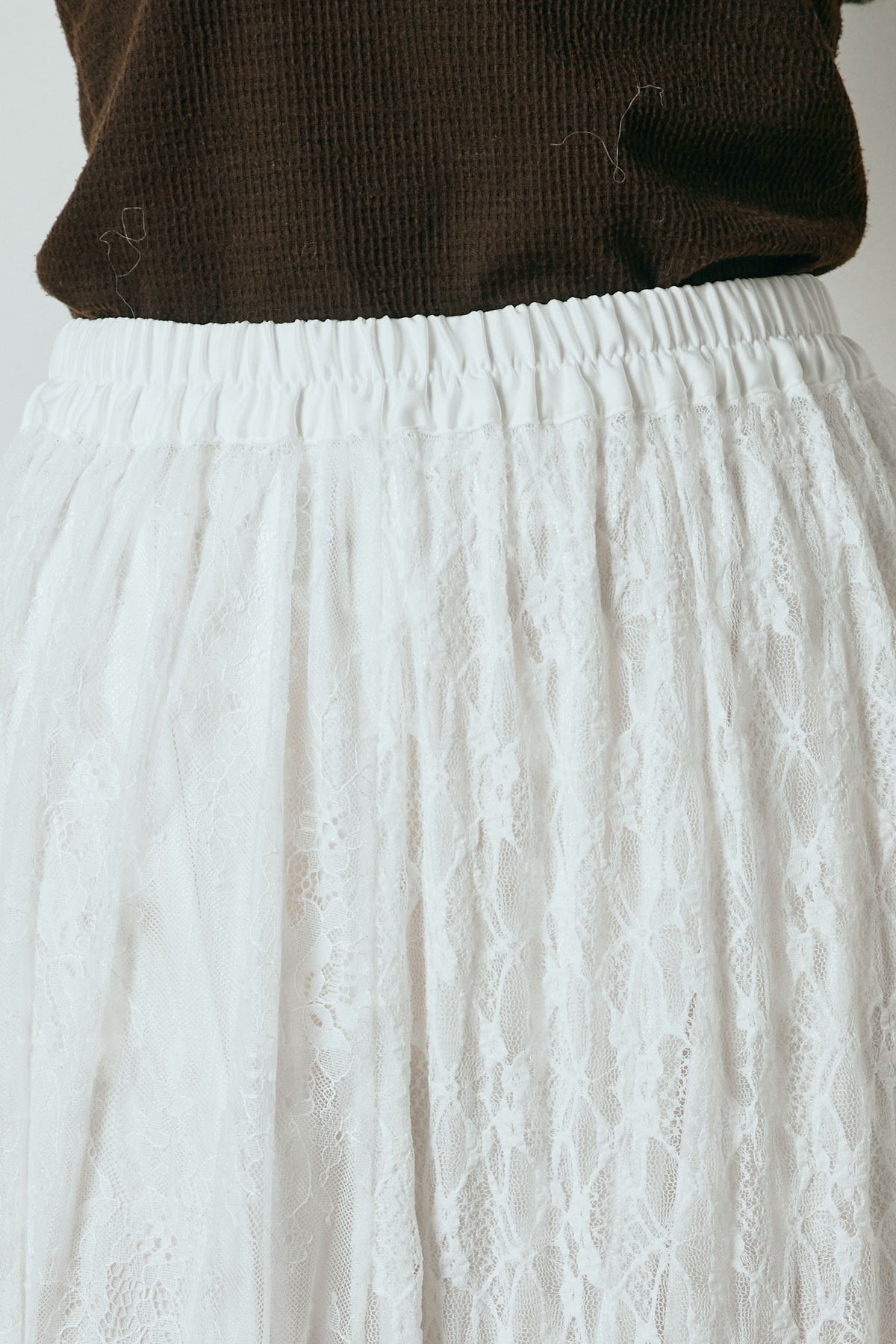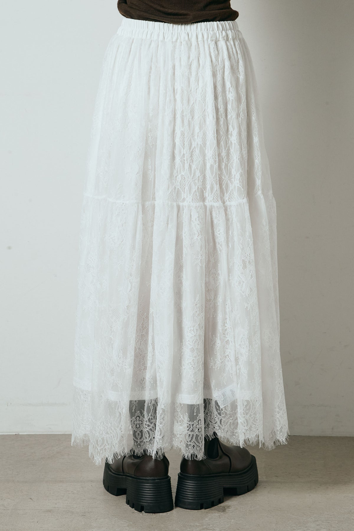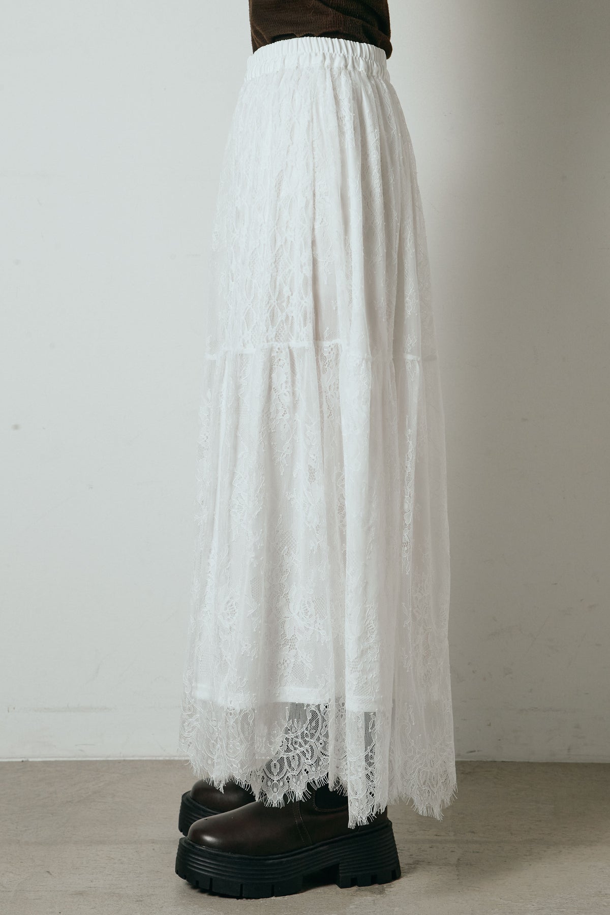 繊細なレース素材を贅沢に使用し、裾にひげレースをあしらったロング丈スカート。切り替えデザインが軽やかな動きを生み、歩くたびに表情のあるシルエットを演出します。ウエストはゴム仕様で穿き心地も快適。ニットやスウェットなどカジュアルなトップスとも好相性で、スタイリングにさりげない甘さを添える一枚です。