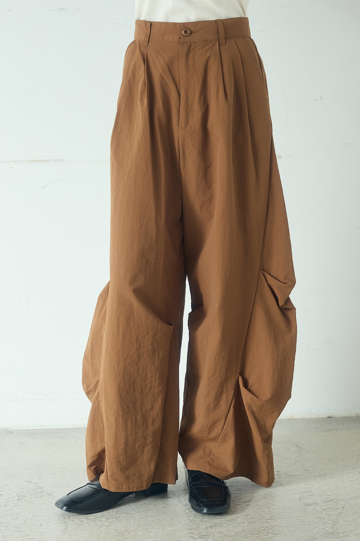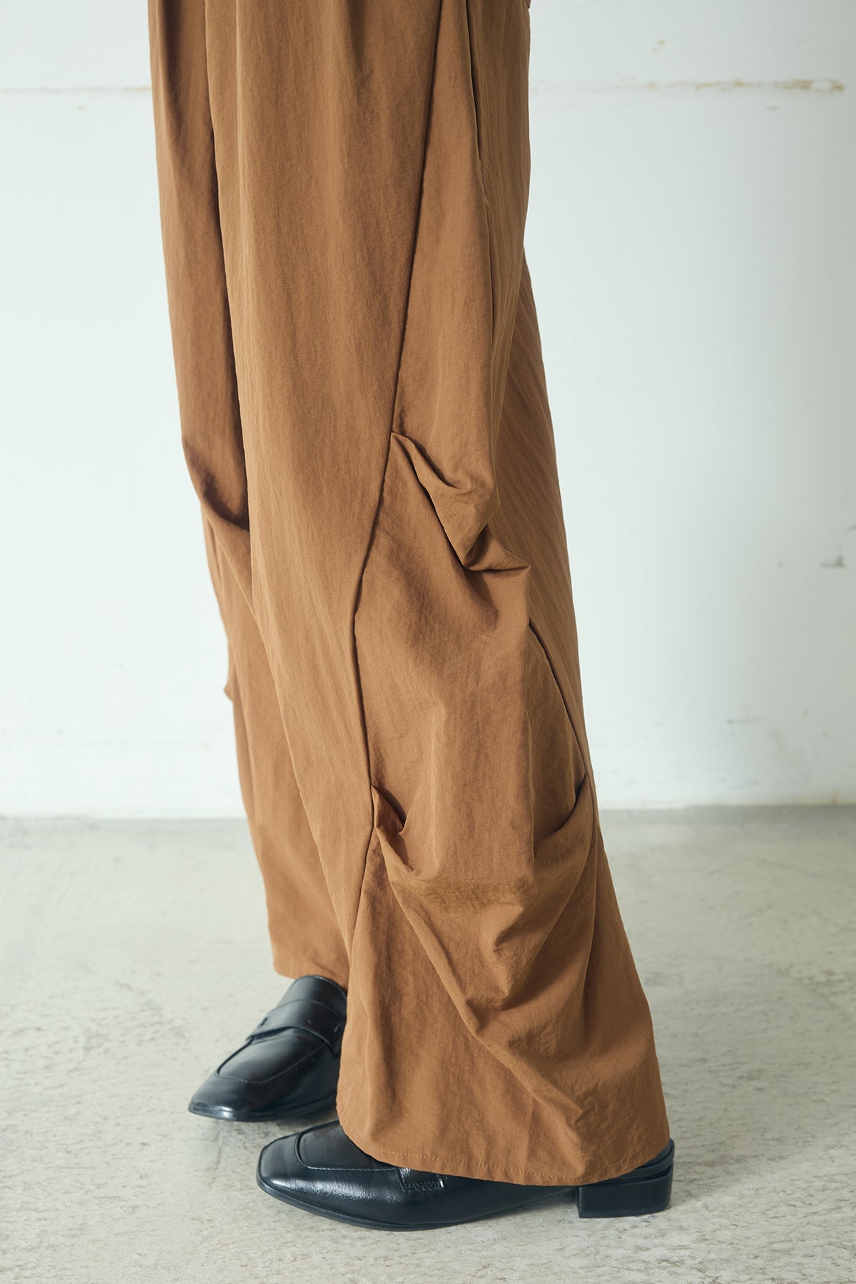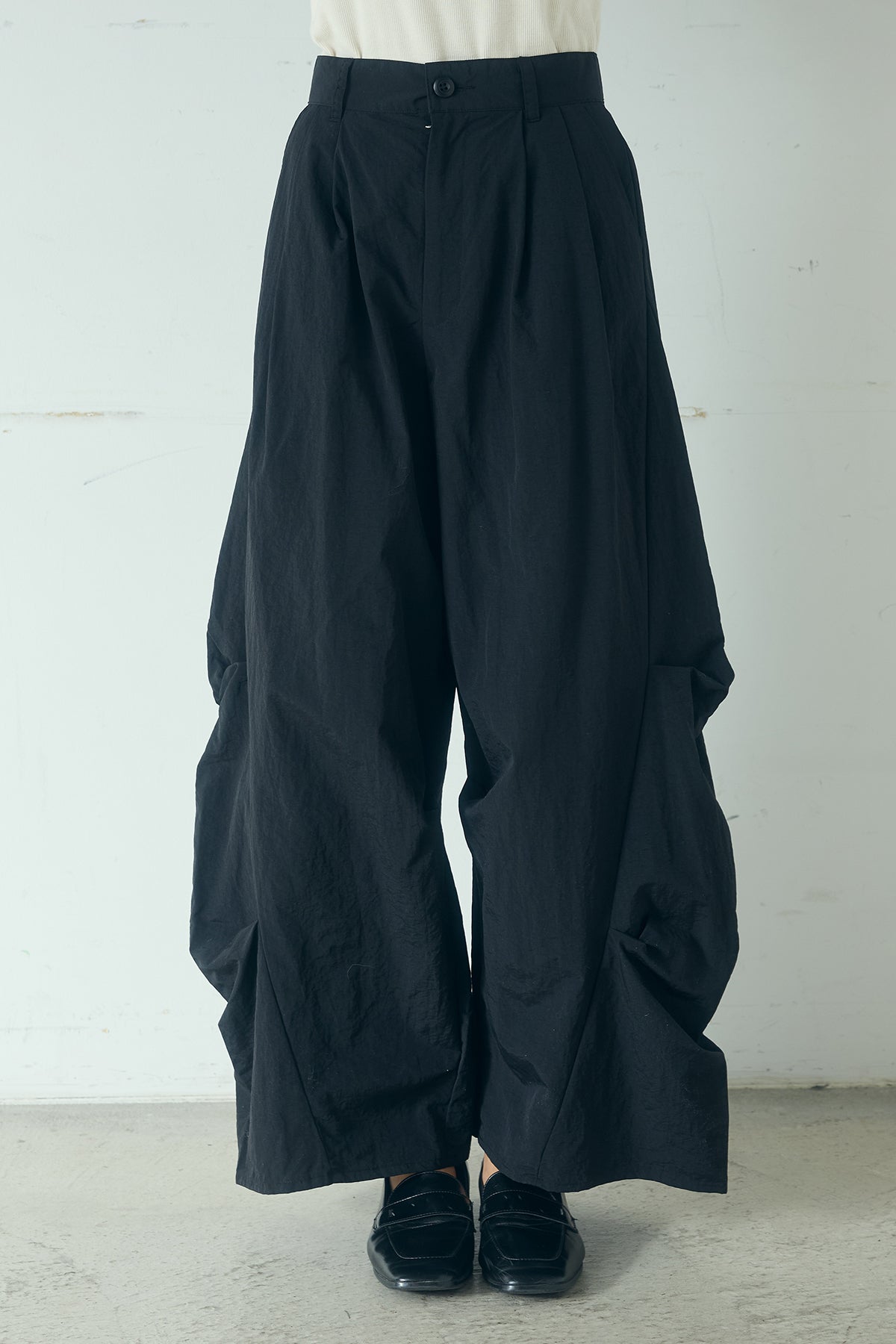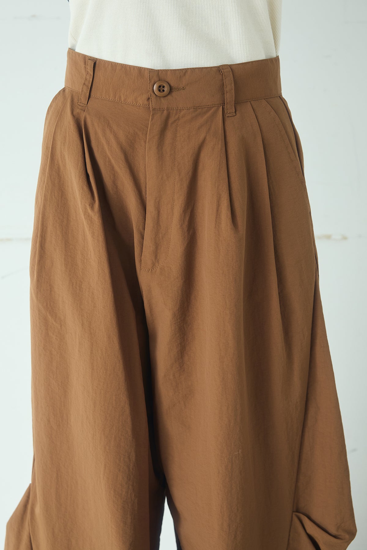立体的なシルエットが目を惹く、タックデザインのバレルパンツ。 ボリューム感のあるフォルムがスタイリングに奥行きを生み出し、シンプルな装いにモードなアクセントを添えてくれる一着です。 軽やかでハリ感のあるドライタフタ素材を使用し、立体的なシルエットを美しくキープ。 フロントのタックとサイドに施された立体的なディテールが、程よいボリューム感と動きのある表情を演出します。 ゆとりのあるシルエットながらも、ウエスト周りはすっきりとした設計でバランスの良い仕上がりに。 コンパクトなトップスやベスト、シャツなどと合わせることで、メリハリのあるスタイリングが完成します。 シンプルなスタイリングに遊び心をプラスし、都会的でこなれたムードを演出してくれる主役級のアイテムです。