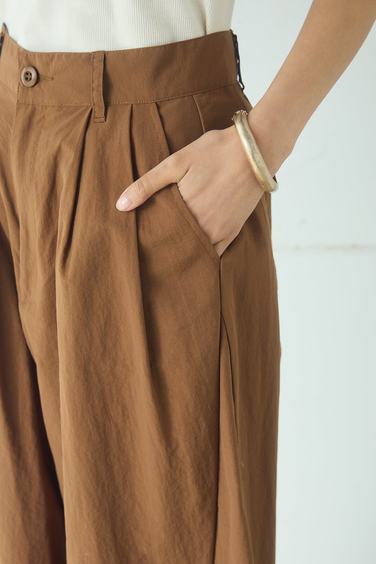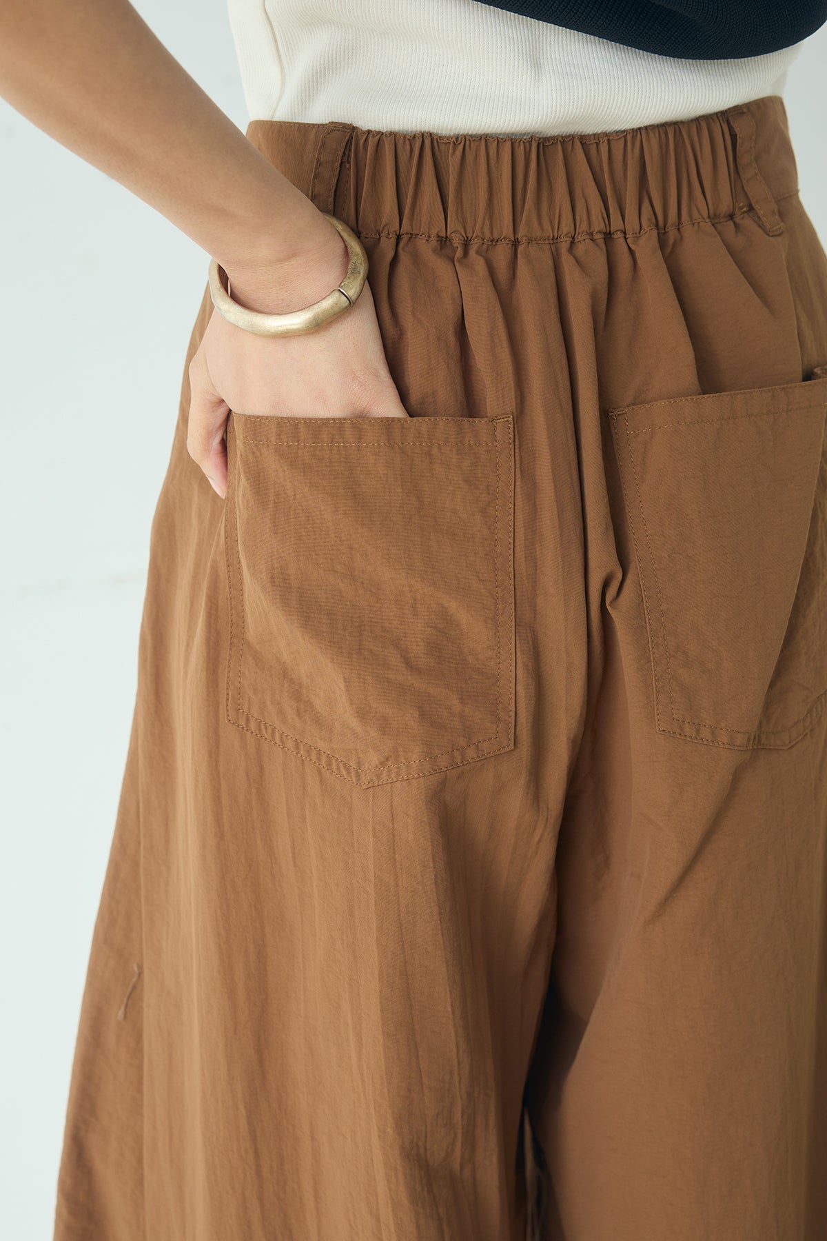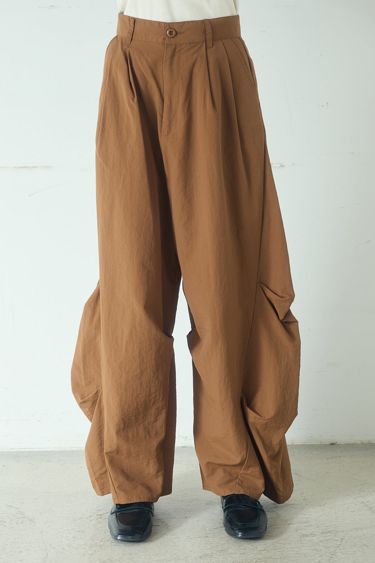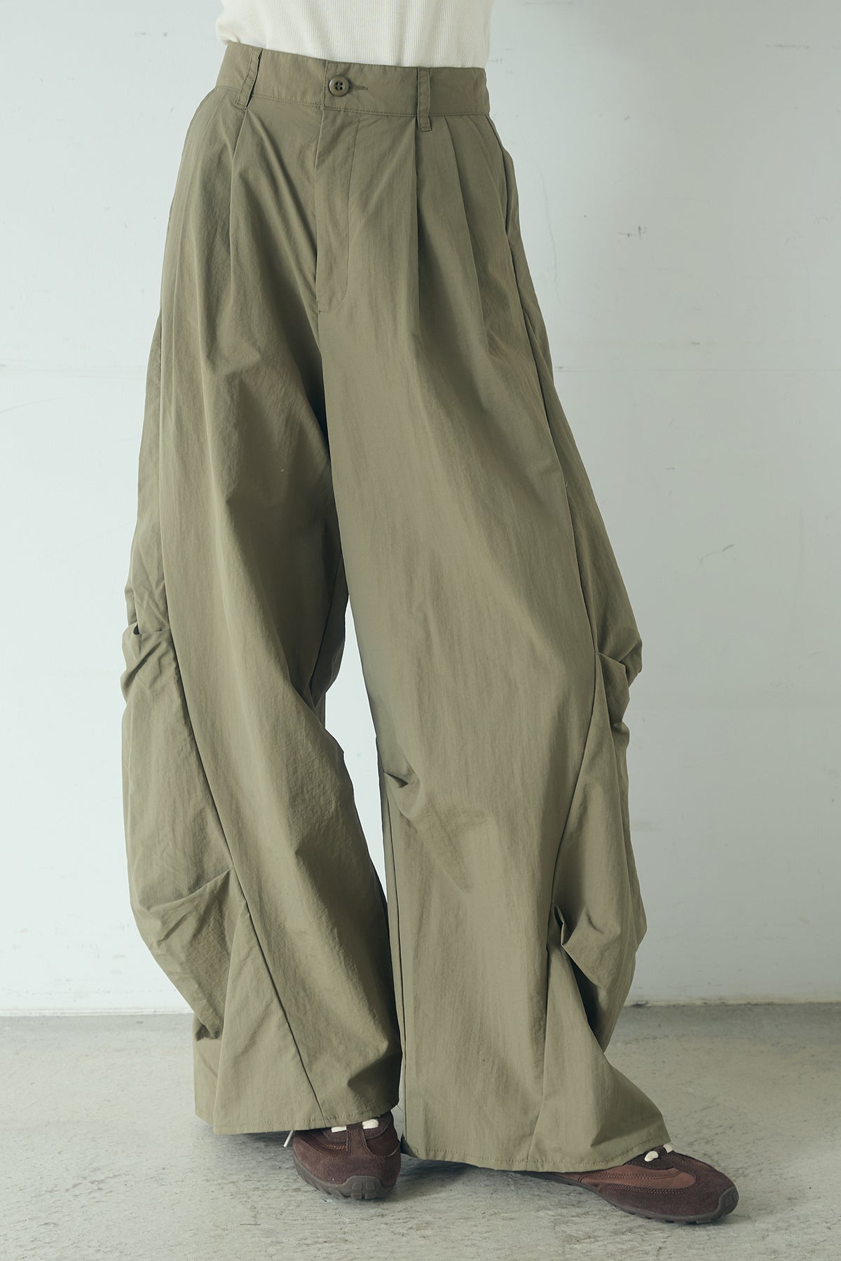 立体的なシルエットが目を惹く、タックデザインのバレルパンツ。 ボリューム感のあるフォルムがスタイリングに奥行きを生み出し、シンプルな装いにモードなアクセントを添えてくれる一着です。 軽やかでハリ感のあるドライタフタ素材を使用し、立体的なシルエットを美しくキープ。 フロントのタックとサイドに施された立体的なディテールが、程よいボリューム感と動きのある表情を演出します。 ゆとりのあるシルエットながらも、ウエスト周りはすっきりとした設計でバランスの良い仕上がりに。 コンパクトなトップスやベスト、シャツなどと合わせることで、メリハリのあるスタイリングが完成します。 シンプルなスタイリングに遊び心をプラスし、都会的でこなれたムードを演出してくれる主役級のアイテムです。
