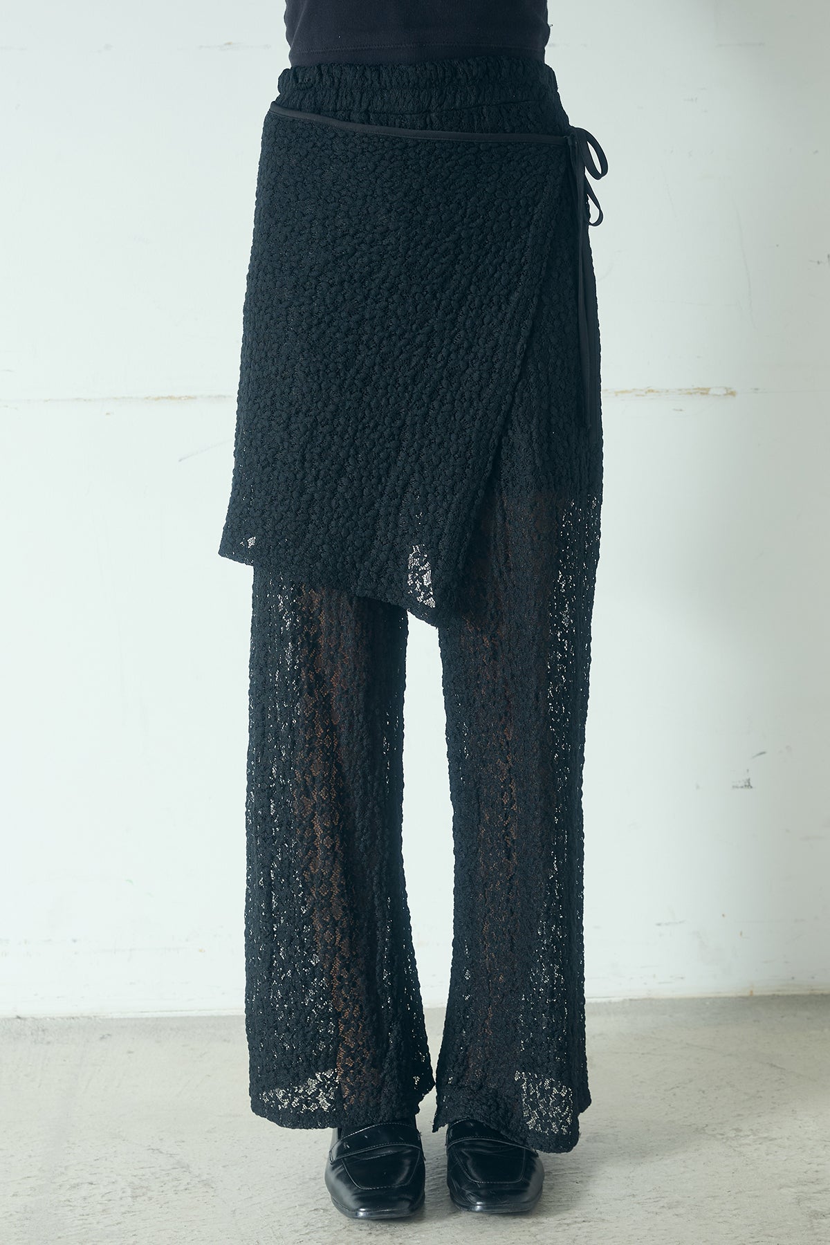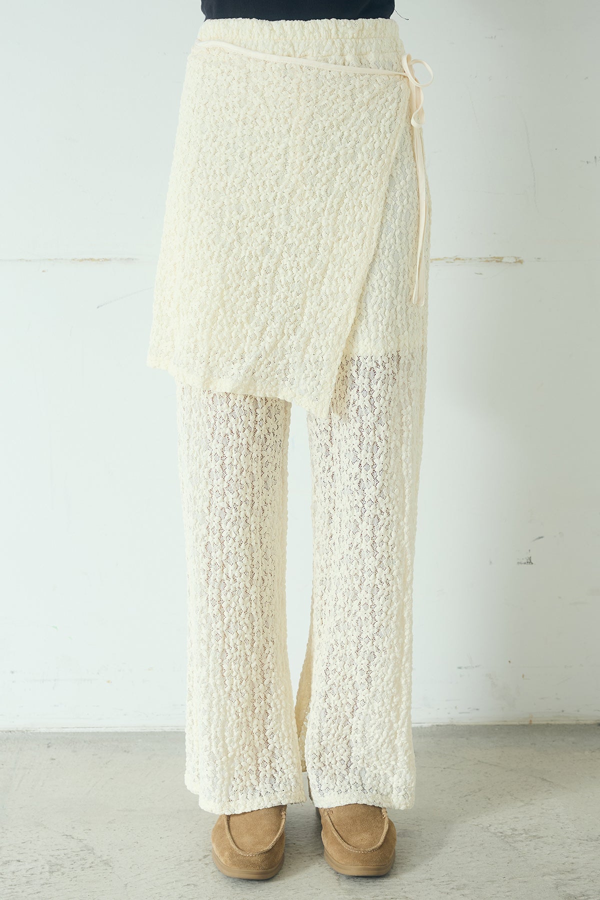 繊細なレース素材が目を惹く、パンツとラップスカートがセットになったレイヤードアイテム。 重ねて着ることで生まれる立体感がスタイリングに奥行きを与え、シンプルな装いをぐっと印象的に仕上げてくれます。 柔らかなストレッチレースを使用しており、軽やかで快適な履き心地も魅力。 程よくフィットしながらもすっきりと見えるシルエットで、女性らしい抜け感のあるスタイルを演出します。 セットのラップスカートはウエストのリボンで調整が可能で、レイヤードするだけでこなれたバランスに。 パンツ単体で着用したり、他のボトムスと組み合わせたりと、幅広いスタイリングを楽しめます。 シンプルなスタイリングに遊び心をプラスし、都会的でこなれたムードを演出してくれる主役級のアイテムです。