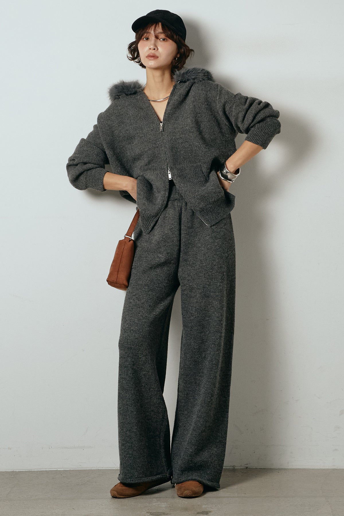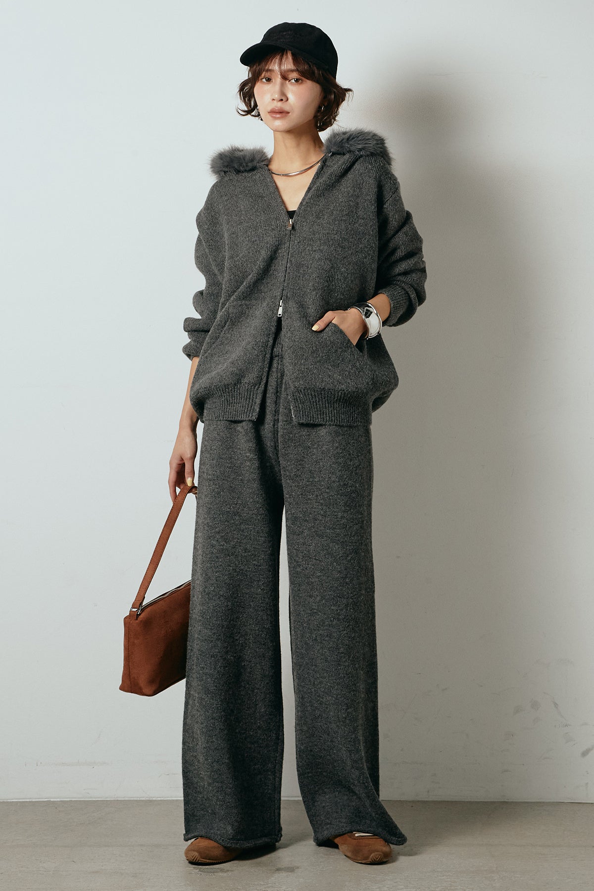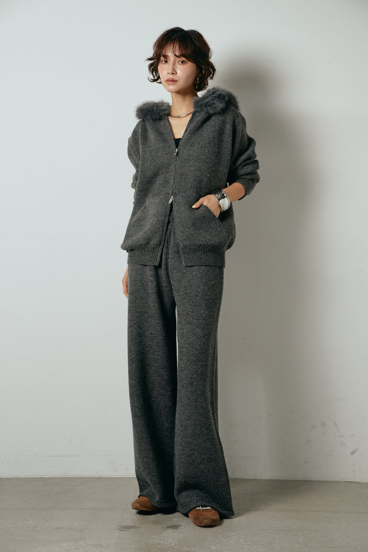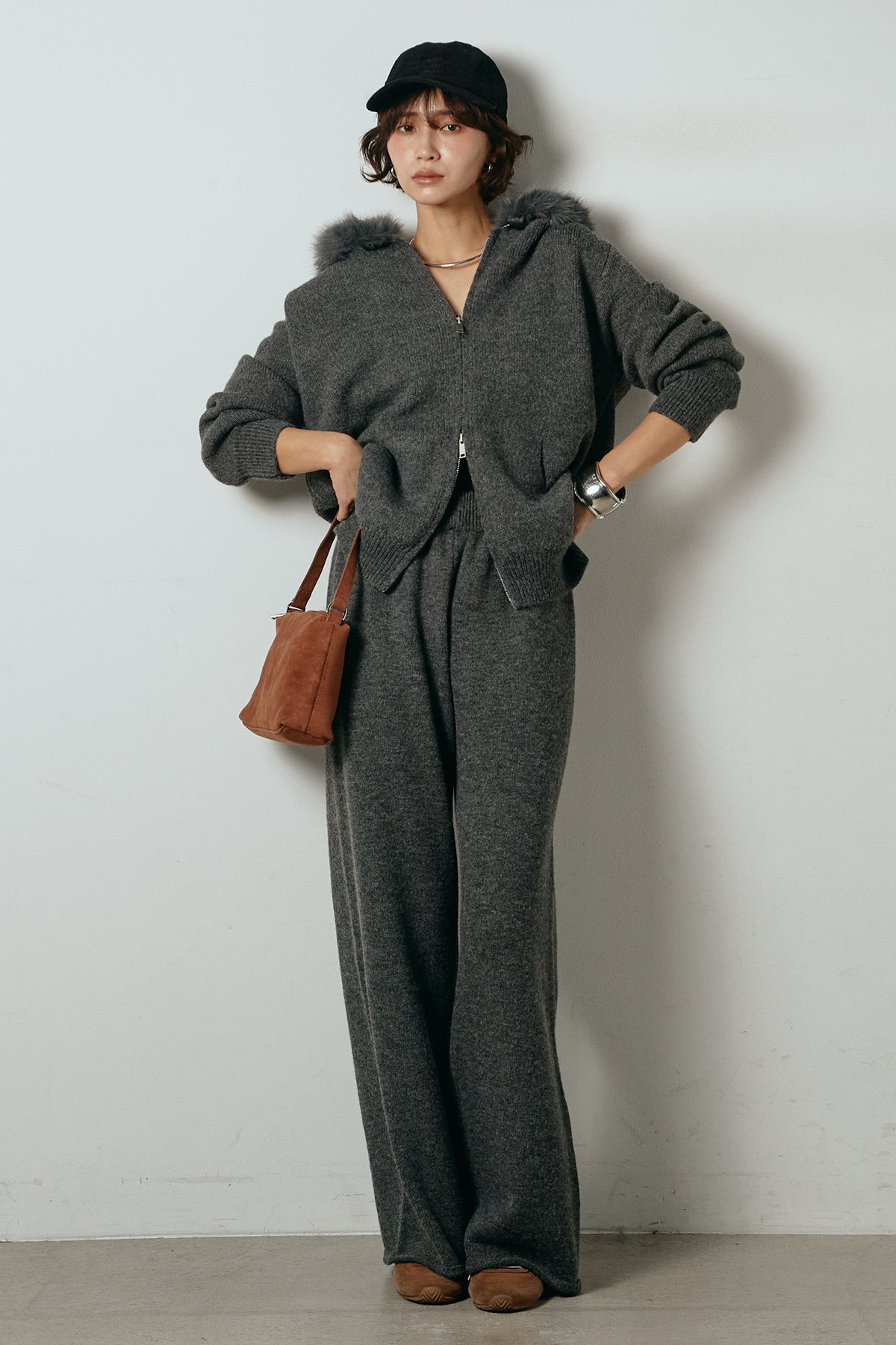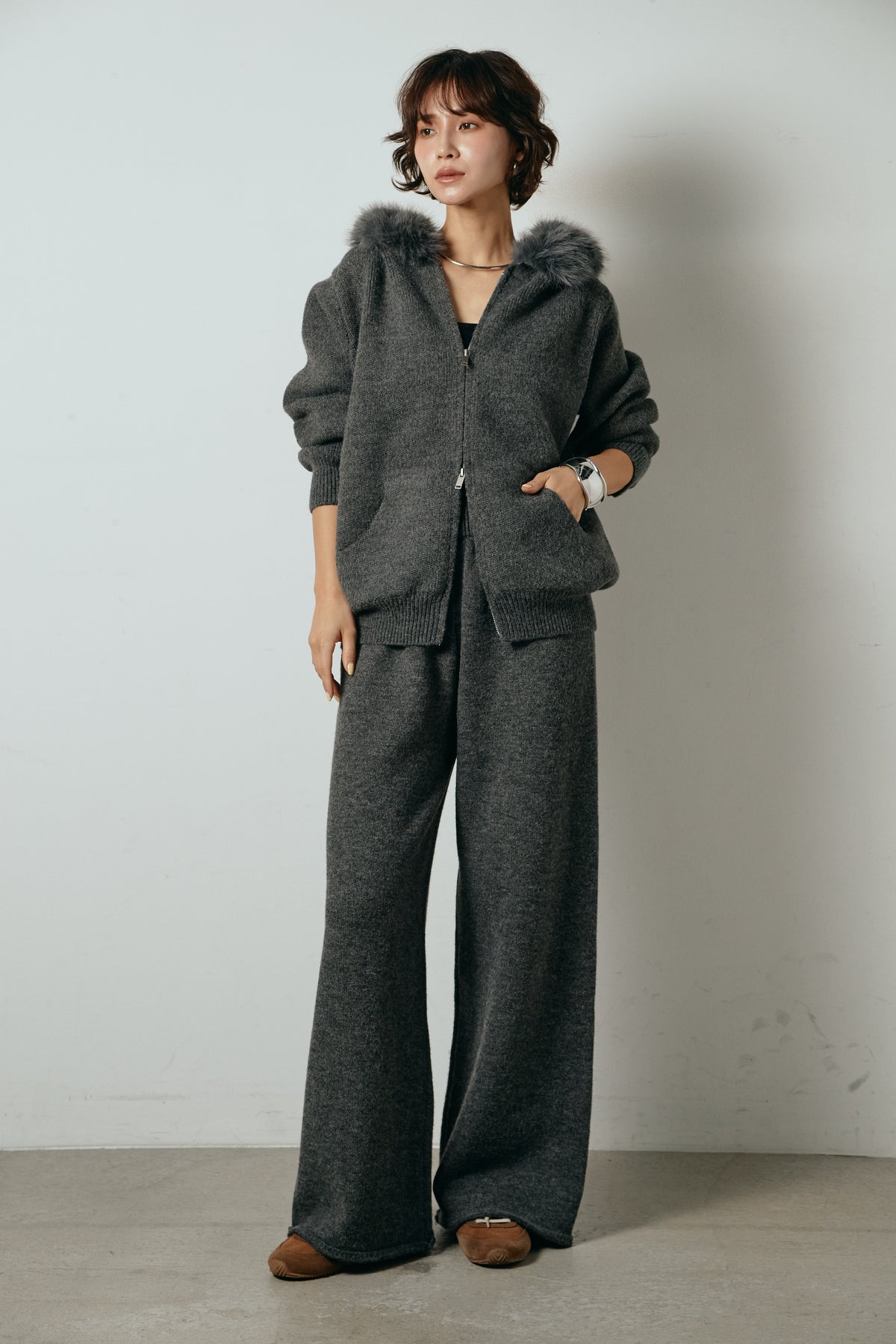 柔らかなニット素材に、フード部分のファーがアクセントになったセットアップ。ジップ仕様のフーディーは程よくゆとりのあるシルエットで、リラックス感がありながらも大人っぽい印象に仕上げています。ワイドシルエットのパンツと合わせることで、縦ラインが強調され、すっきりとしたバランスに。セットではもちろん、単品使いもしやすく、デイリーからお出かけまで幅広く活躍するアイテムです。