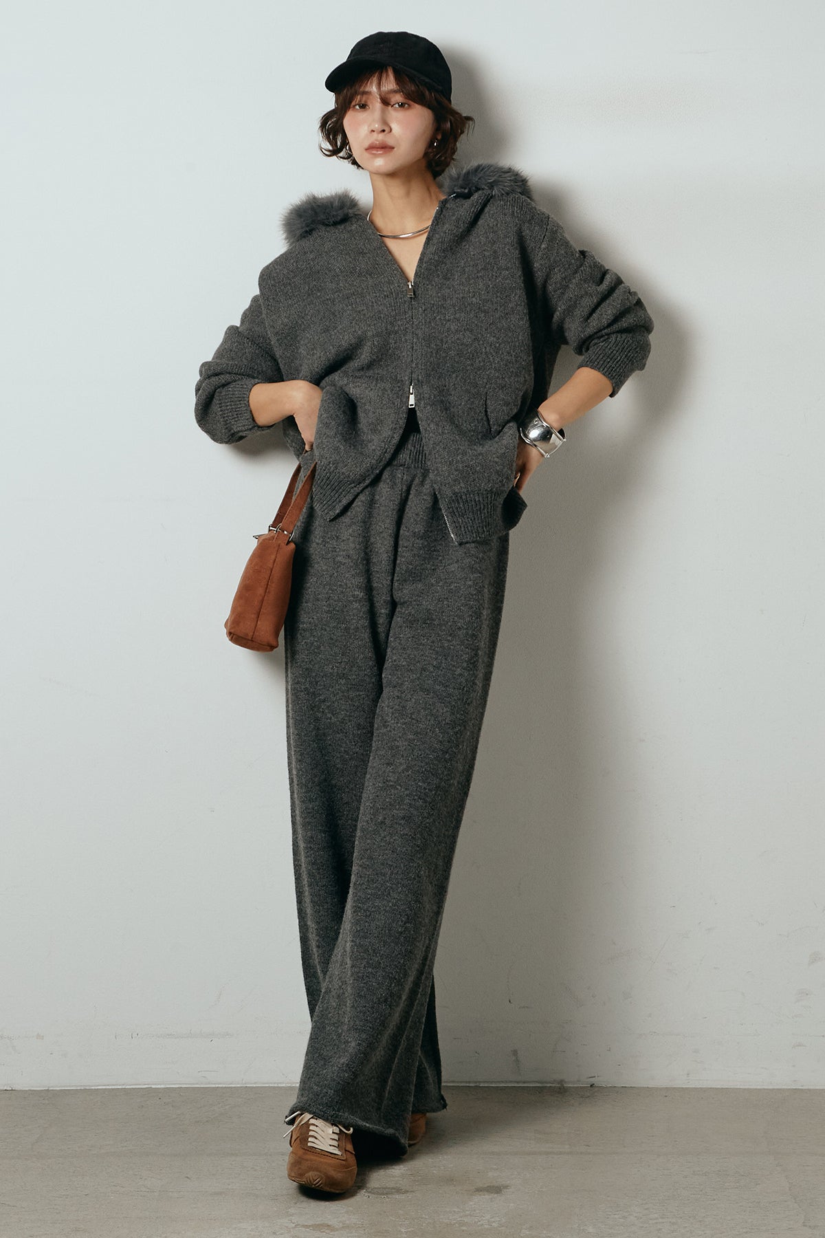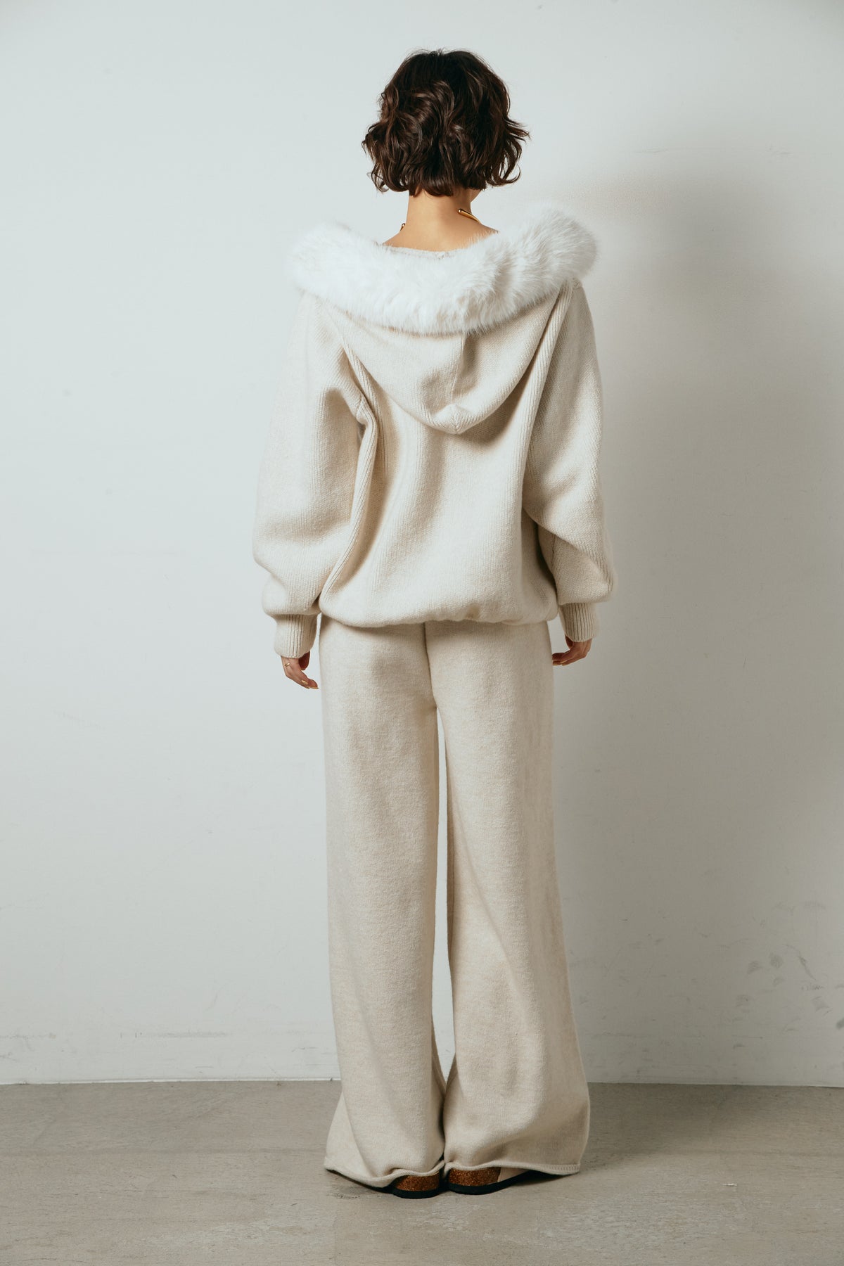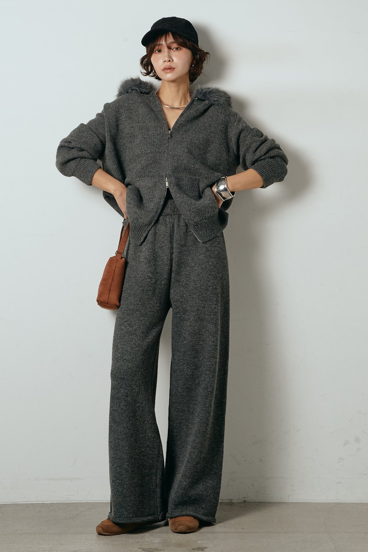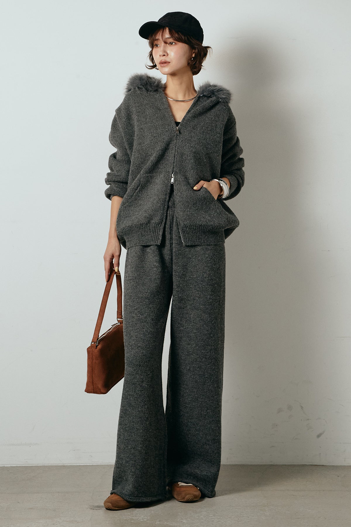 柔らかなニット素材に、フード部分のファーがアクセントになったセットアップ。ジップ仕様のフーディーは程よくゆとりのあるシルエットで、リラックス感がありながらも大人っぽい印象に仕上げています。ワイドシルエットのパンツと合わせることで、縦ラインが強調され、すっきりとしたバランスに。セットではもちろん、単品使いもしやすく、デイリーからお出かけまで幅広く活躍するアイテムです。