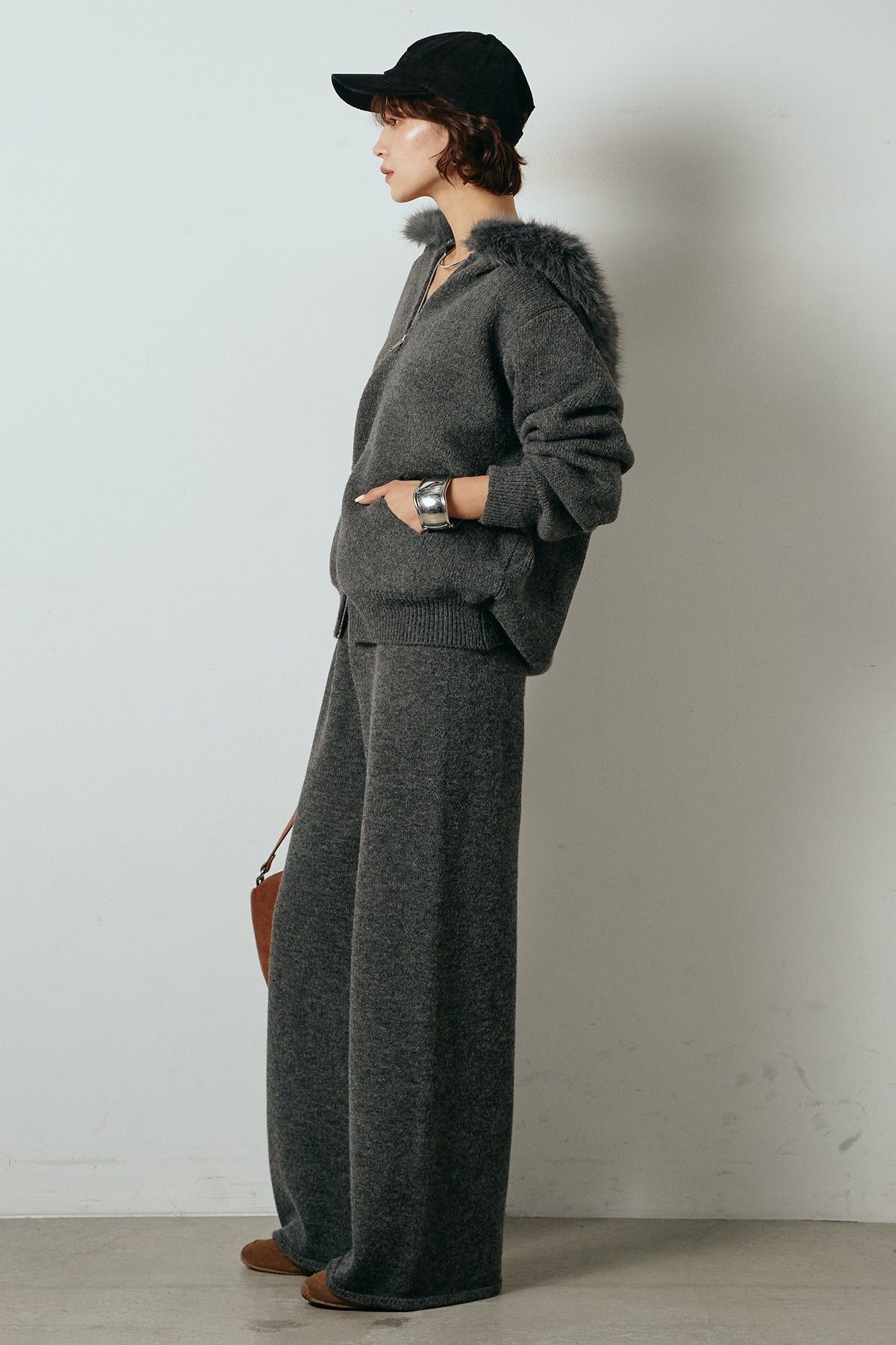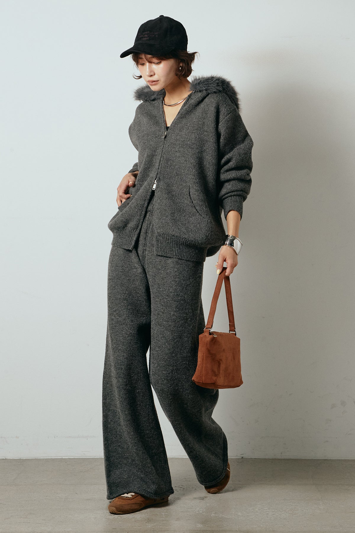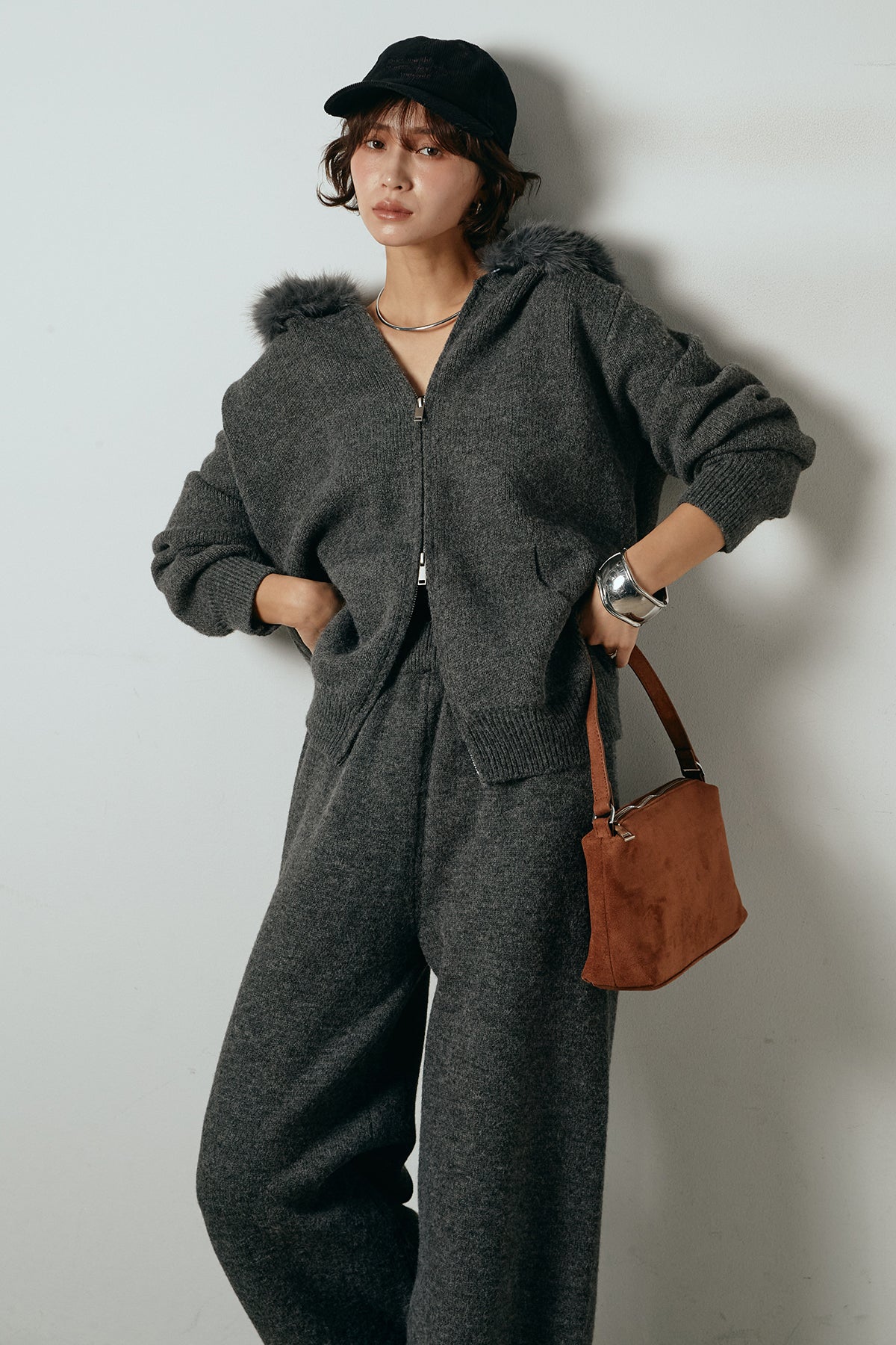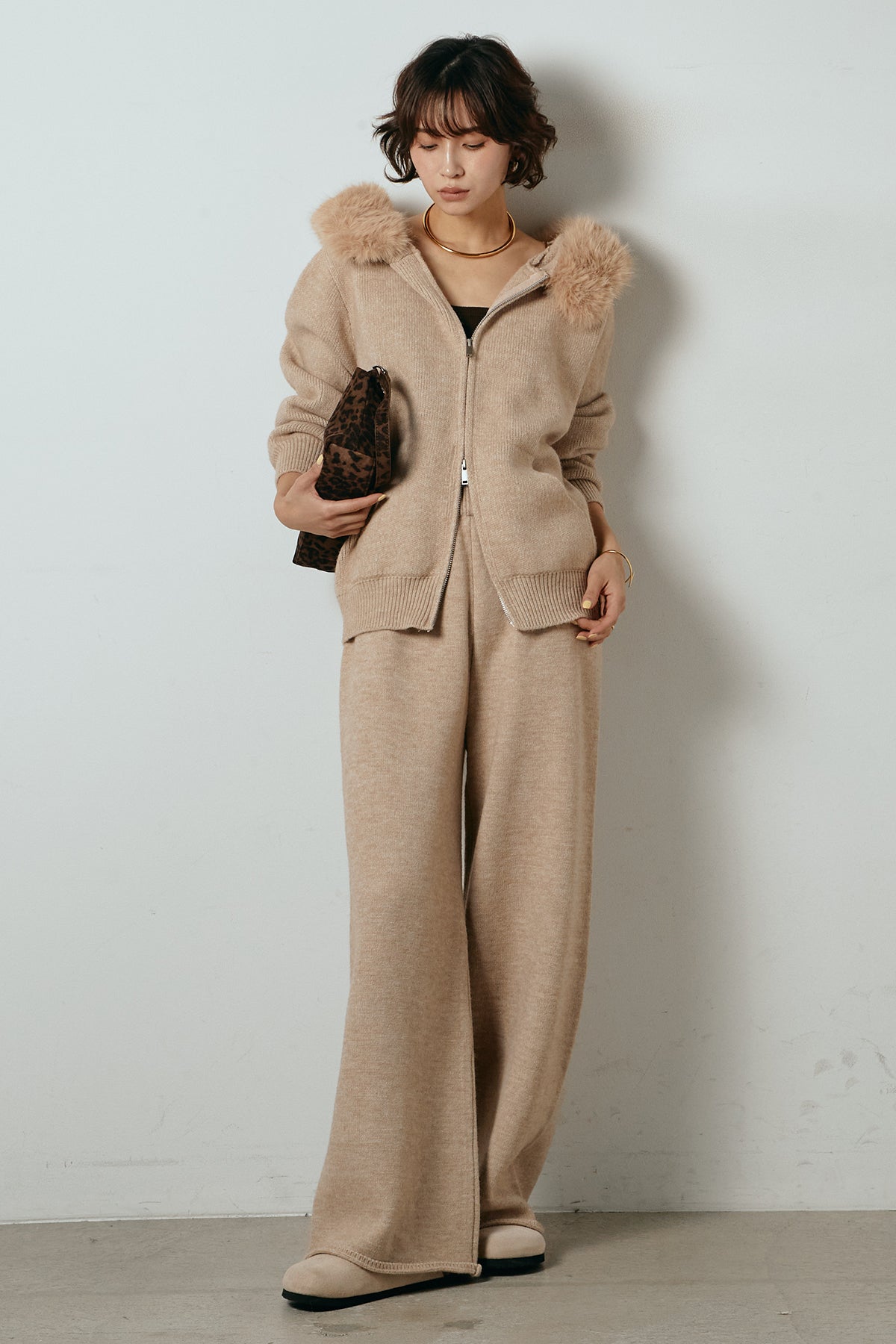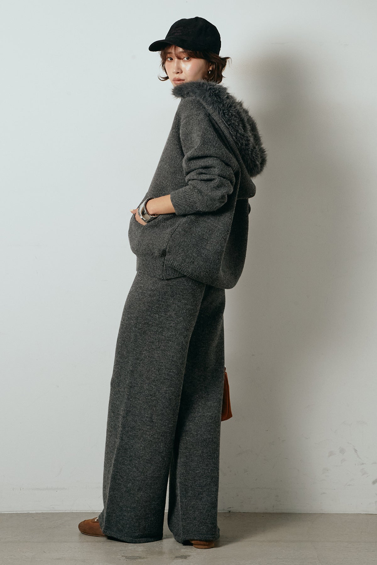 柔らかなニット素材に、フード部分のファーがアクセントになったセットアップ。ジップ仕様のフーディーは程よくゆとりのあるシルエットで、リラックス感がありながらも大人っぽい印象に仕上げています。ワイドシルエットのパンツと合わせることで、縦ラインが強調され、すっきりとしたバランスに。セットではもちろん、単品使いもしやすく、デイリーからお出かけまで幅広く活躍するアイテムです。