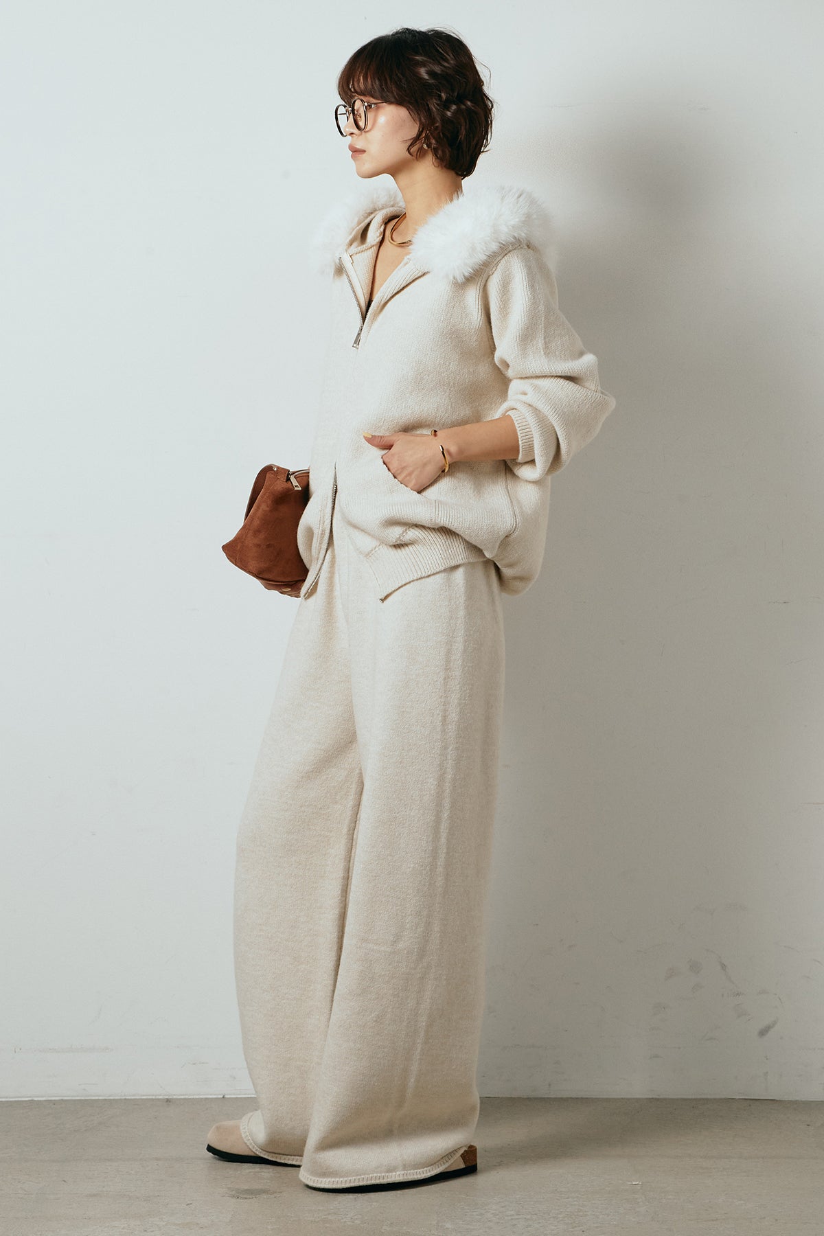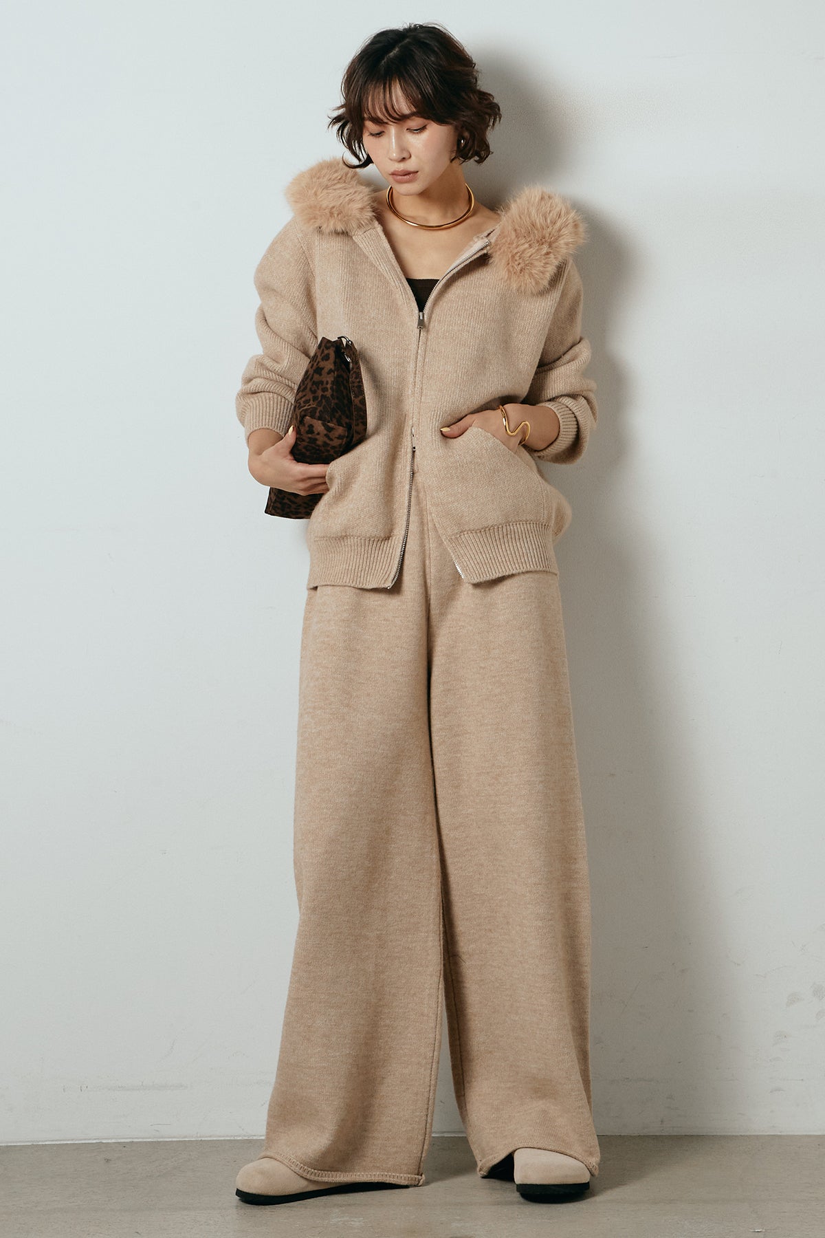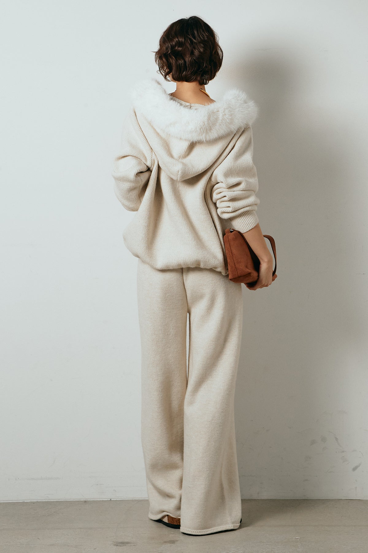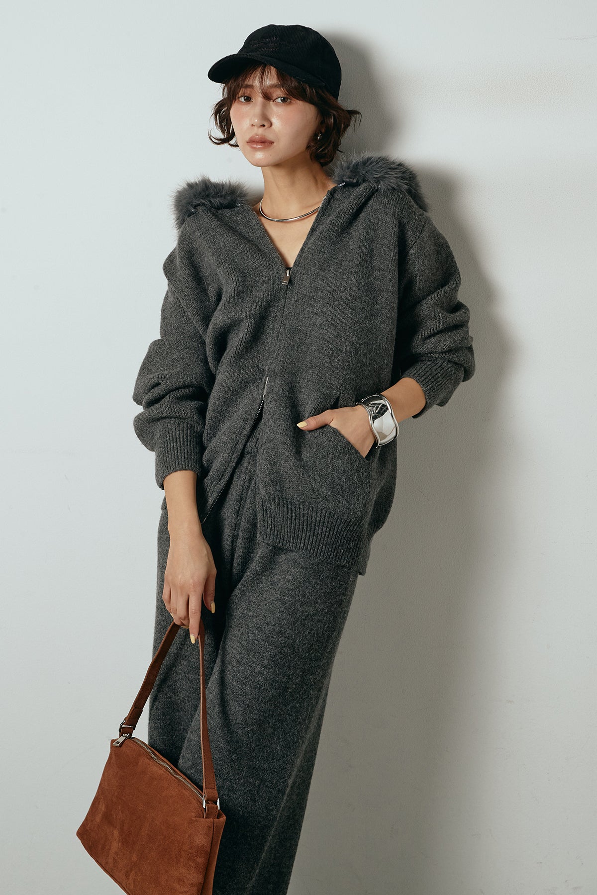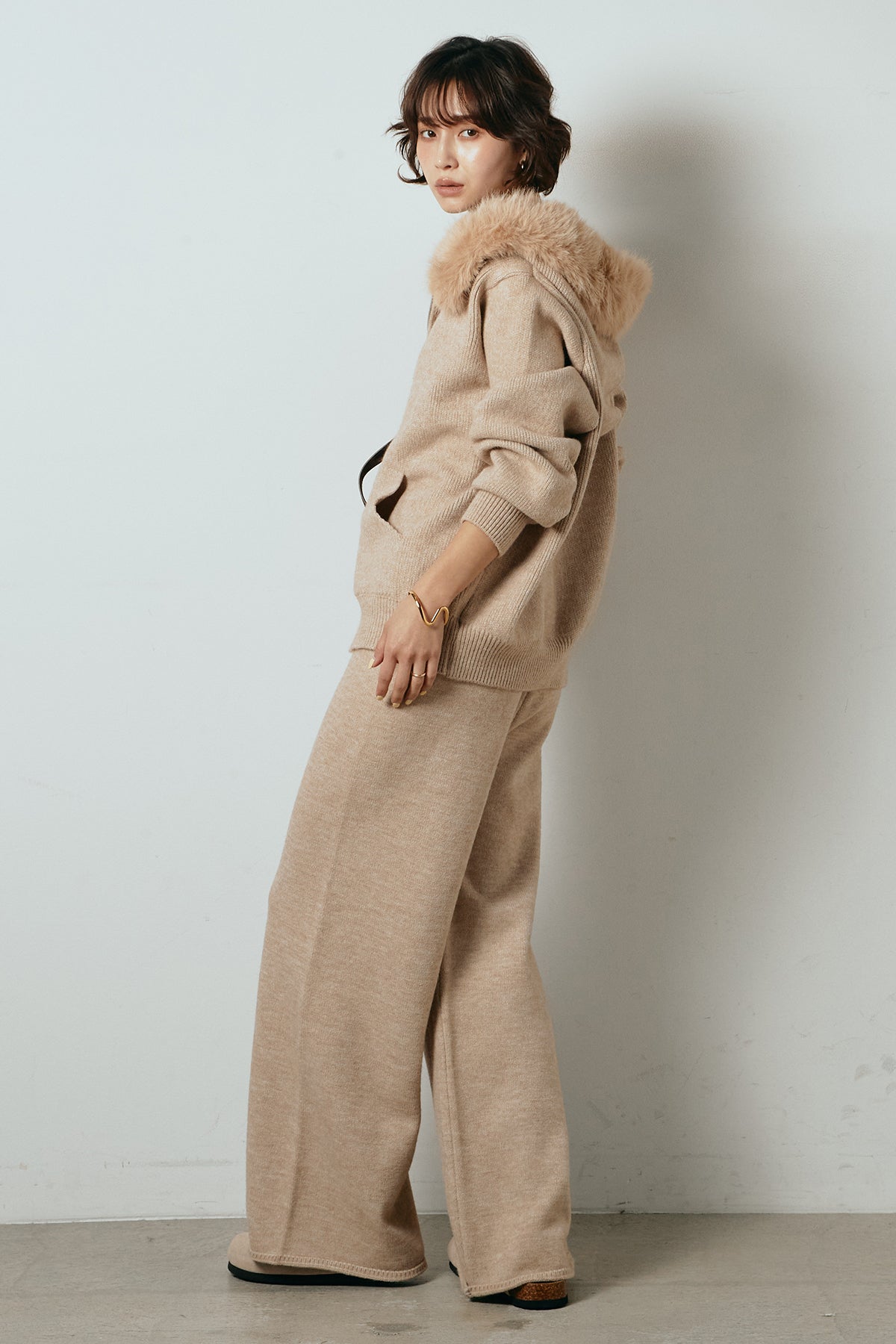 柔らかなニット素材に、フード部分のファーがアクセントになったセットアップ。ジップ仕様のフーディーは程よくゆとりのあるシルエットで、リラックス感がありながらも大人っぽい印象に仕上げています。ワイドシルエットのパンツと合わせることで、縦ラインが強調され、すっきりとしたバランスに。セットではもちろん、単品使いもしやすく、デイリーからお出かけまで幅広く活躍するアイテムです。