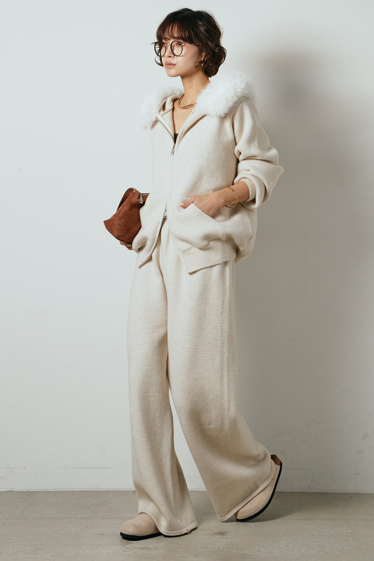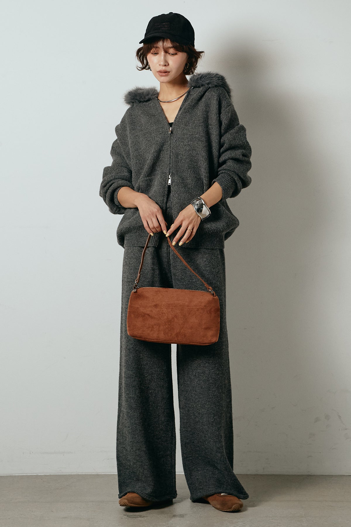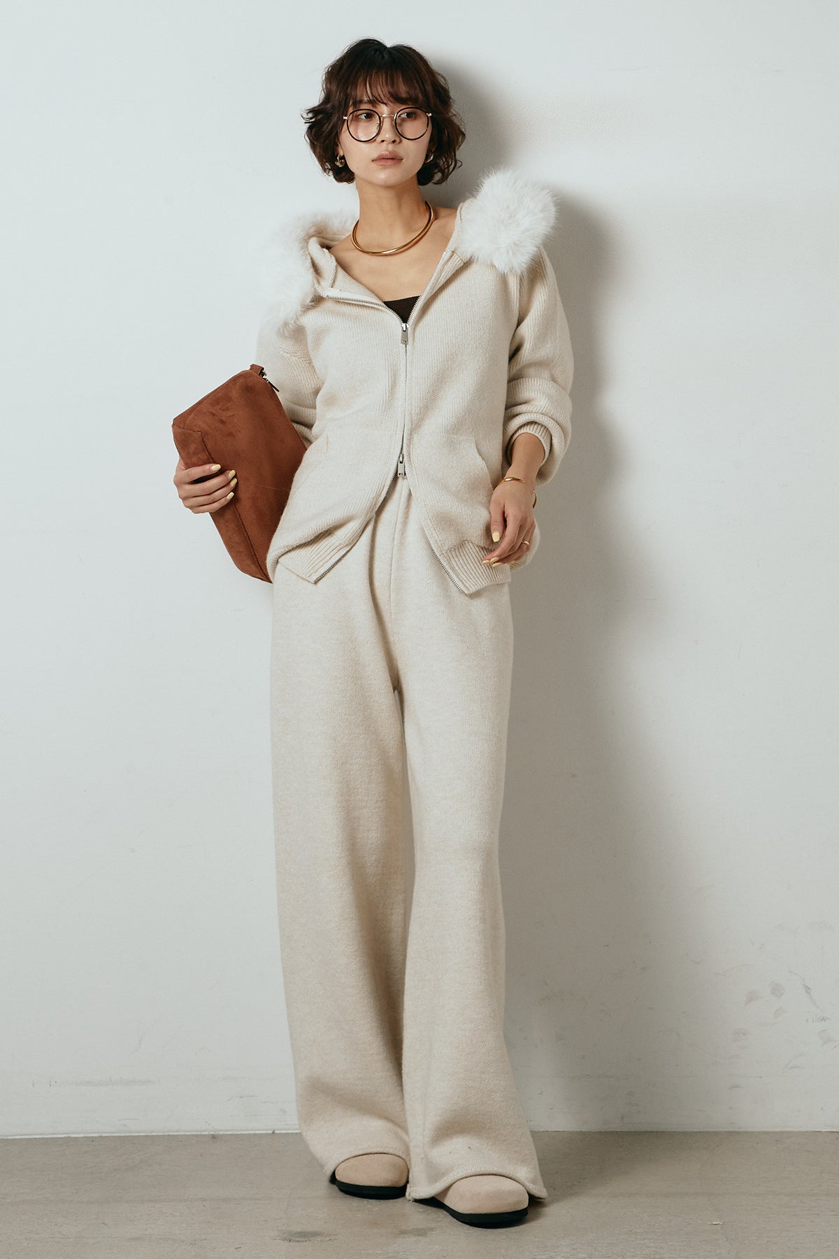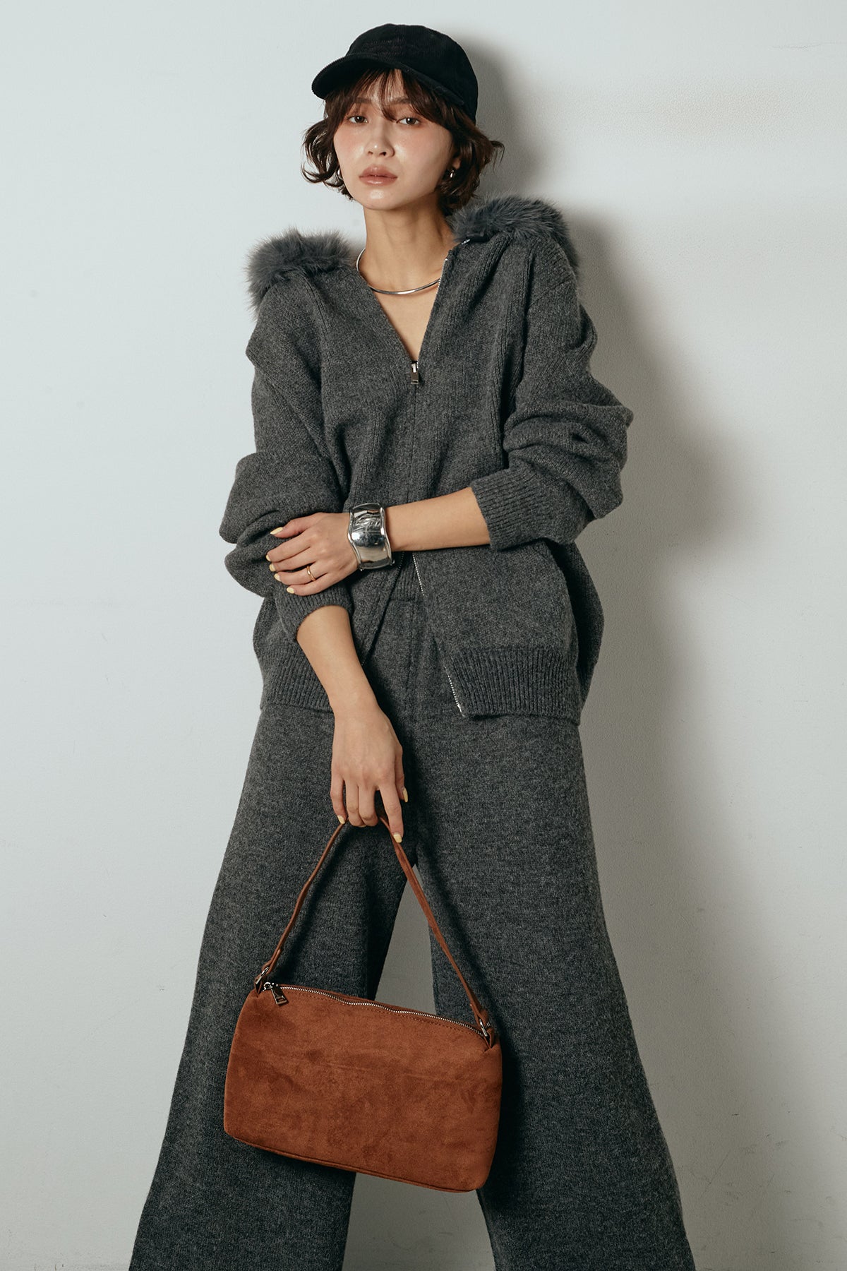 柔らかなニット素材に、フード部分のファーがアクセントになったセットアップ。ジップ仕様のフーディーは程よくゆとりのあるシルエットで、リラックス感がありながらも大人っぽい印象に仕上げています。ワイドシルエットのパンツと合わせることで、縦ラインが強調され、すっきりとしたバランスに。セットではもちろん、単品使いもしやすく、デイリーからお出かけまで幅広く活躍するアイテムです。