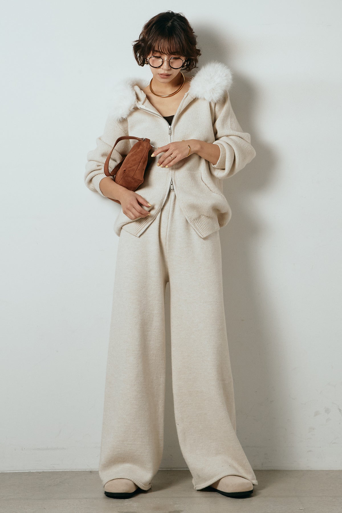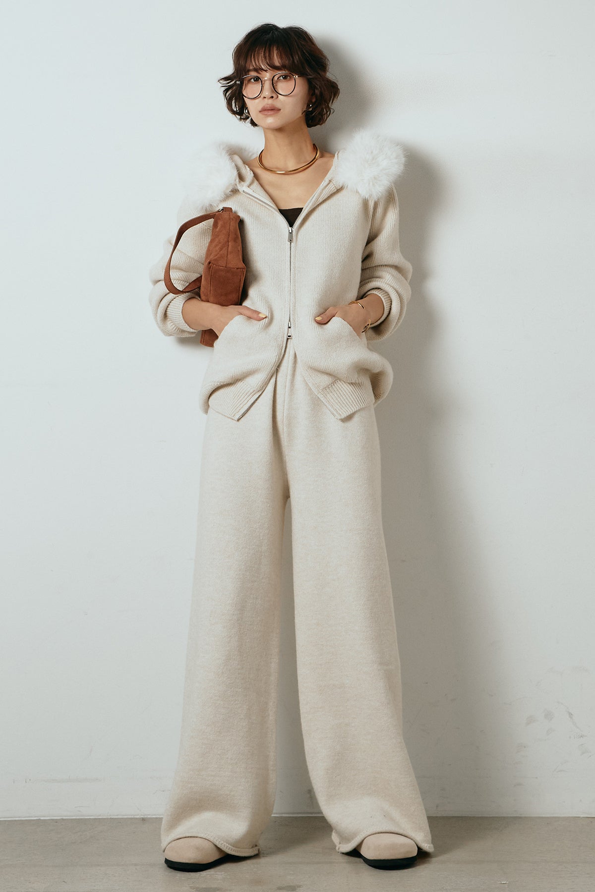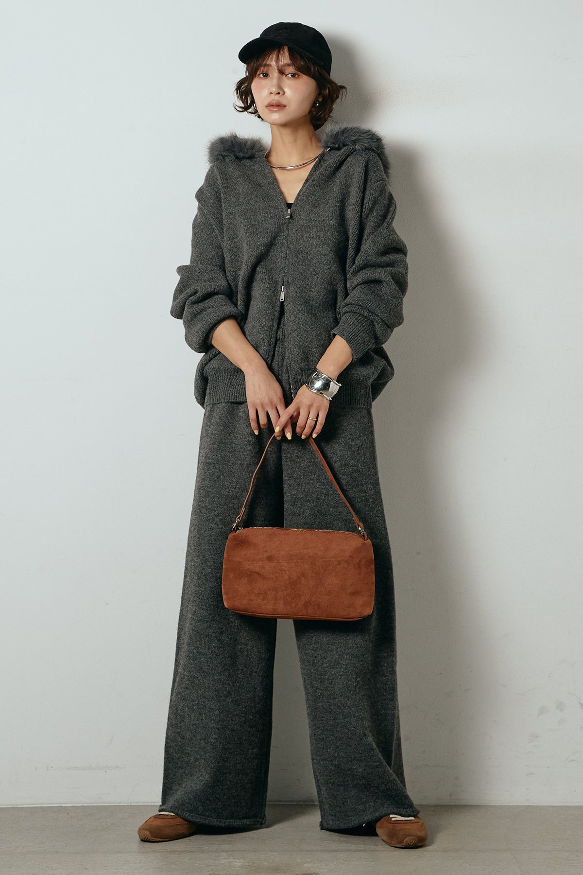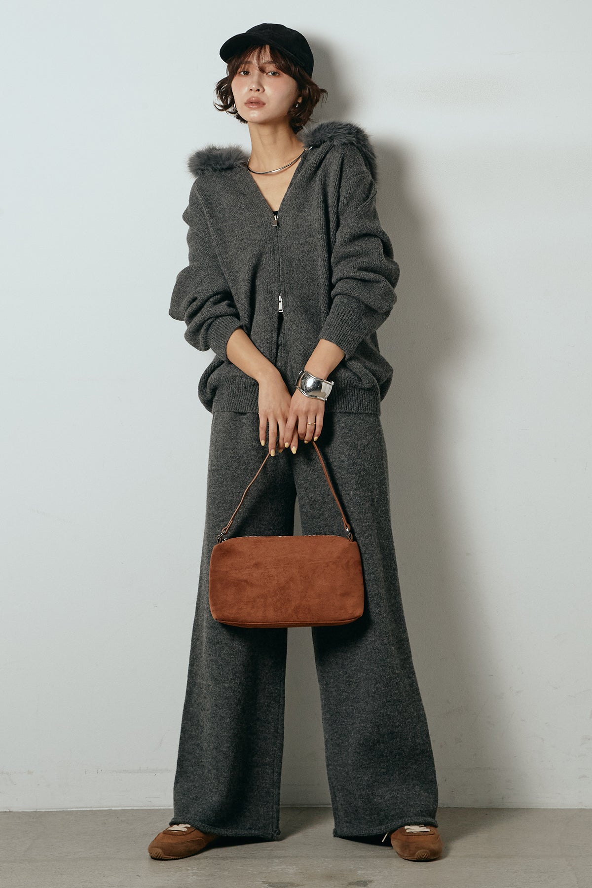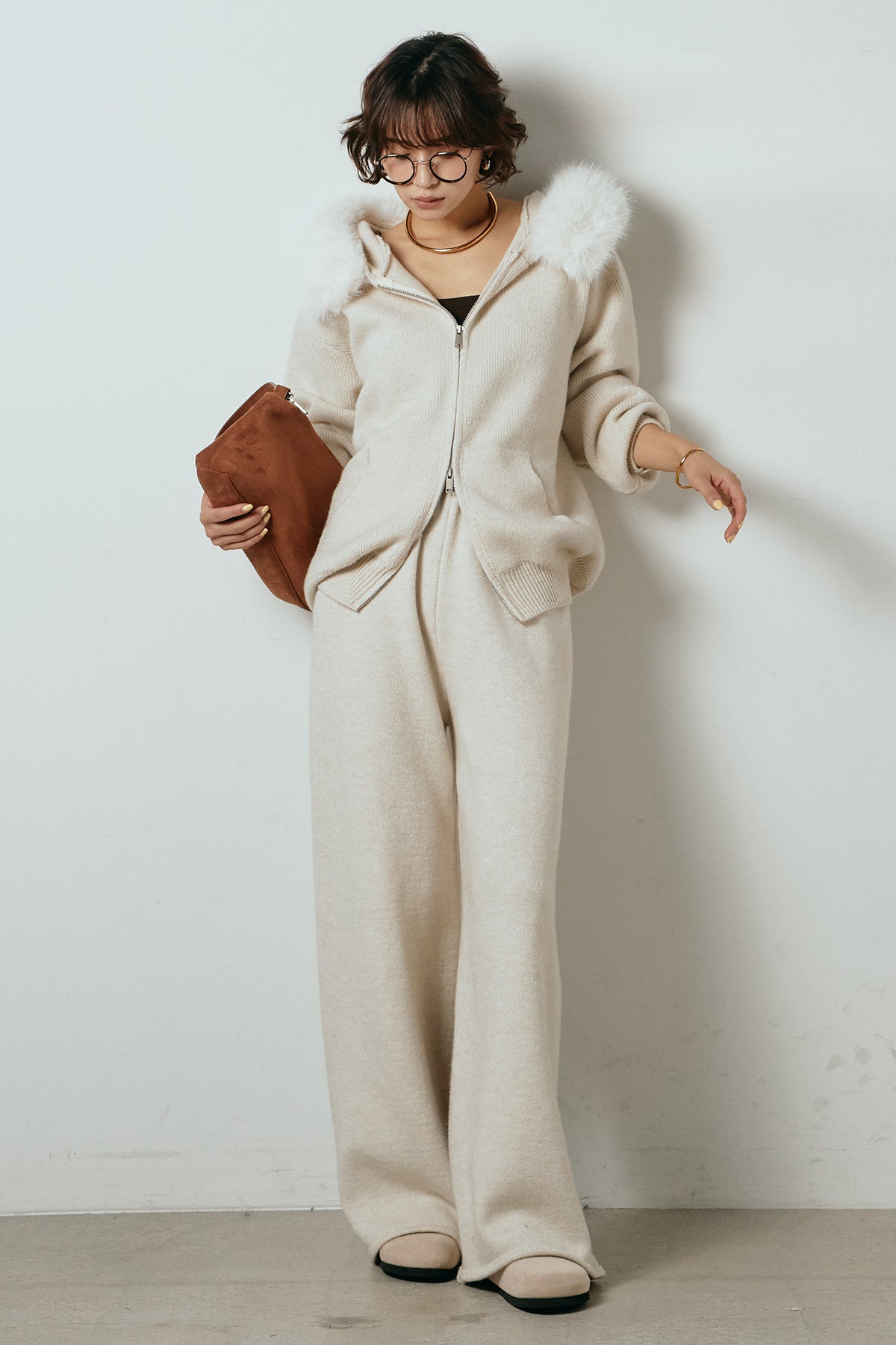 柔らかなニット素材に、フード部分のファーがアクセントになったセットアップ。ジップ仕様のフーディーは程よくゆとりのあるシルエットで、リラックス感がありながらも大人っぽい印象に仕上げています。ワイドシルエットのパンツと合わせることで、縦ラインが強調され、すっきりとしたバランスに。セットではもちろん、単品使いもしやすく、デイリーからお出かけまで幅広く活躍するアイテムです。