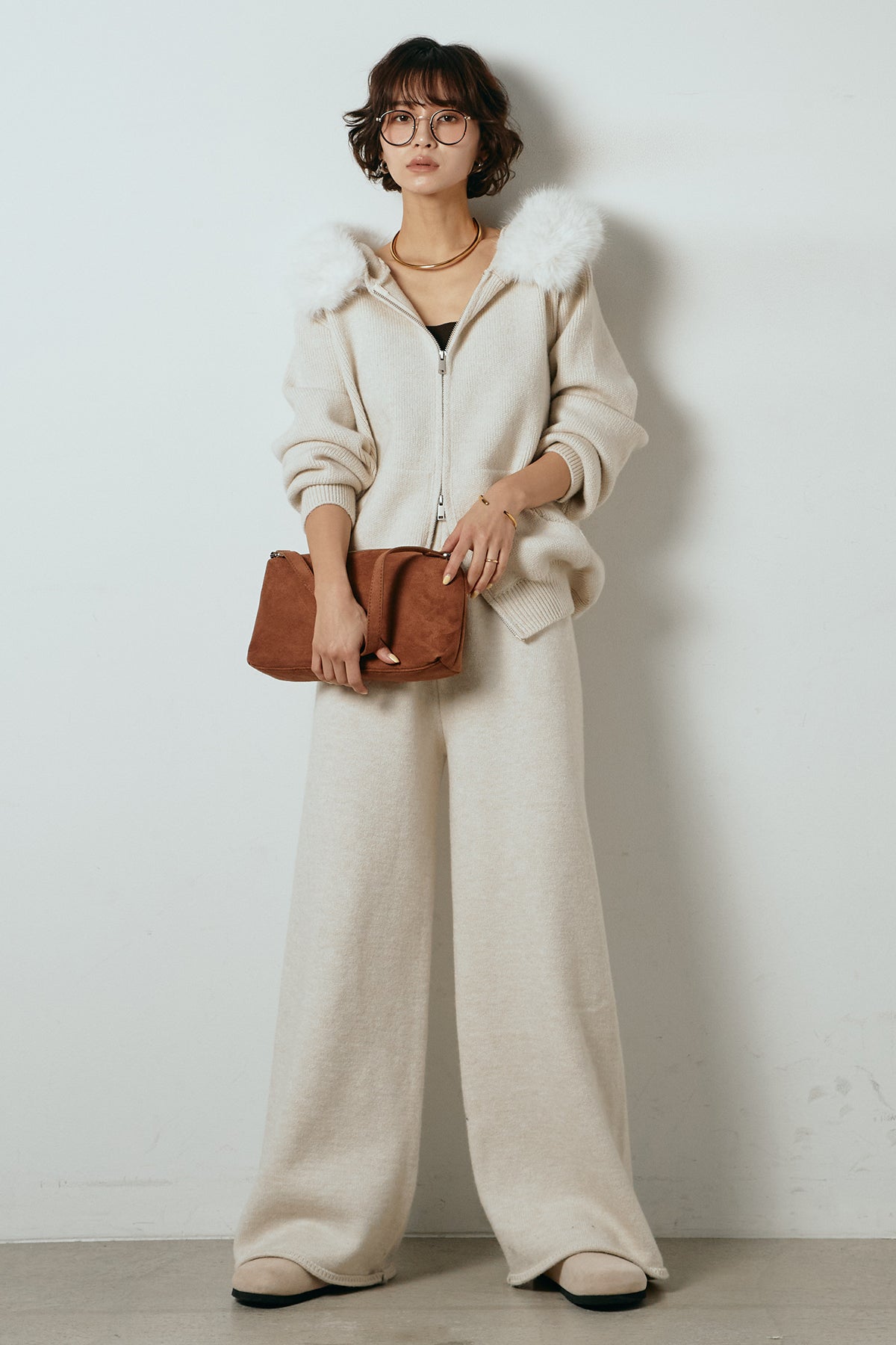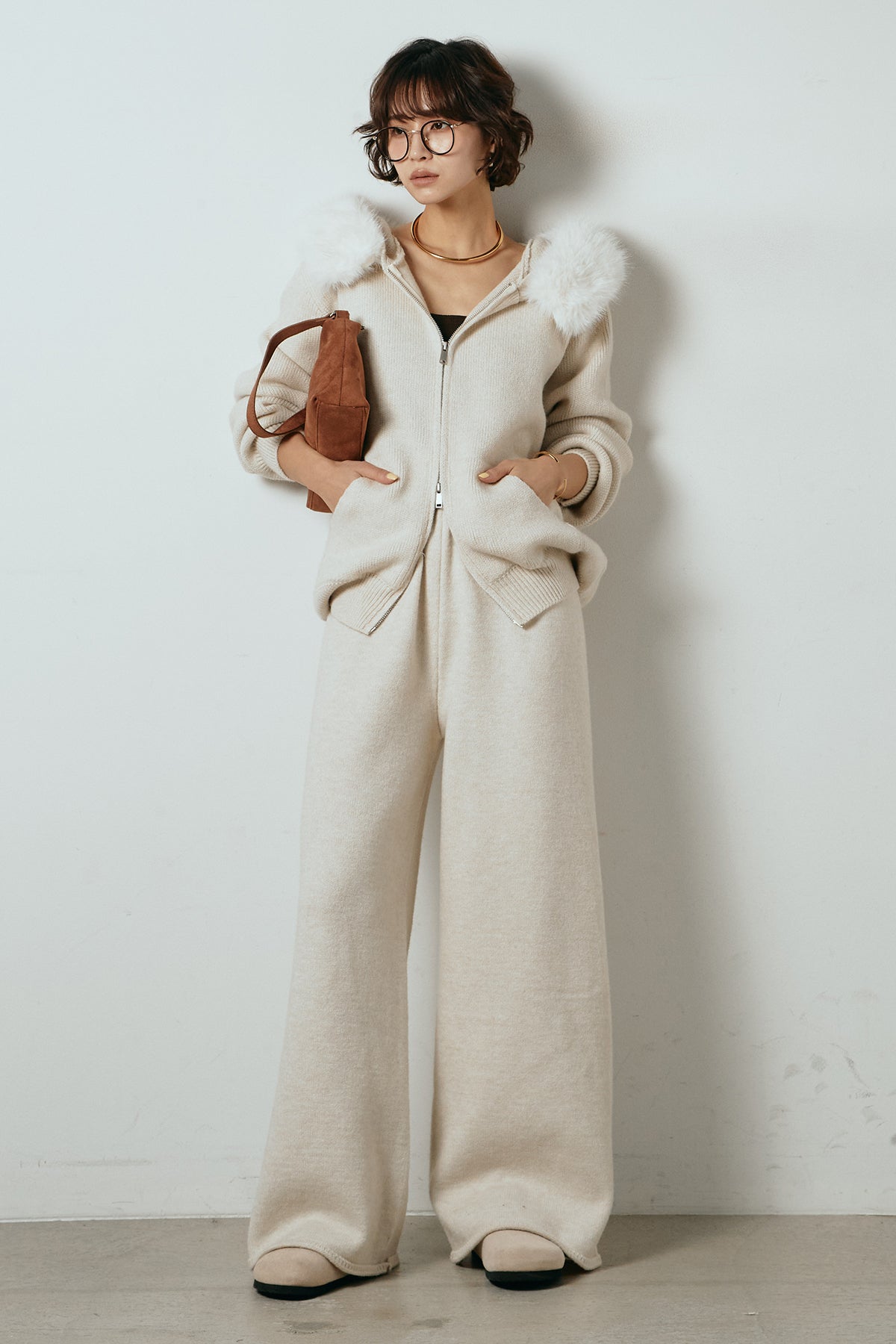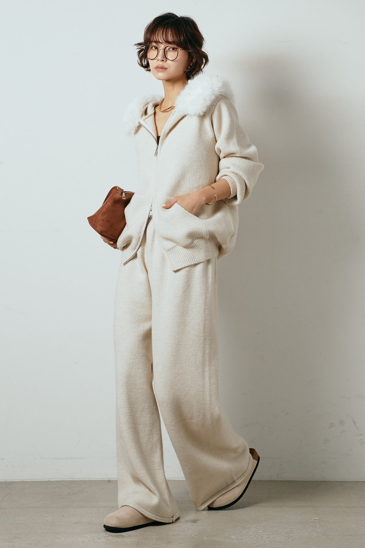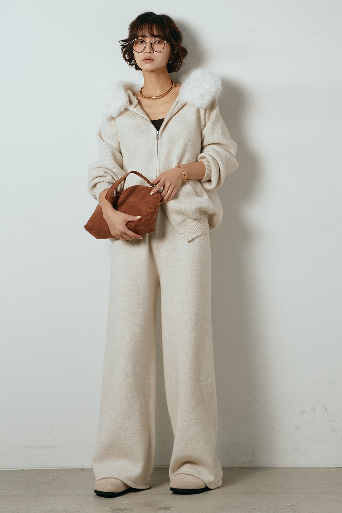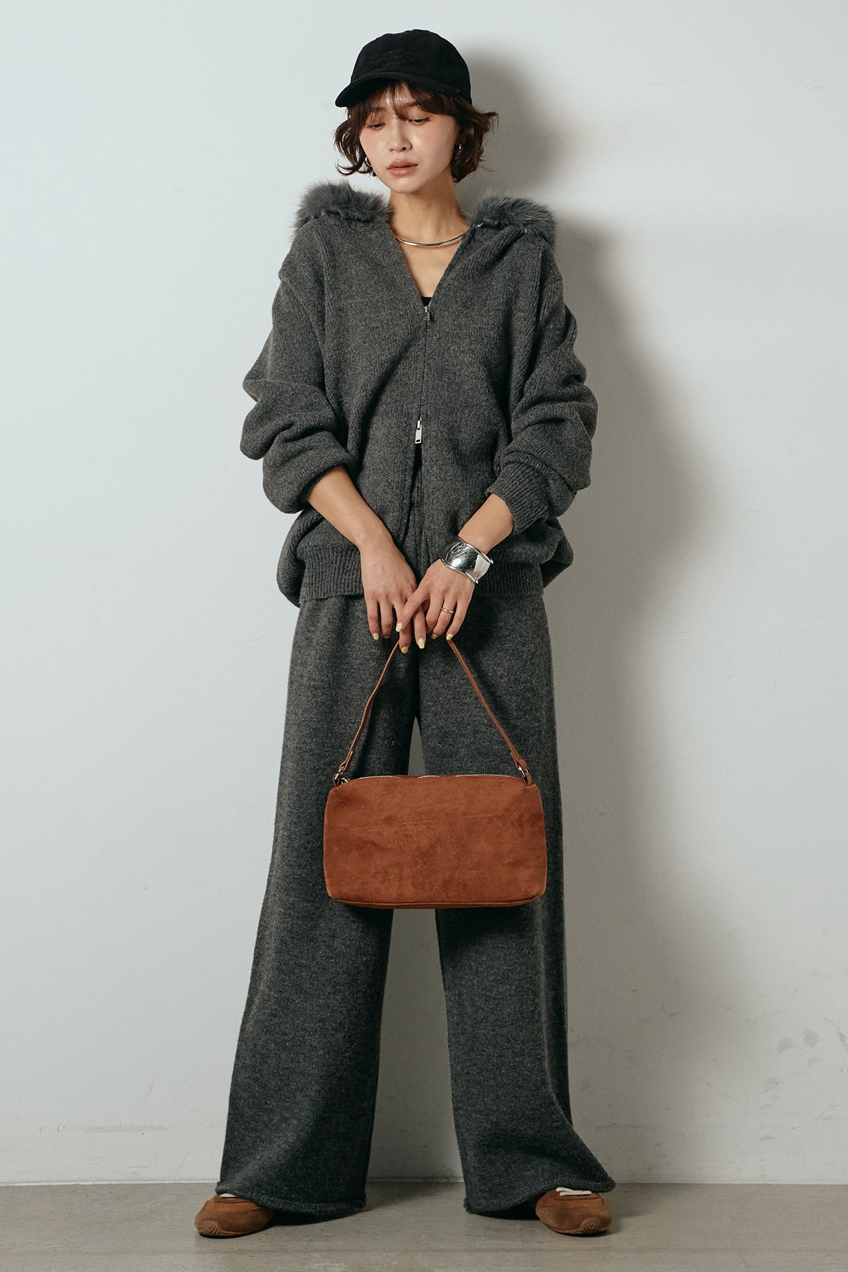 柔らかなニット素材に、フード部分のファーがアクセントになったセットアップ。ジップ仕様のフーディーは程よくゆとりのあるシルエットで、リラックス感がありながらも大人っぽい印象に仕上げています。ワイドシルエットのパンツと合わせることで、縦ラインが強調され、すっきりとしたバランスに。セットではもちろん、単品使いもしやすく、デイリーからお出かけまで幅広く活躍するアイテムです。