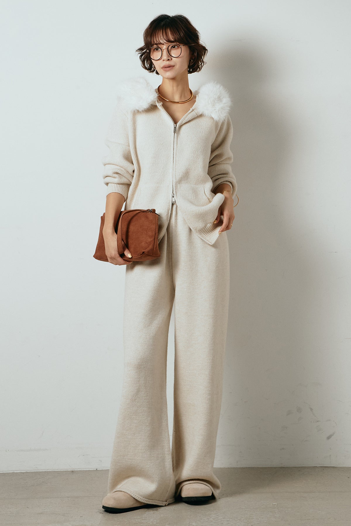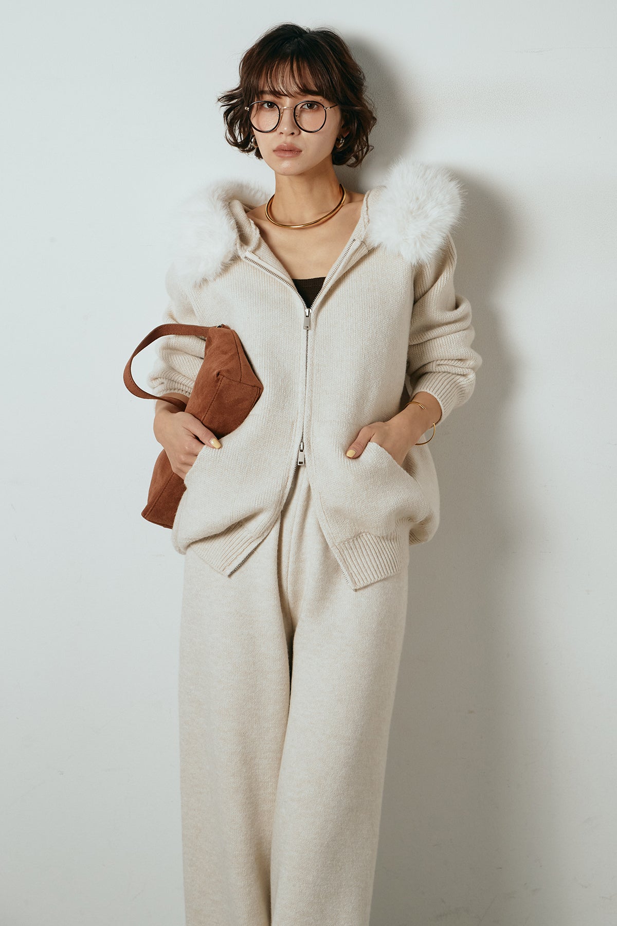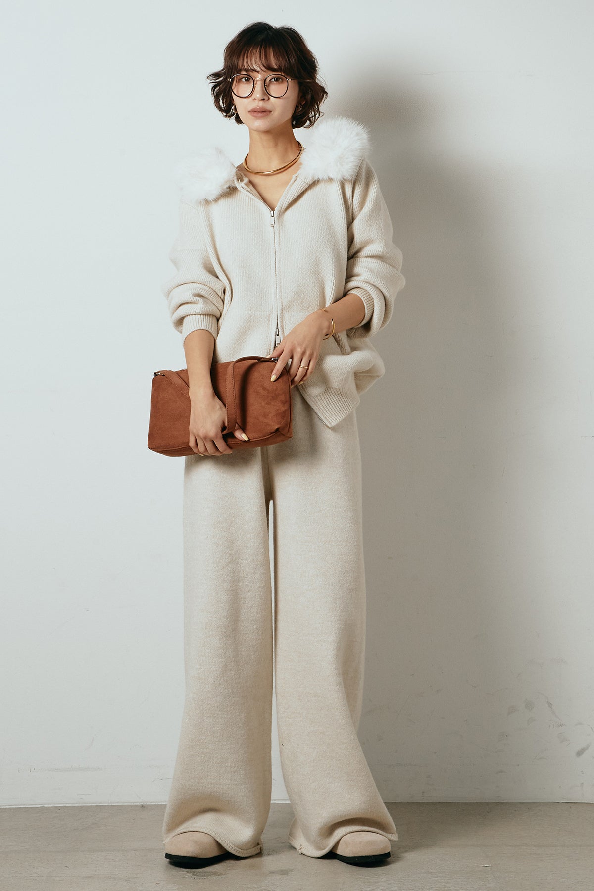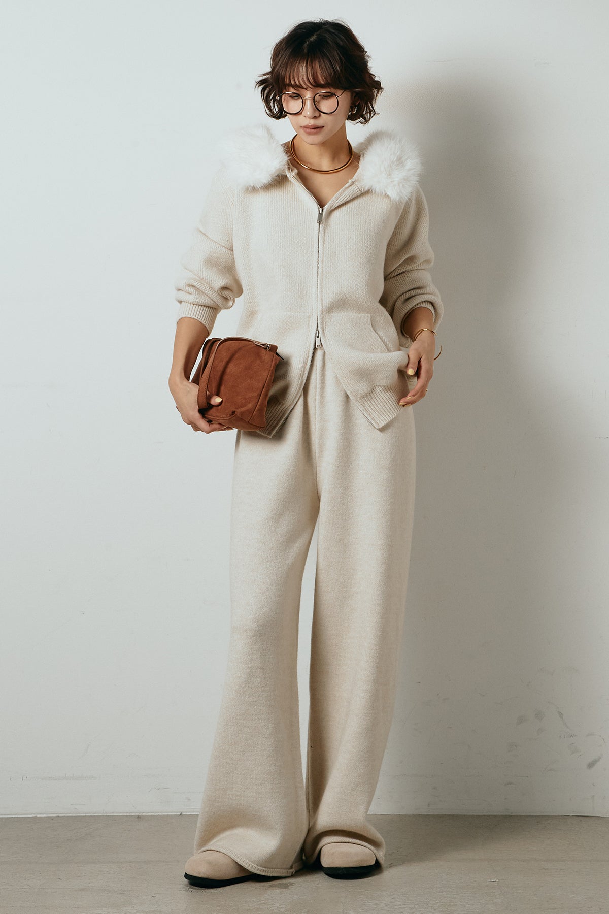 柔らかなニット素材に、フード部分のファーがアクセントになったセットアップ。ジップ仕様のフーディーは程よくゆとりのあるシルエットで、リラックス感がありながらも大人っぽい印象に仕上げています。ワイドシルエットのパンツと合わせることで、縦ラインが強調され、すっきりとしたバランスに。セットではもちろん、単品使いもしやすく、デイリーからお出かけまで幅広く活躍するアイテムです。