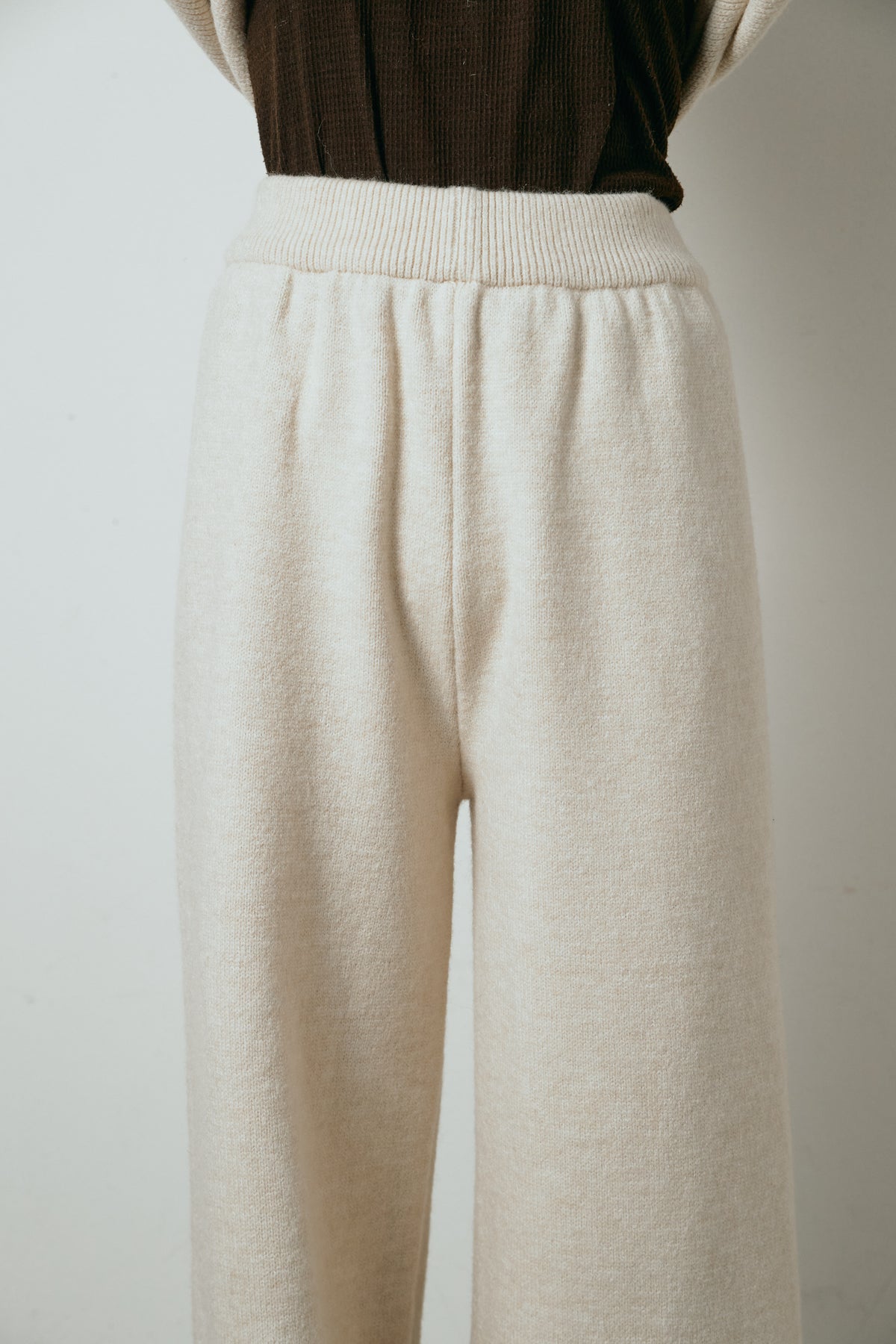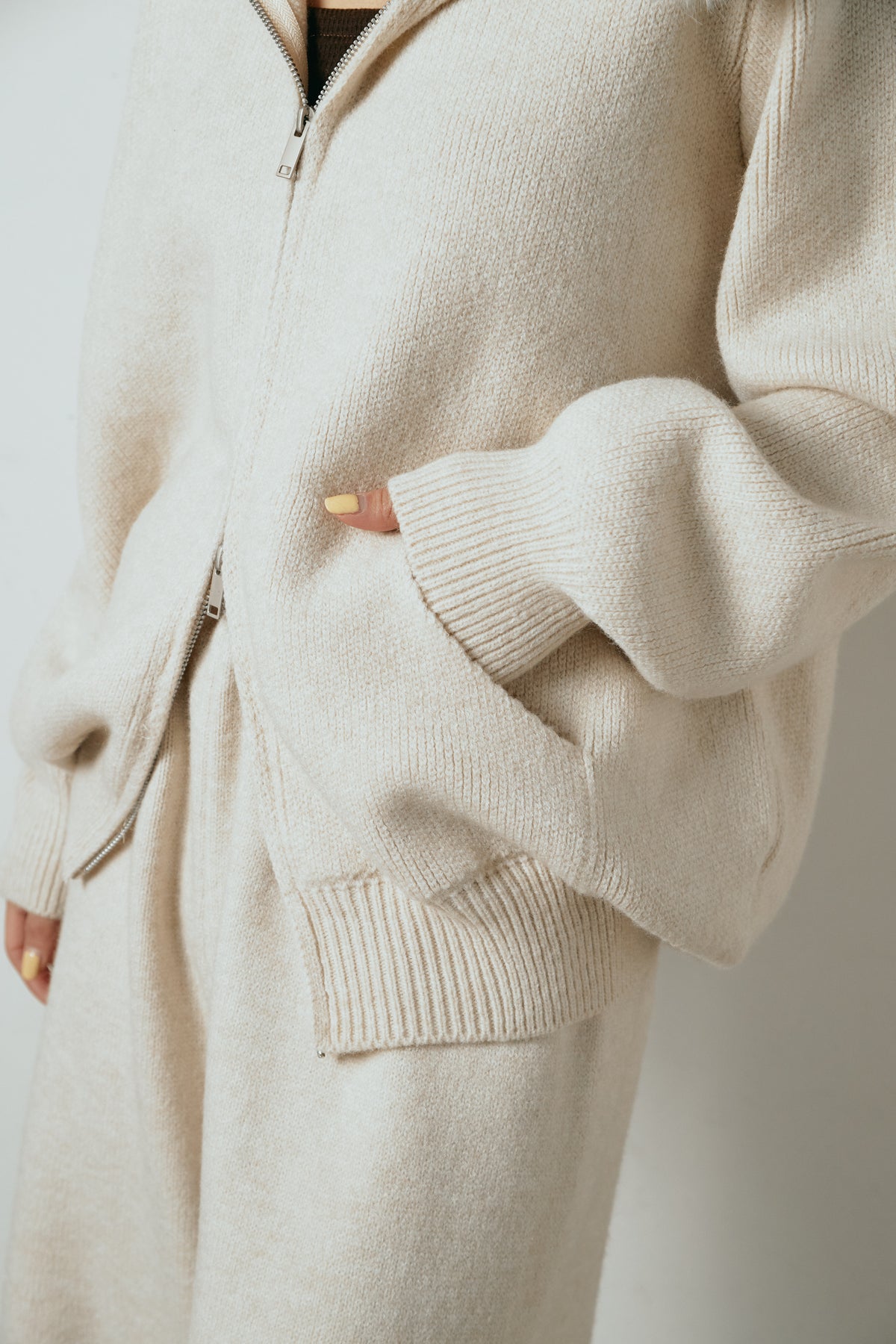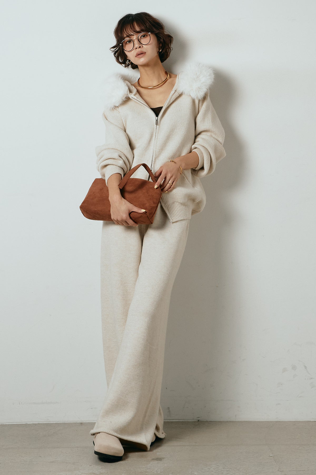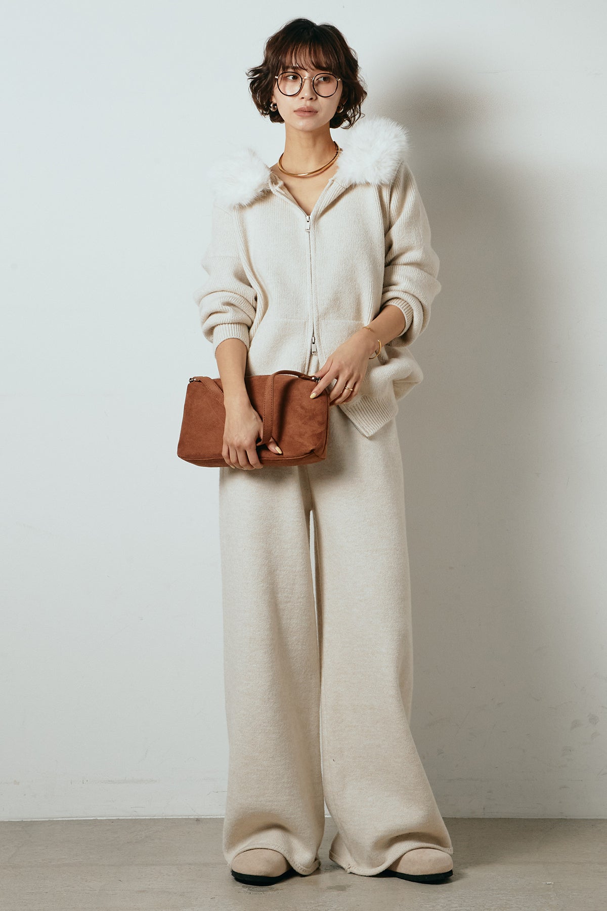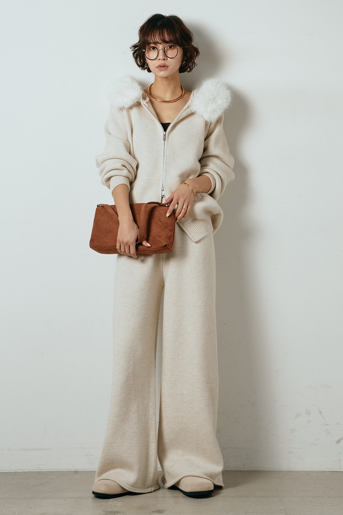 柔らかなニット素材に、フード部分のファーがアクセントになったセットアップ。ジップ仕様のフーディーは程よくゆとりのあるシルエットで、リラックス感がありながらも大人っぽい印象に仕上げています。ワイドシルエットのパンツと合わせることで、縦ラインが強調され、すっきりとしたバランスに。セットではもちろん、単品使いもしやすく、デイリーからお出かけまで幅広く活躍するアイテムです。