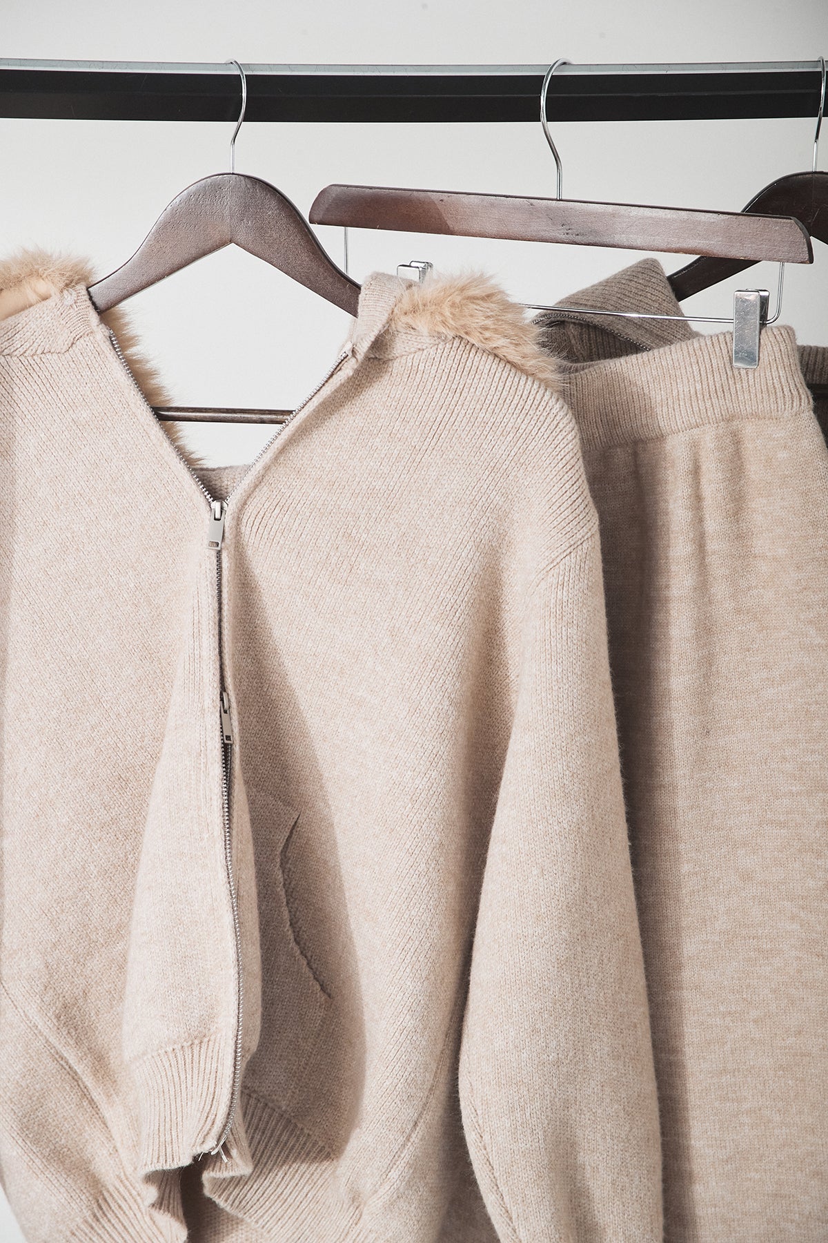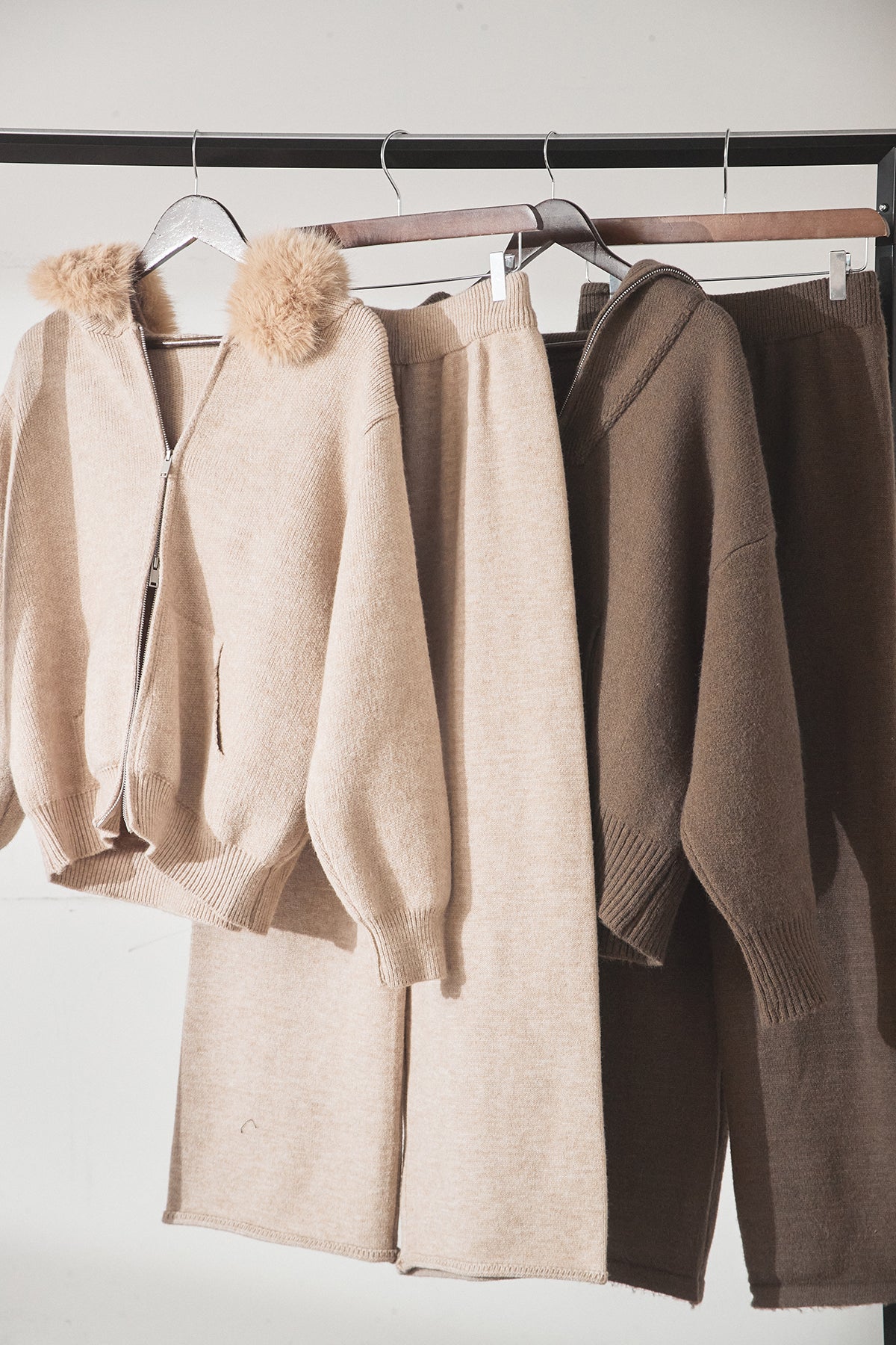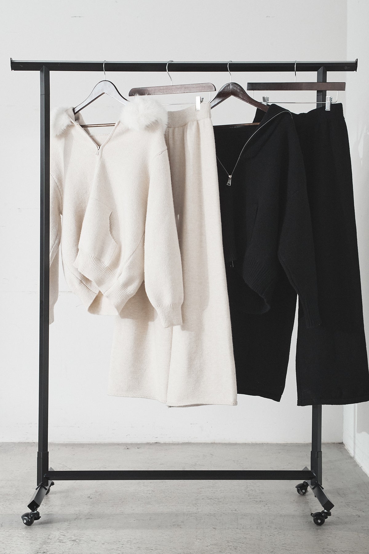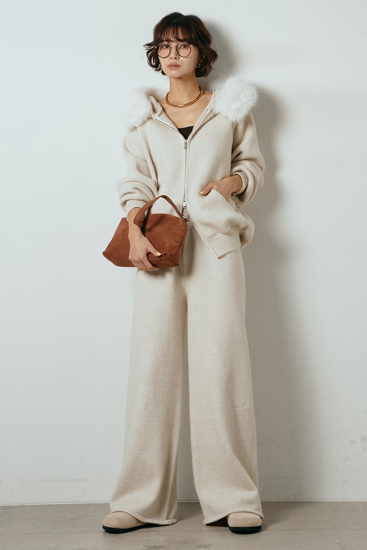 柔らかなニット素材に、フード部分のファーがアクセントになったセットアップ。ジップ仕様のフーディーは程よくゆとりのあるシルエットで、リラックス感がありながらも大人っぽい印象に仕上げています。ワイドシルエットのパンツと合わせることで、縦ラインが強調され、すっきりとしたバランスに。セットではもちろん、単品使いもしやすく、デイリーからお出かけまで幅広く活躍するアイテムです。