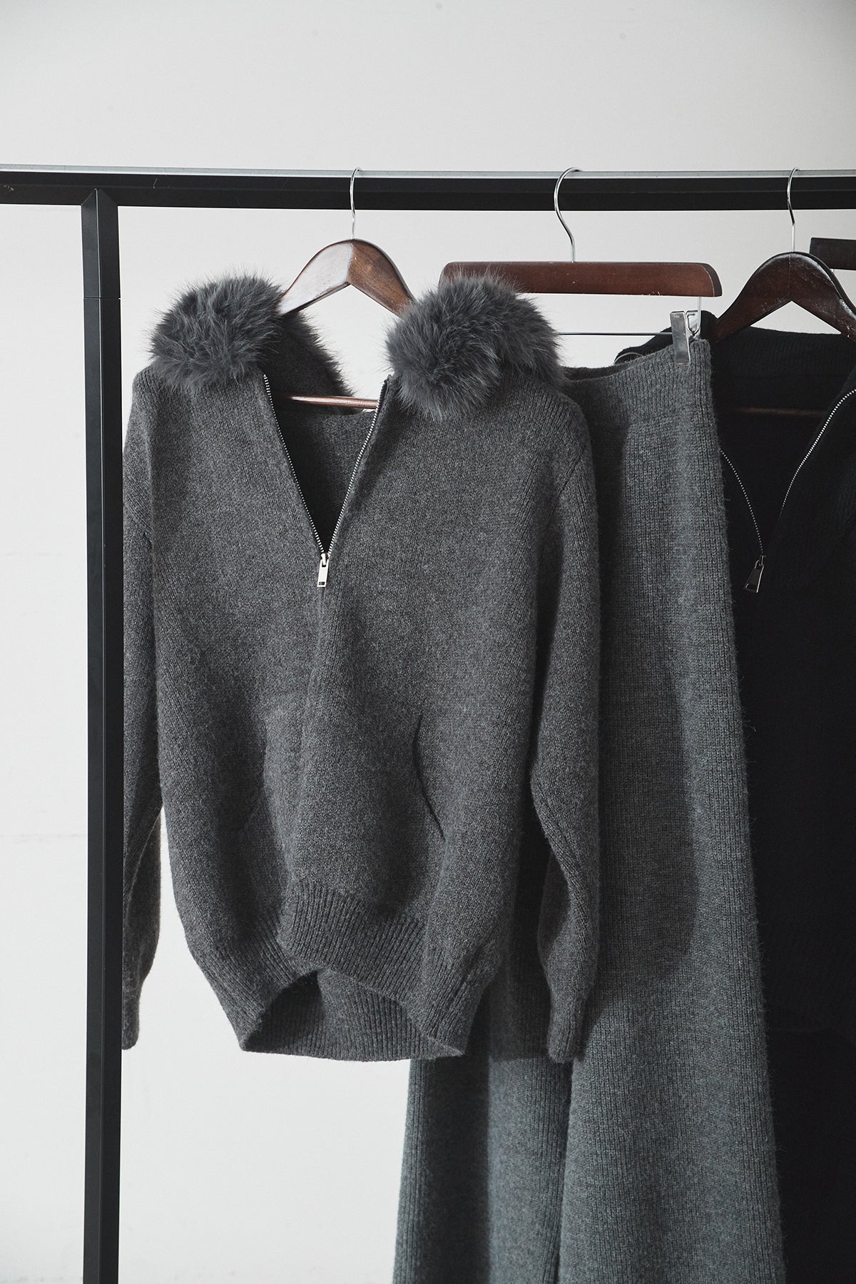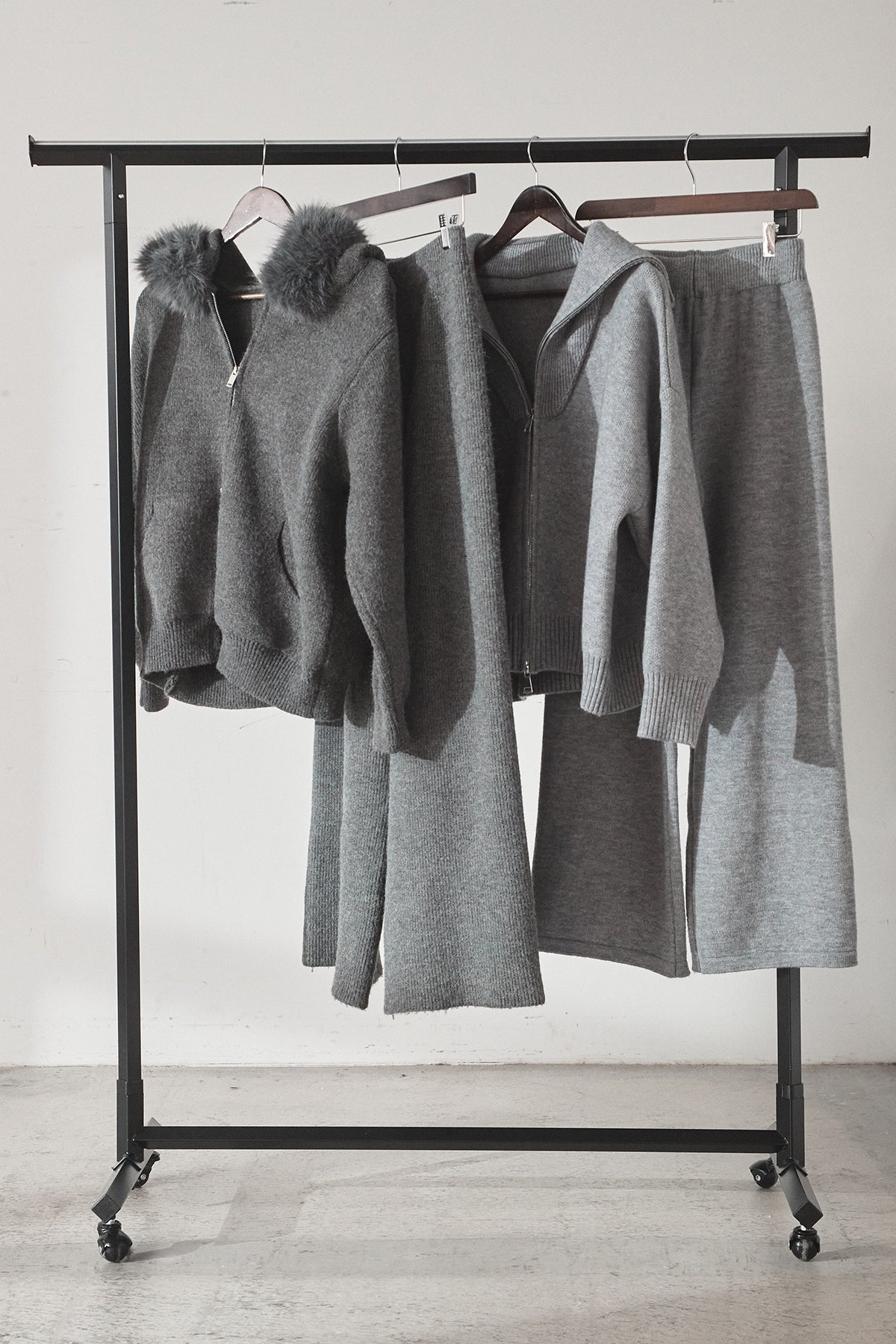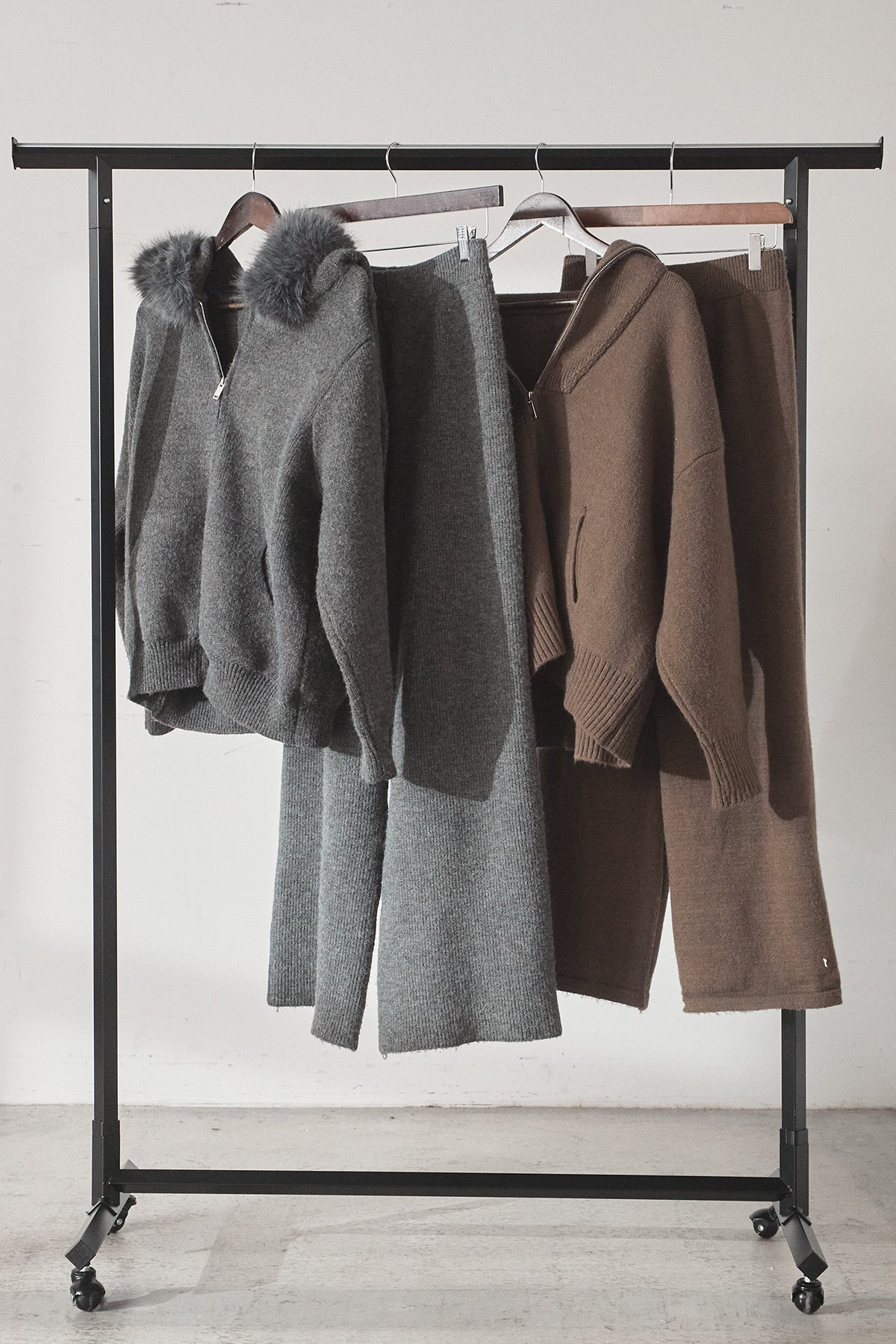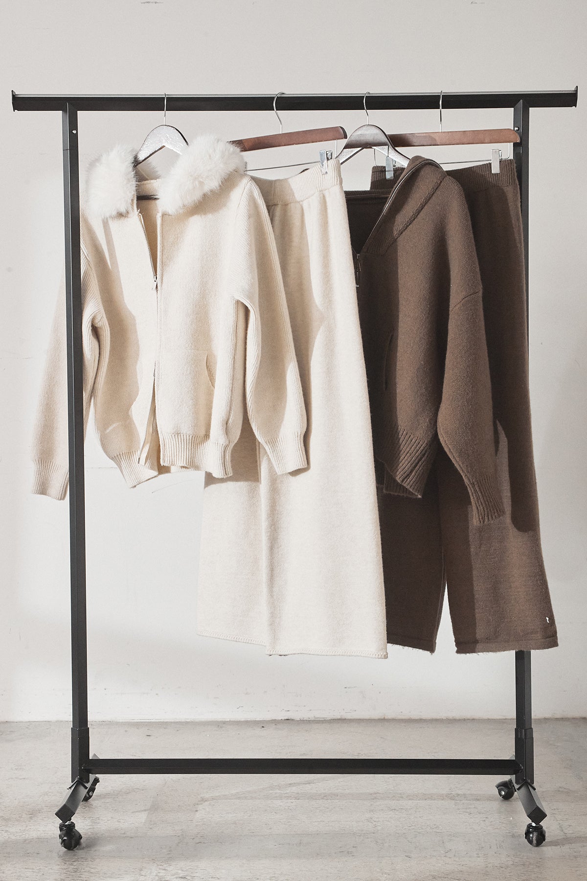 柔らかなニット素材に、フード部分のファーがアクセントになったセットアップ。ジップ仕様のフーディーは程よくゆとりのあるシルエットで、リラックス感がありながらも大人っぽい印象に仕上げています。ワイドシルエットのパンツと合わせることで、縦ラインが強調され、すっきりとしたバランスに。セットではもちろん、単品使いもしやすく、デイリーからお出かけまで幅広く活躍するアイテムです。