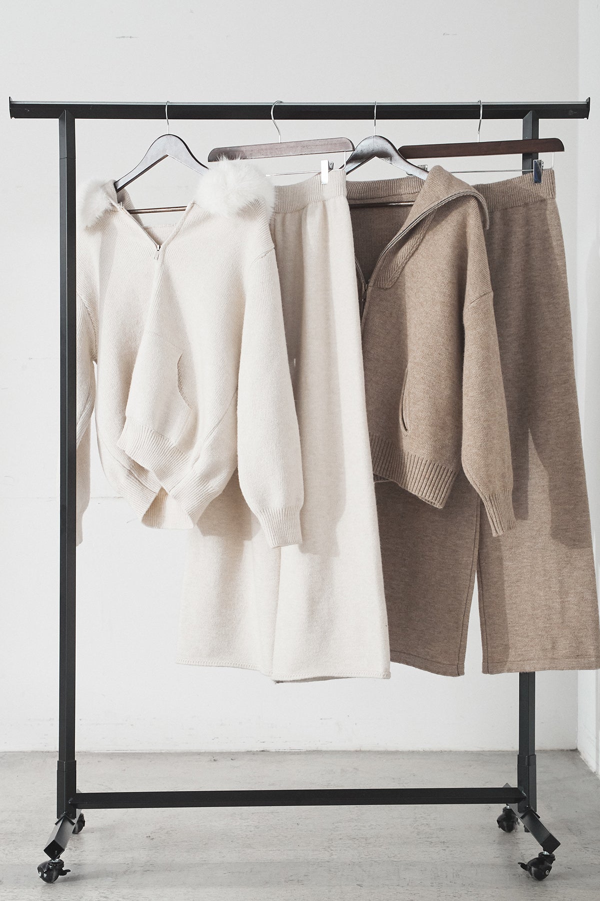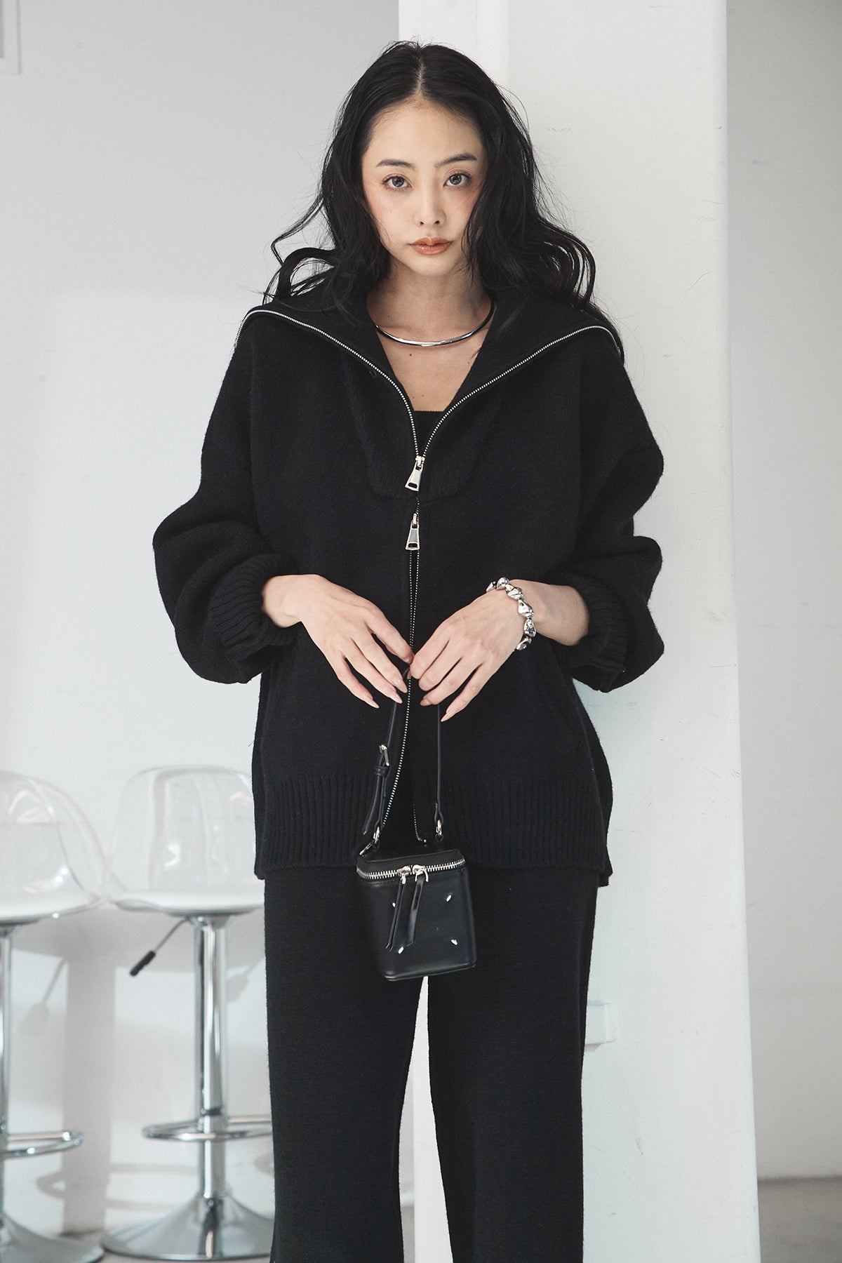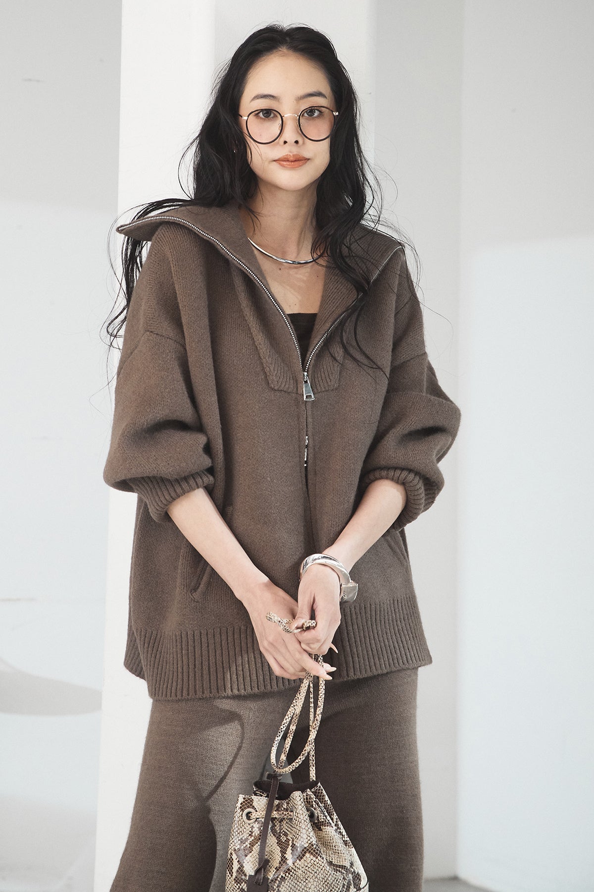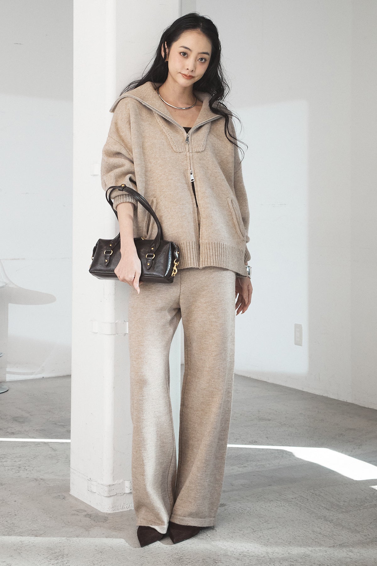 大きめのカラーが印象的な、ダブルジップ仕様のニットセットアップ。トップスはゆったりとしたシルエットで抜け感があり、ジップの開閉で表情の変化を楽しめます。パンツはすとんと落ちるラインで全体をすっきりとまとめ、リラックス感がありながらも上品な印象に。セットで着るだけでバランスよく決まり、単品使いでも幅広く活躍するアイテムです。