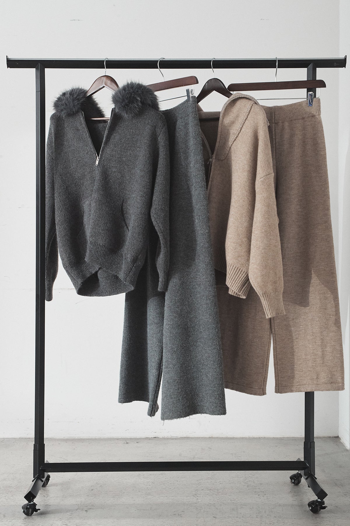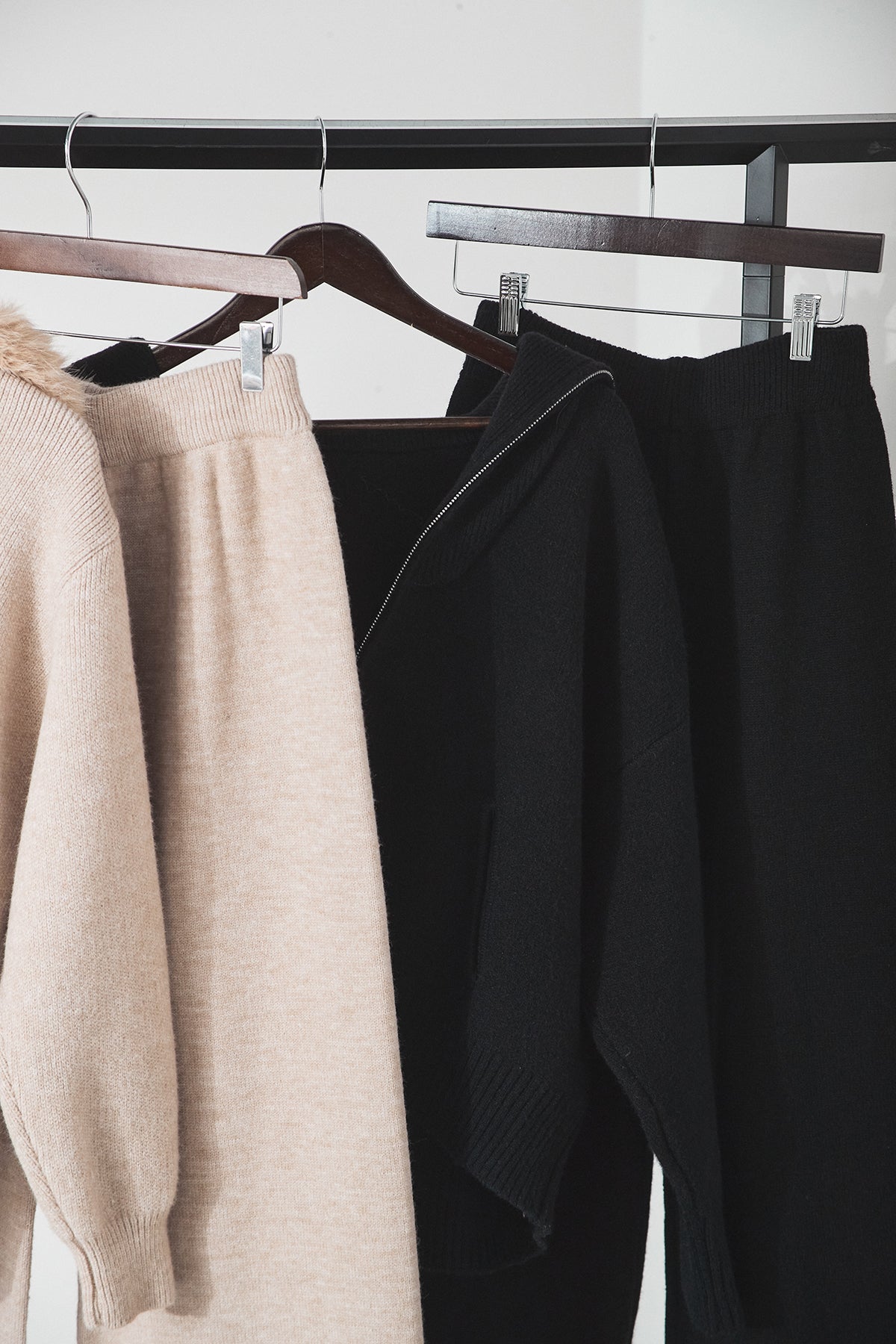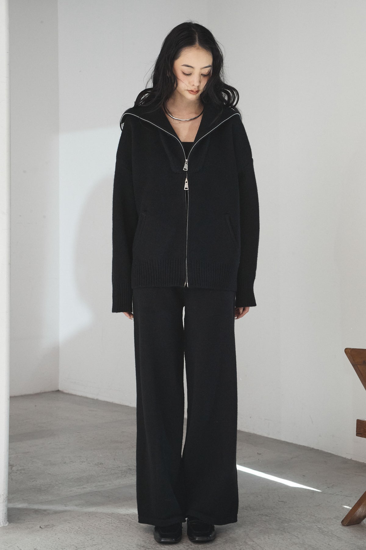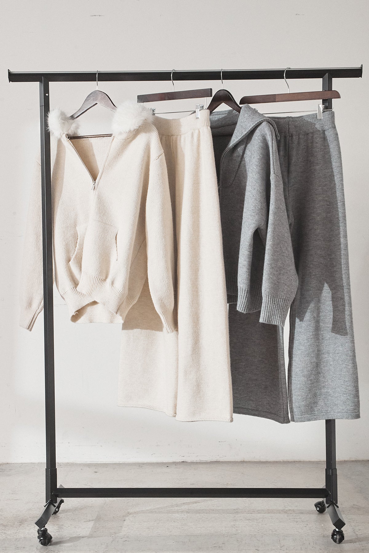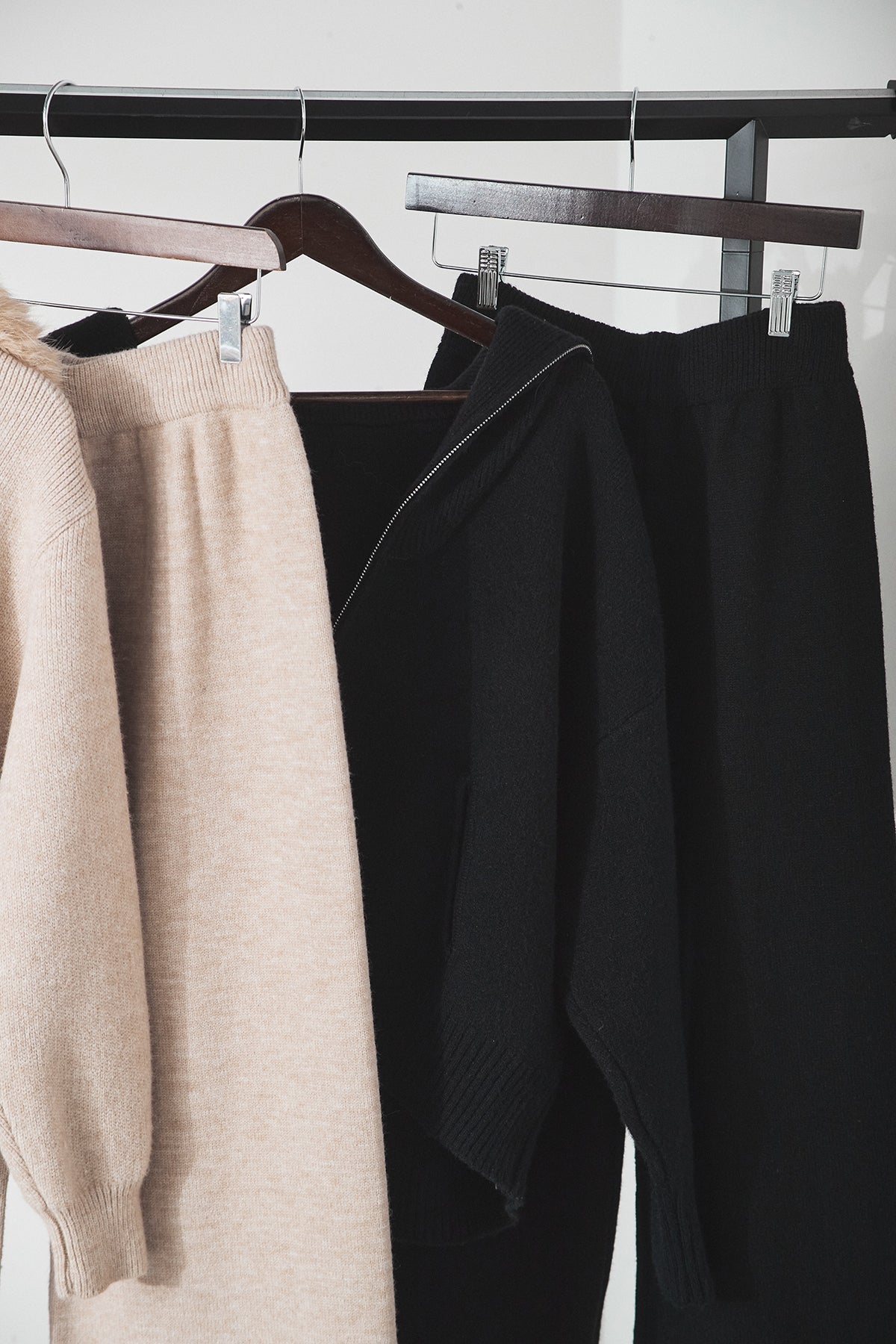 大きめのカラーが印象的な、ダブルジップ仕様のニットセットアップ。トップスはゆったりとしたシルエットで抜け感があり、ジップの開閉で表情の変化を楽しめます。パンツはすとんと落ちるラインで全体をすっきりとまとめ、リラックス感がありながらも上品な印象に。セットで着るだけでバランスよく決まり、単品使いでも幅広く活躍するアイテムです。